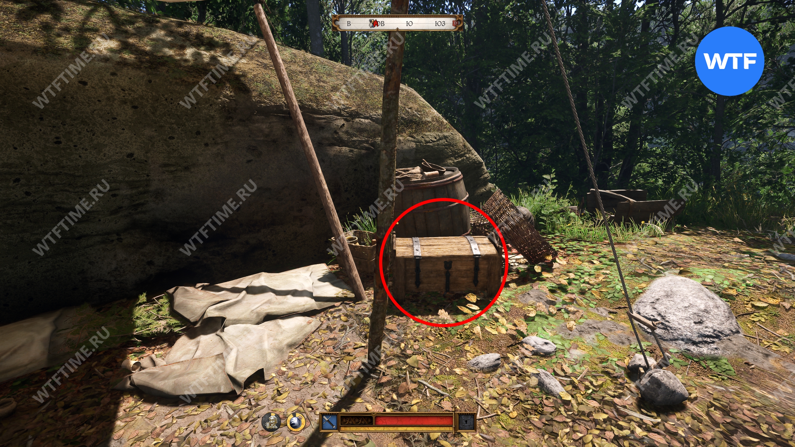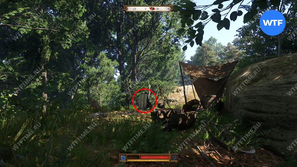 В этом лагере будет сидеть всего один противник и вы легко сможете зайти к нему со спины, незаметно подкравшись из кустов. Снаряжение у него так себе и, к сожалению, нет при себе ключей от сундука, стоящего рядом.