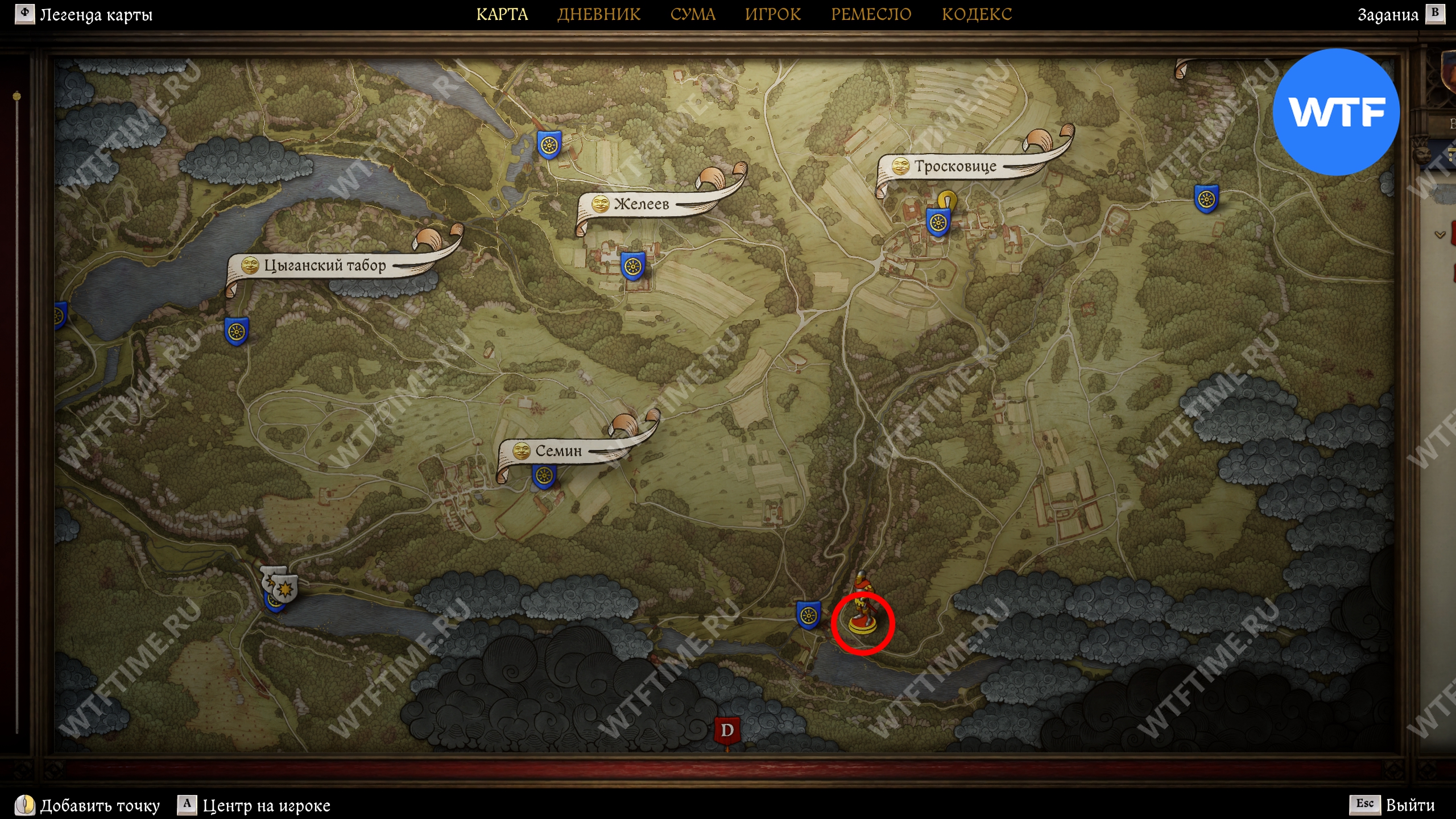 Изучив рисунок на карте, можно подумать, что сокровище находится во втором игровом регионе. Надпись Suchdol очень сбивает с толку, однако посмотрев на рисунок дорог, вы поймете, что искать надо в Тросках.