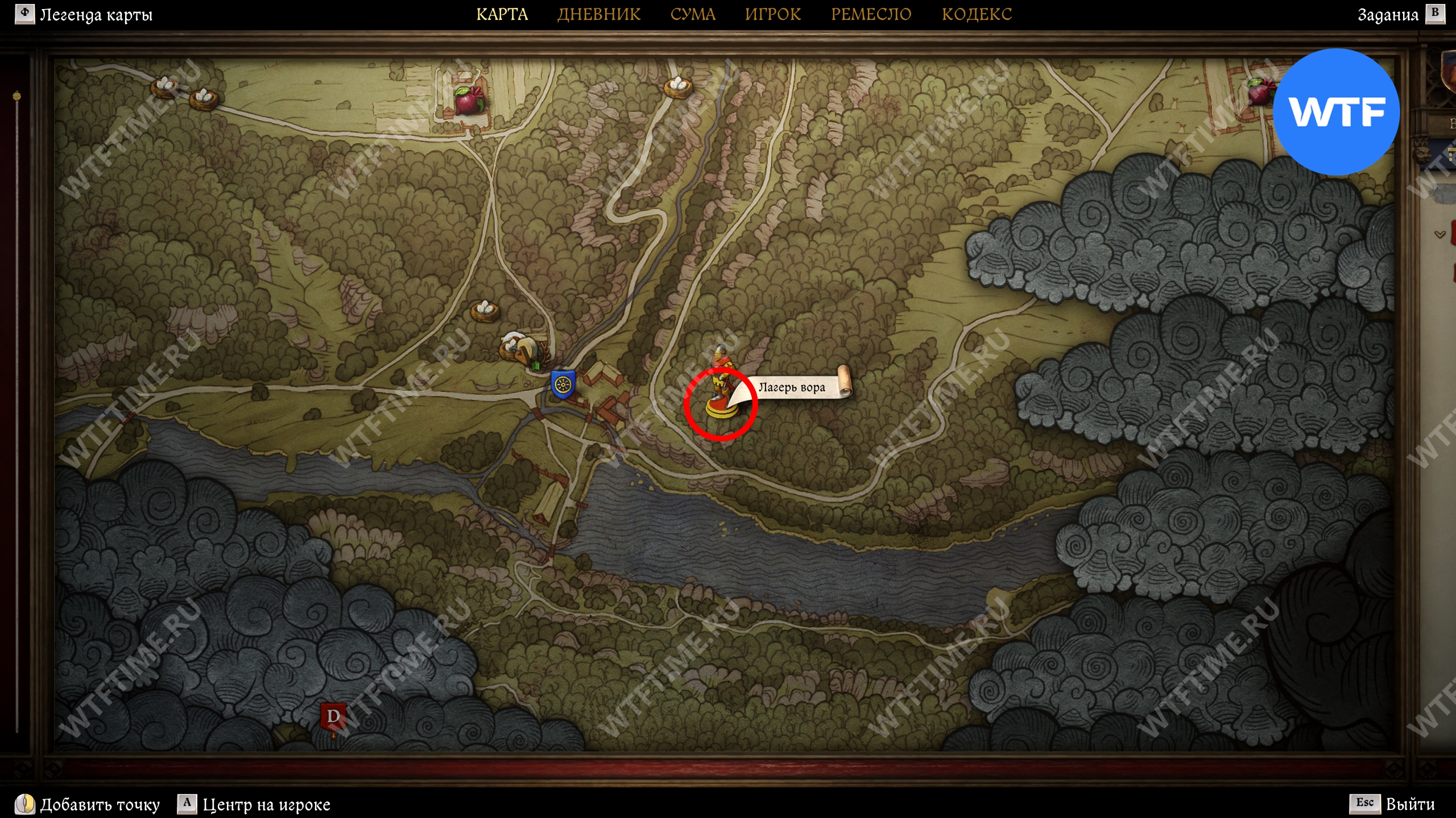 Нужное место можно найти в лесу к востоку от Небаковской мельницы. Когда подойдете почти вплотную, на карте появится точка интереса с названием «Лагерь вора».