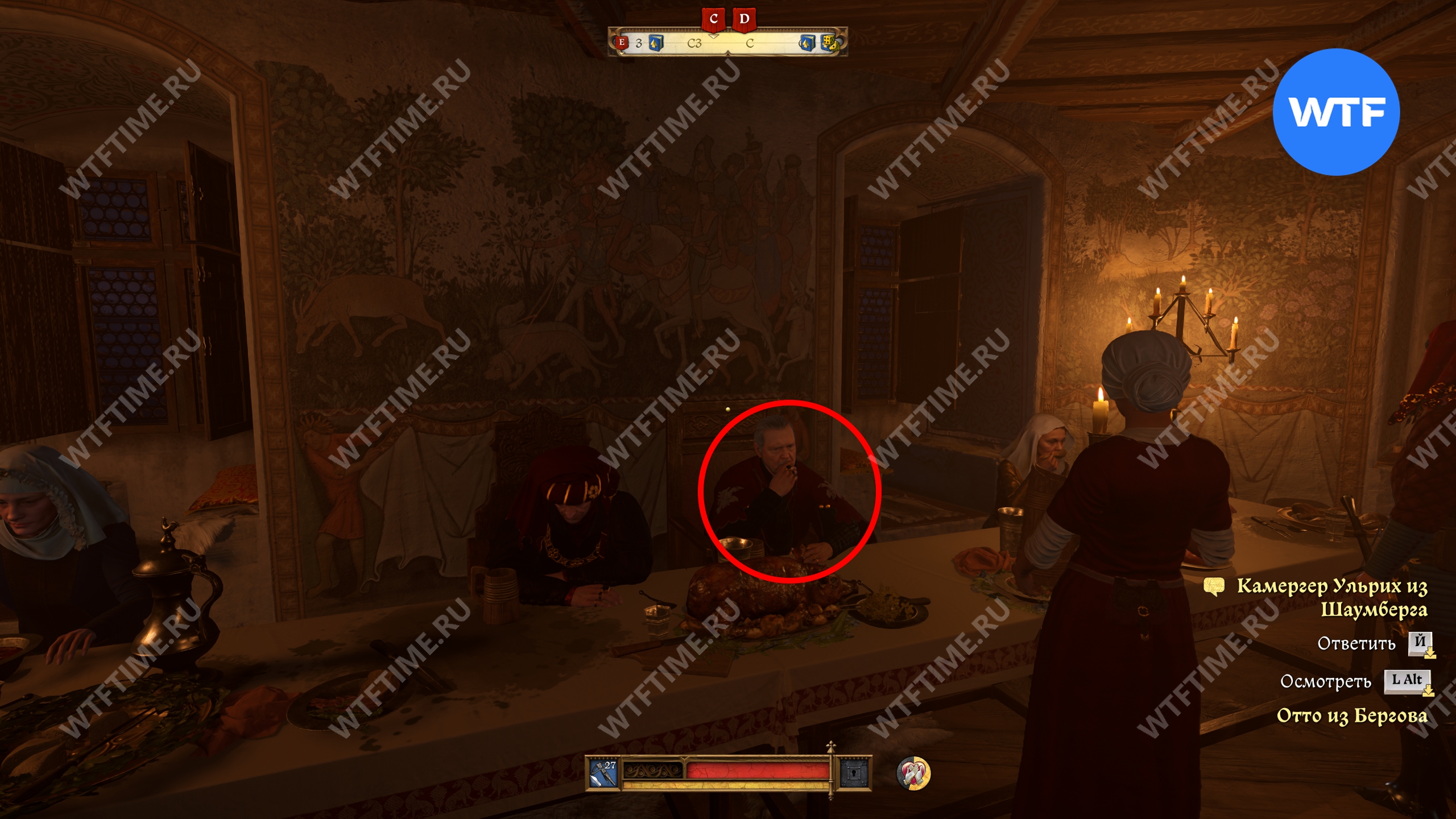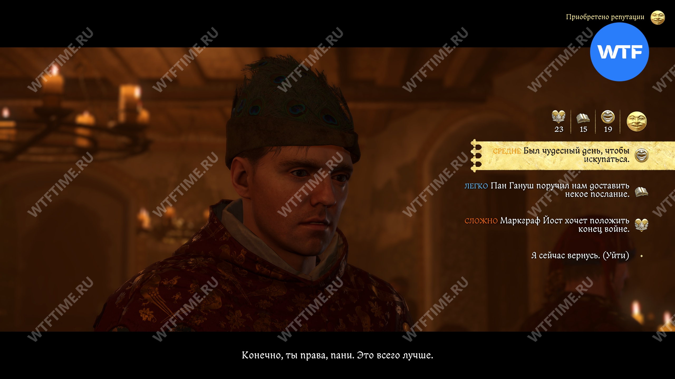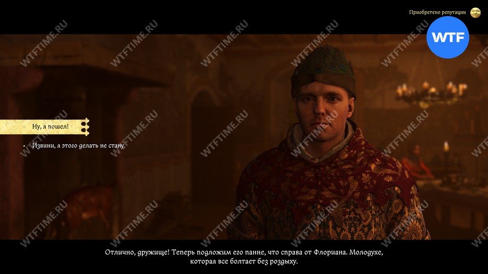 После этого вы отправитесь на пир, который начнется с разговора с паном Отто и его камергером. Чтобы получить лучшую репутацию, нужно будет пройти среднюю проверку убеждения, а затем заступиться за Птачека.