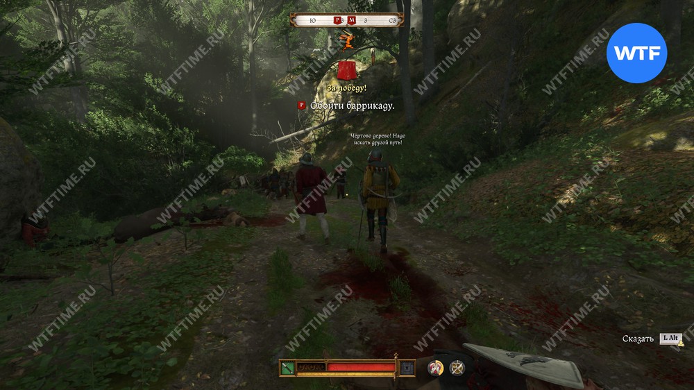 Продолжайте двигаться вперед по дороге и через некоторое время Ян остановится у поваленного дерева, прикрываясь щитом. Просто подлезьте под деревом и продолжайте идти вперед, расчищая путь, и вскоре он к вам присоединится.