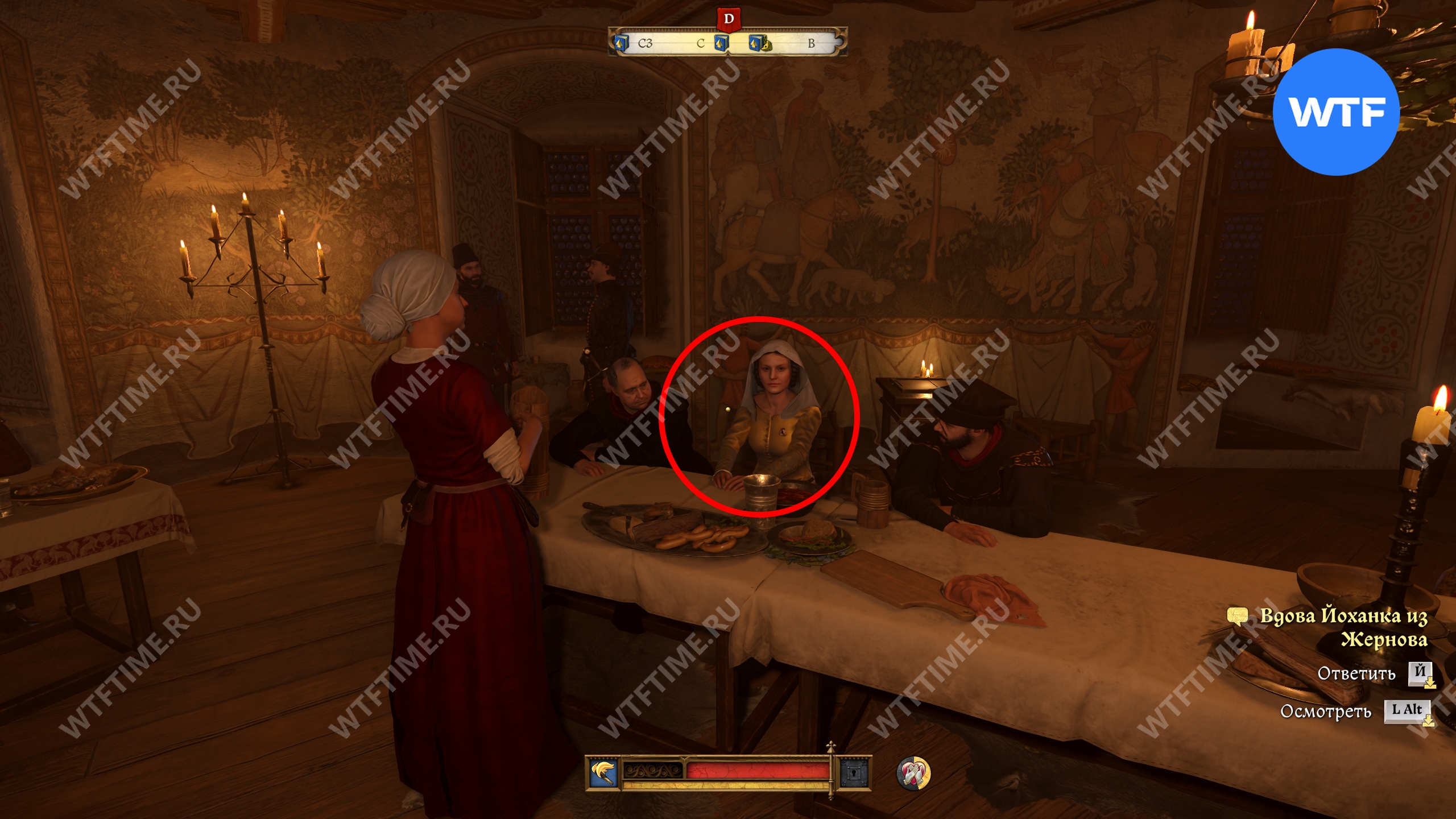 Теперь вы можете вернуться на пир и поговорить с вдовой Йоханкой Жерно. Если пройти среднюю проверку учености, а затем еще одну более легкую проверку, то сможете завести с ней роман.
