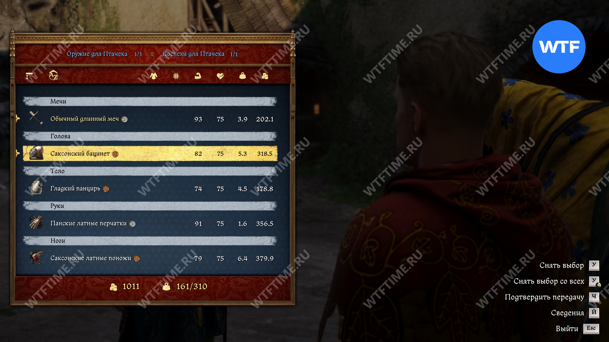 Утром отыщите Птачека во дворе и отдате ему доспехи, которые получили от Осины. На самом деле, достаточно дать только меч и бацинет, а остальное вы вполне можете оставить себе.