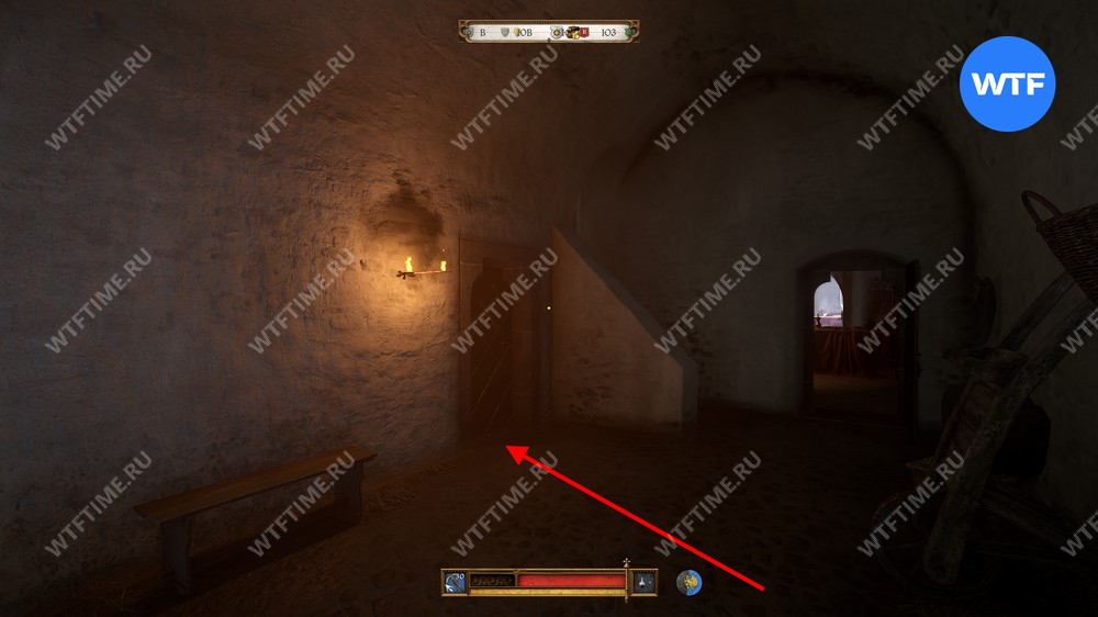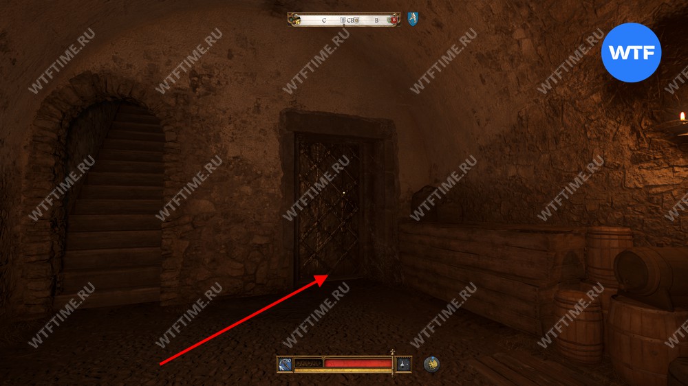 Спустившись вниз, сразу же посмотрите налево, чтобы найти железную дверь, запертую на очень сложный замок. К счастью, ключ от погреба, который мы нашли в доме Гинека, к ней подходит.