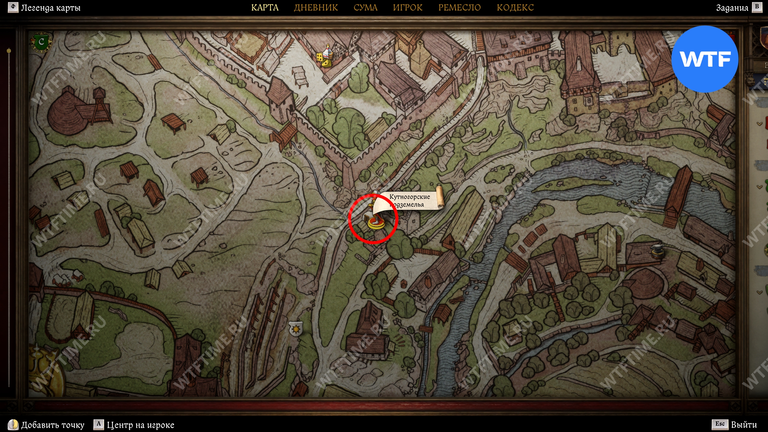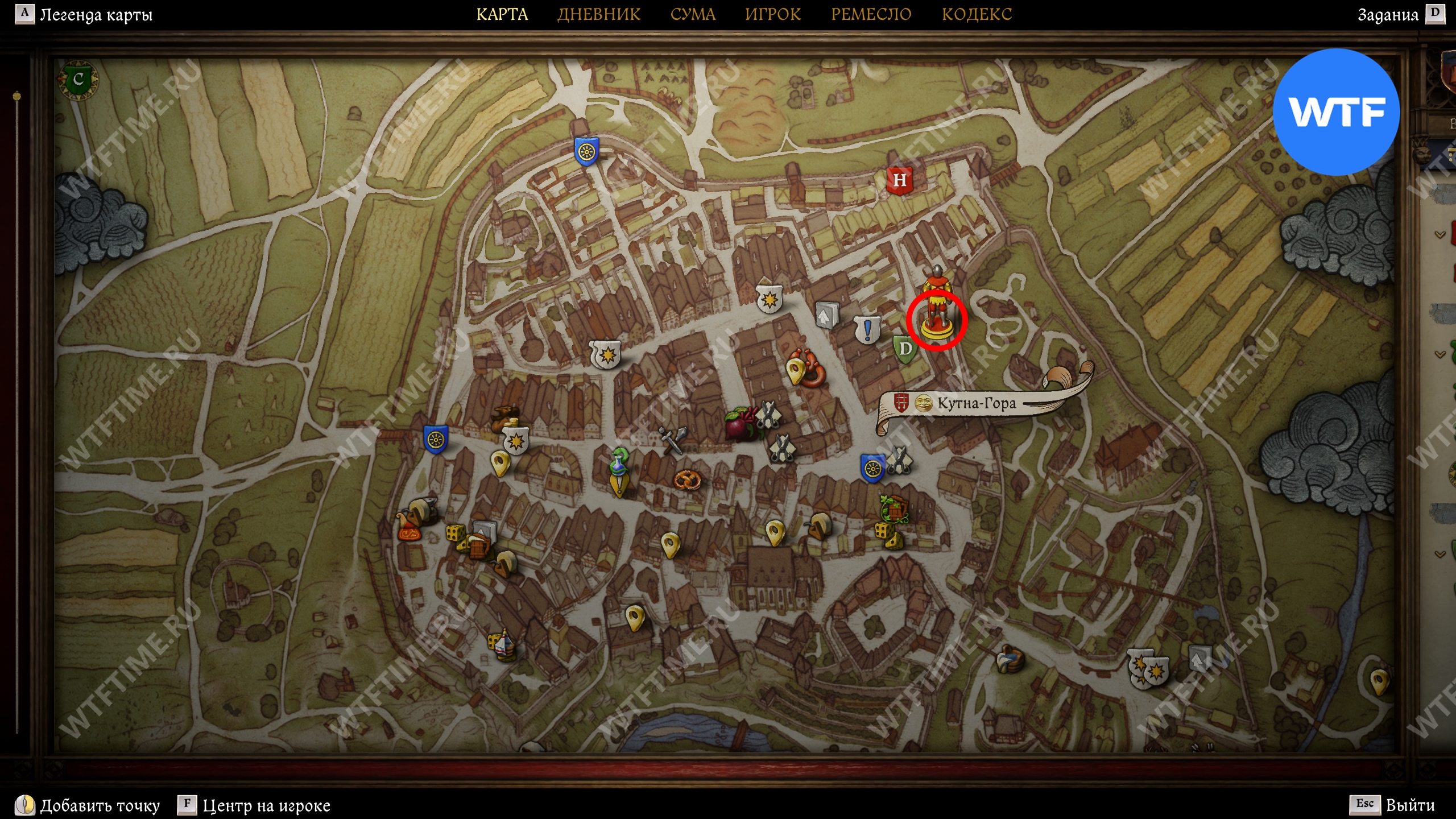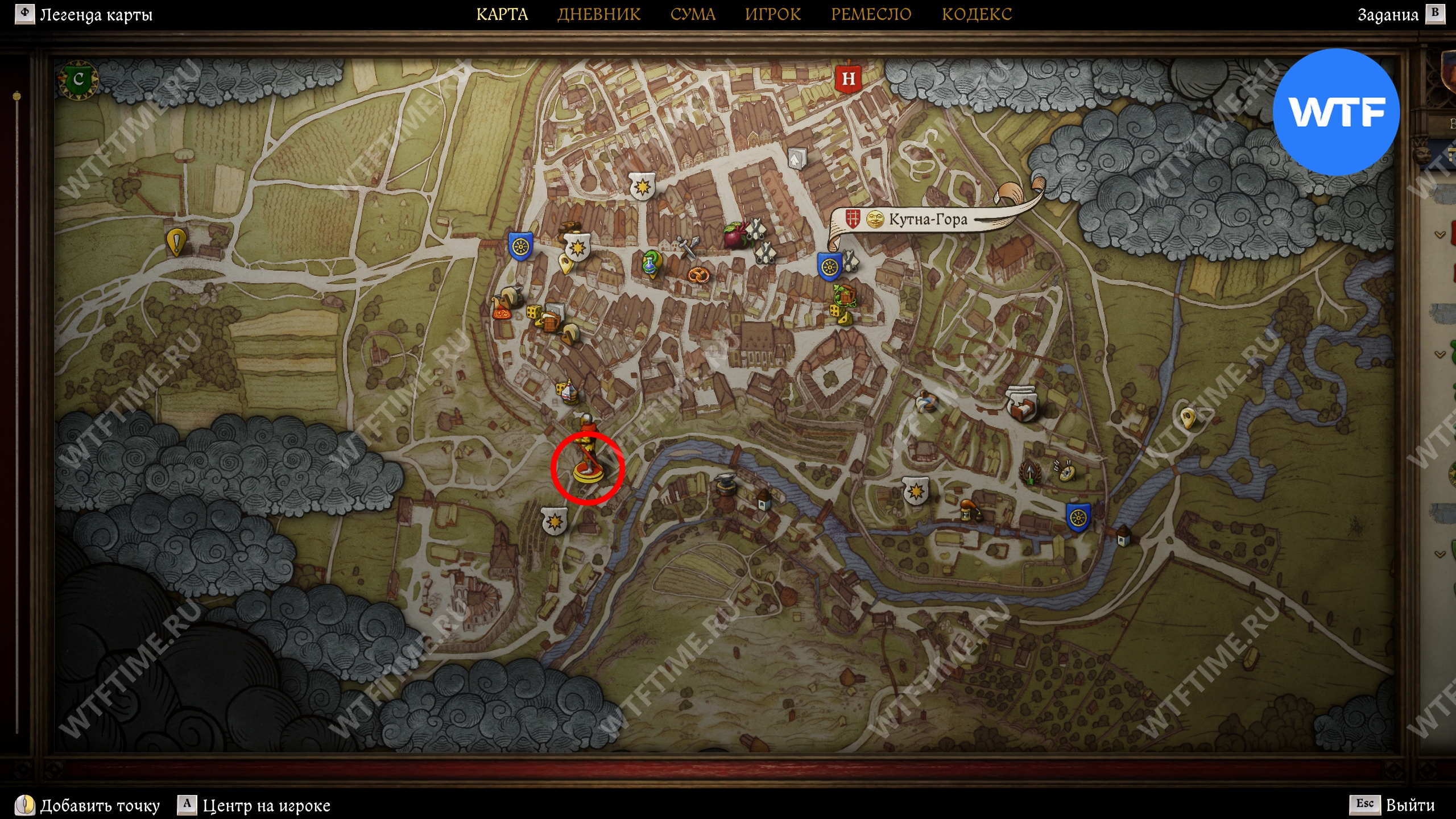 Прежде чем отправляться на поиски, давайте немного поговорим про саму карту. Нужный нам тайник на ней отмечен головой козла справа. Остальные отметки относятся к магазинам Кутна-Горы, из подвалов которых можно попасть вниз.