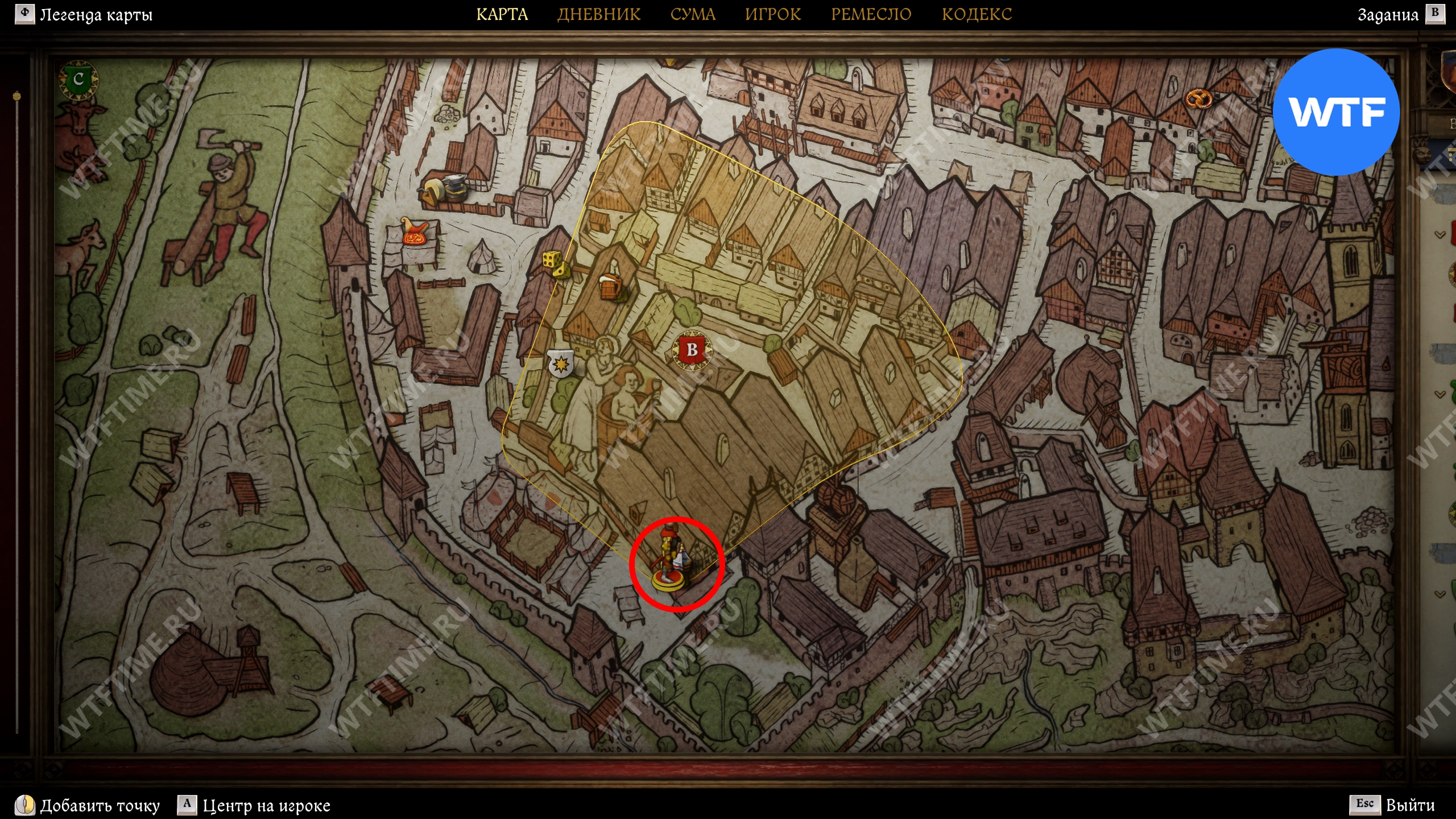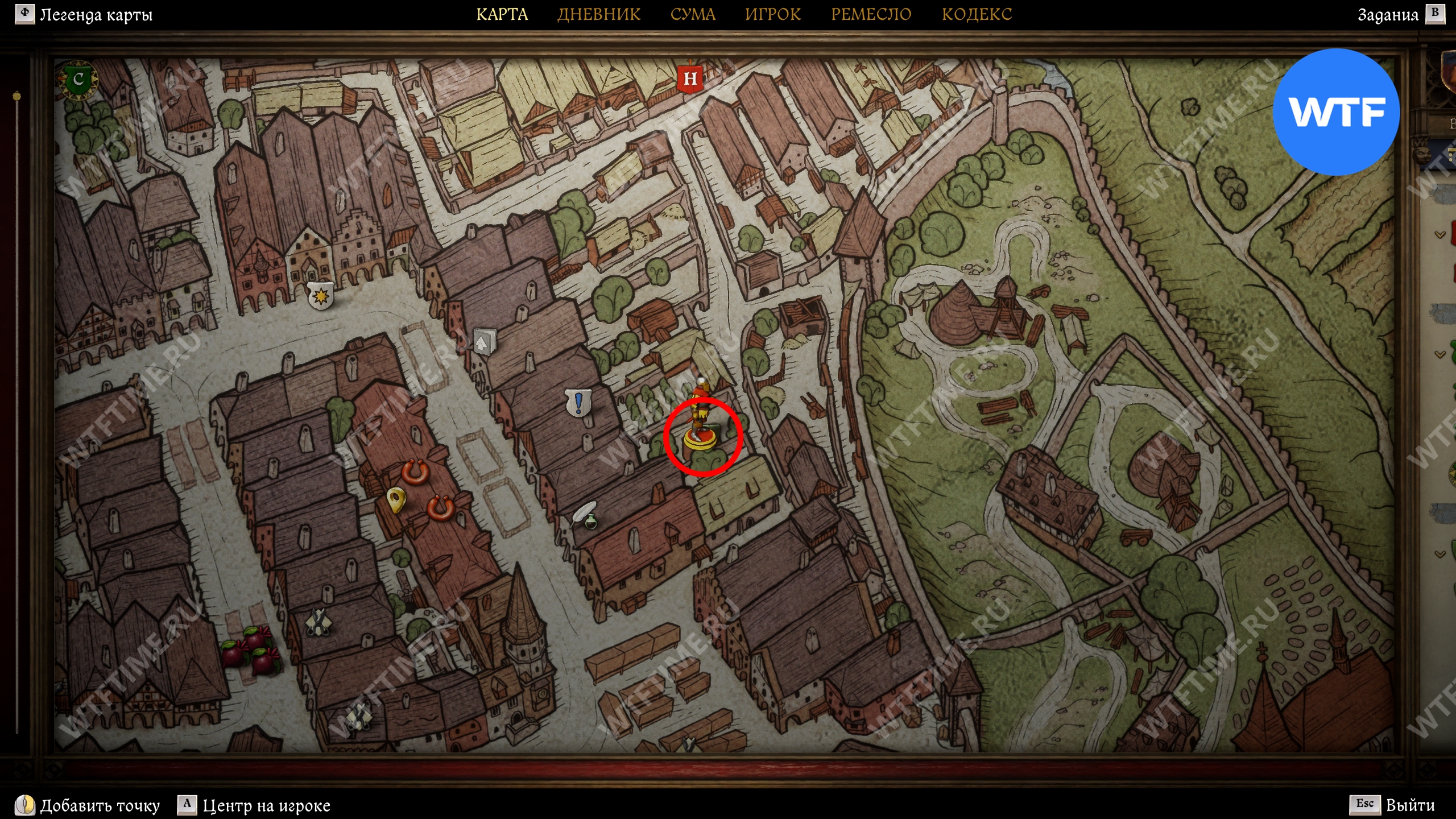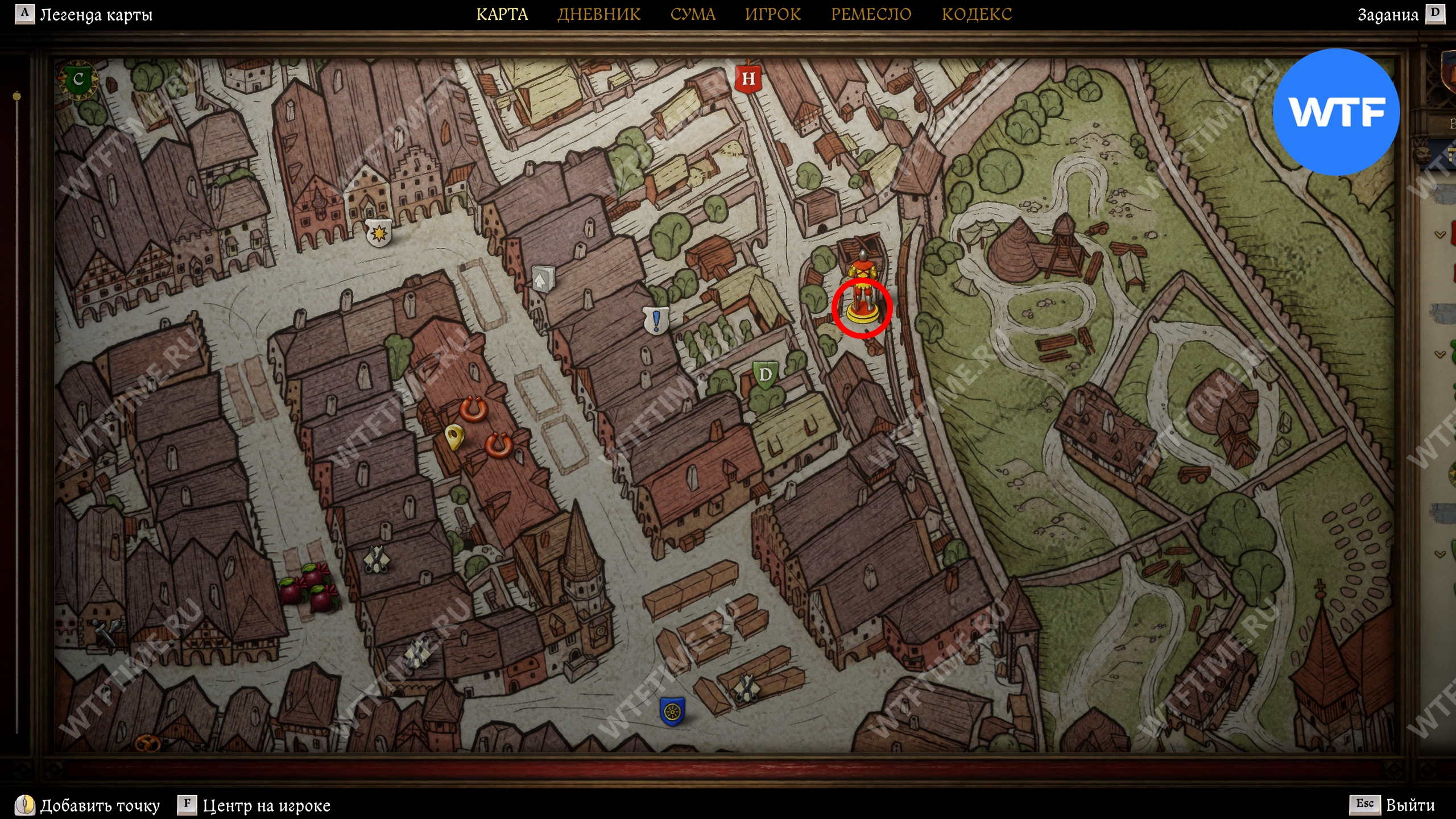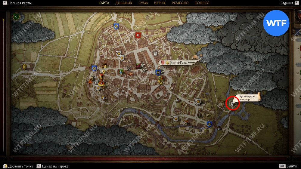 Прежде чем отправляться на поиски, давайте немного поговорим про саму карту. Нужный нам тайник на ней отмечен головой козла справа. Остальные отметки относятся к магазинам Кутна-Горы, из подвалов которых можно попасть вниз.