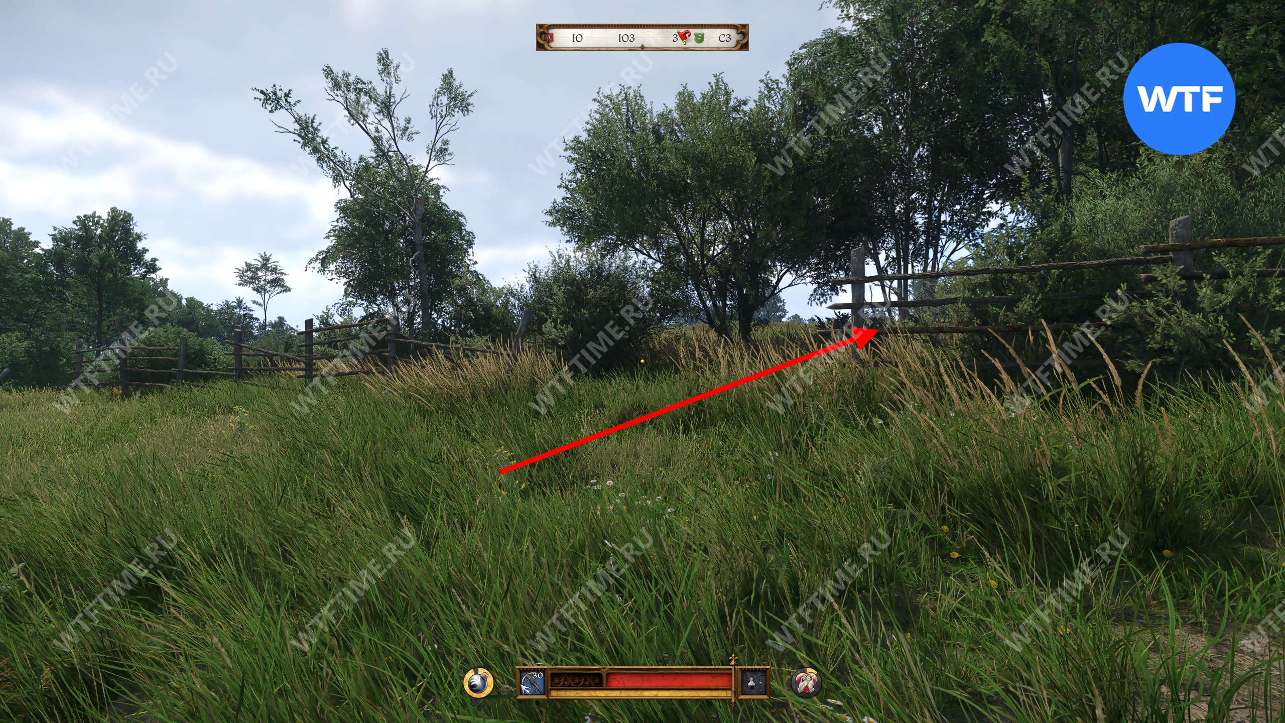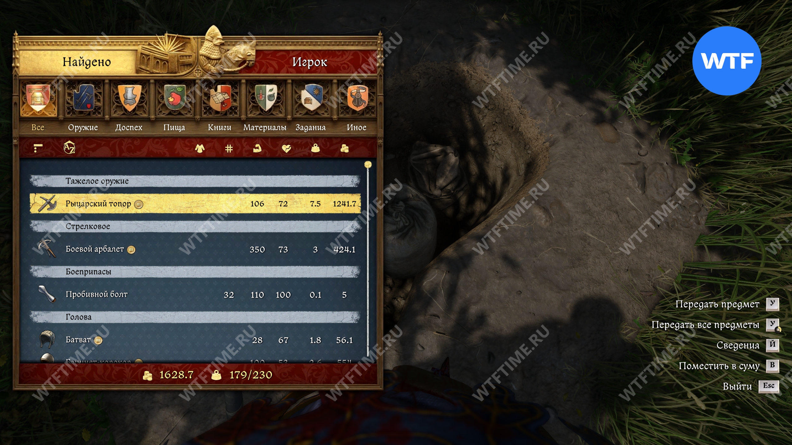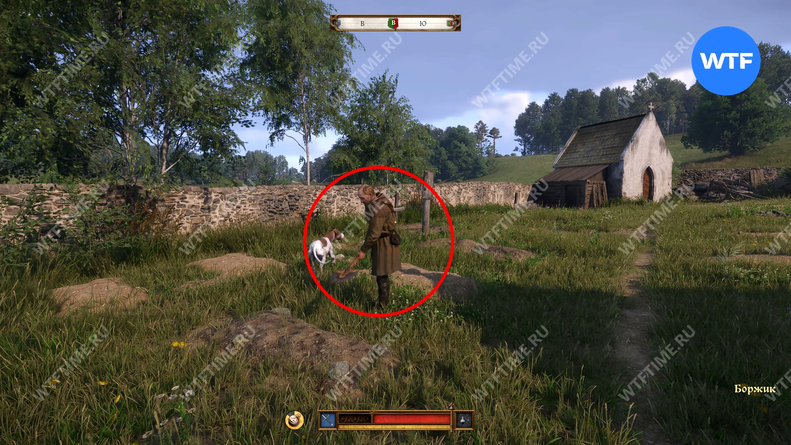Самый примерный ориентир со стороны луга — это дыра в деревянном заборе. Снаряжение Боржика закопано прямо за ней (см. скриншоты 2-3). Внутри вы найдете дорогой рыцарский топор, боевой арбалет с болтами и снаряжение среднего качества.