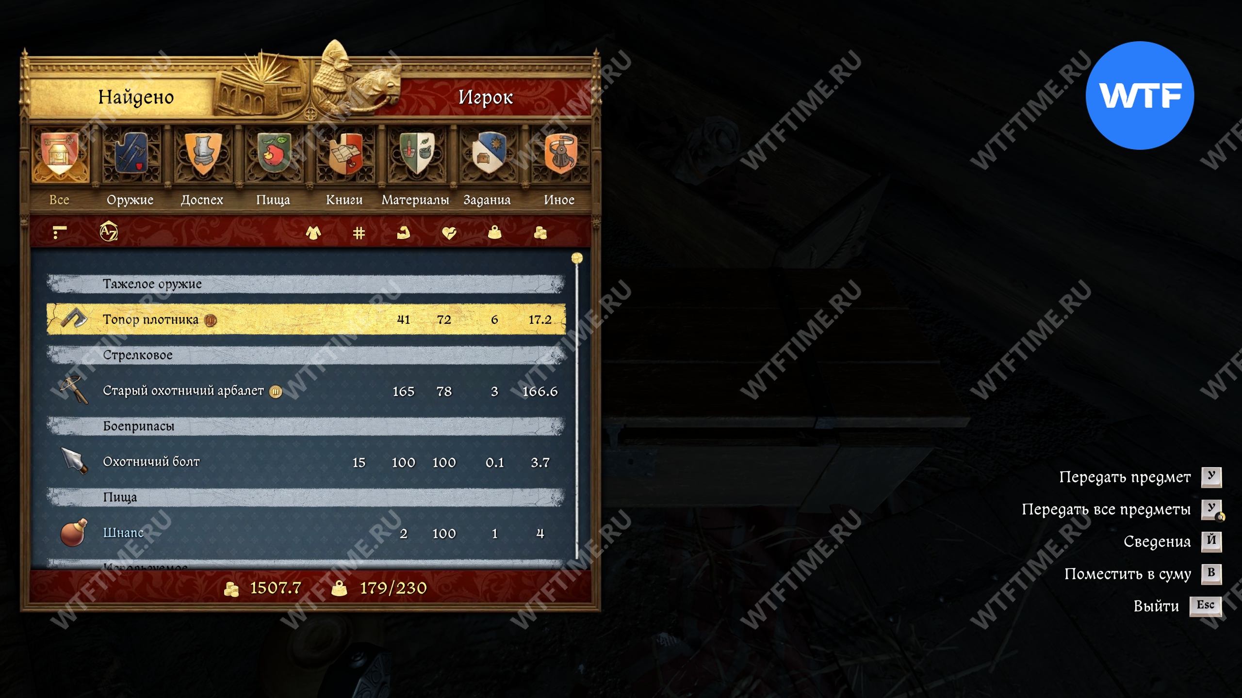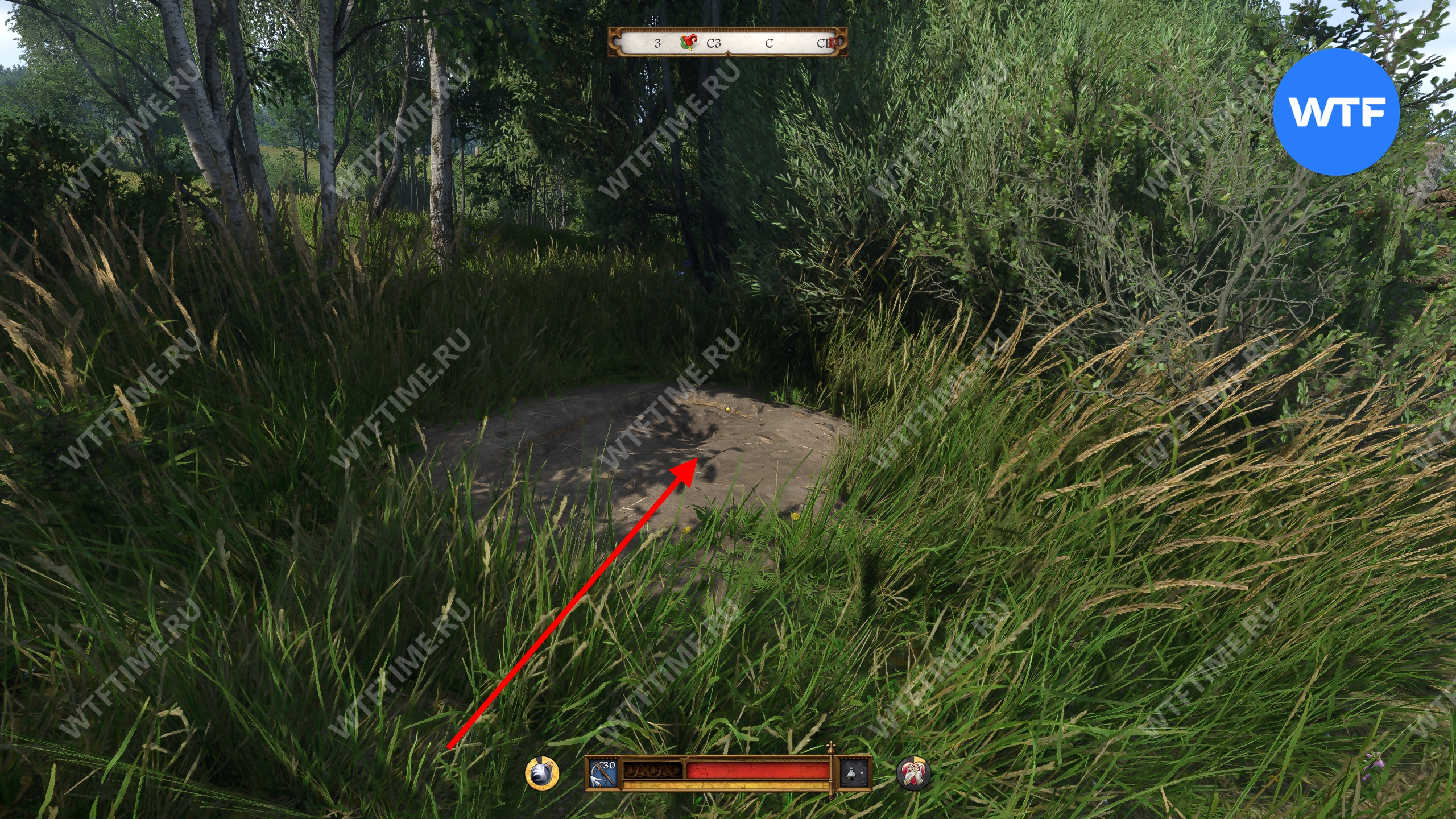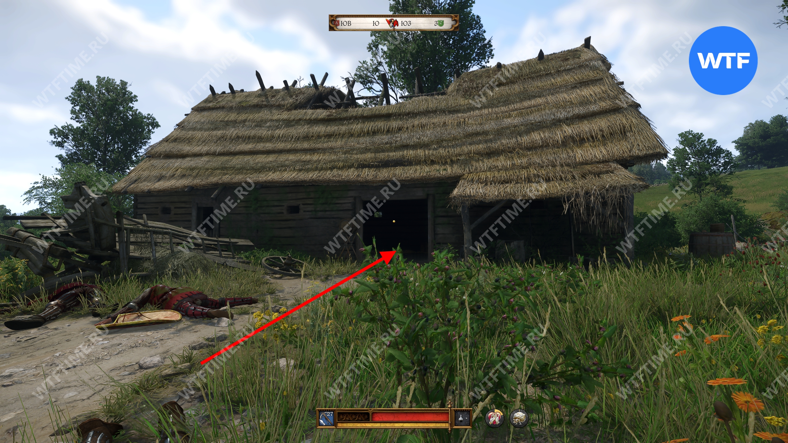 Самый примерный ориентир со стороны луга — это дыра в деревянном заборе. Снаряжение Боржика закопано прямо за ней (см. скриншоты 2-3). Внутри вы найдете дорогой рыцарский топор, боевой арбалет с болтами и снаряжение среднего качества.