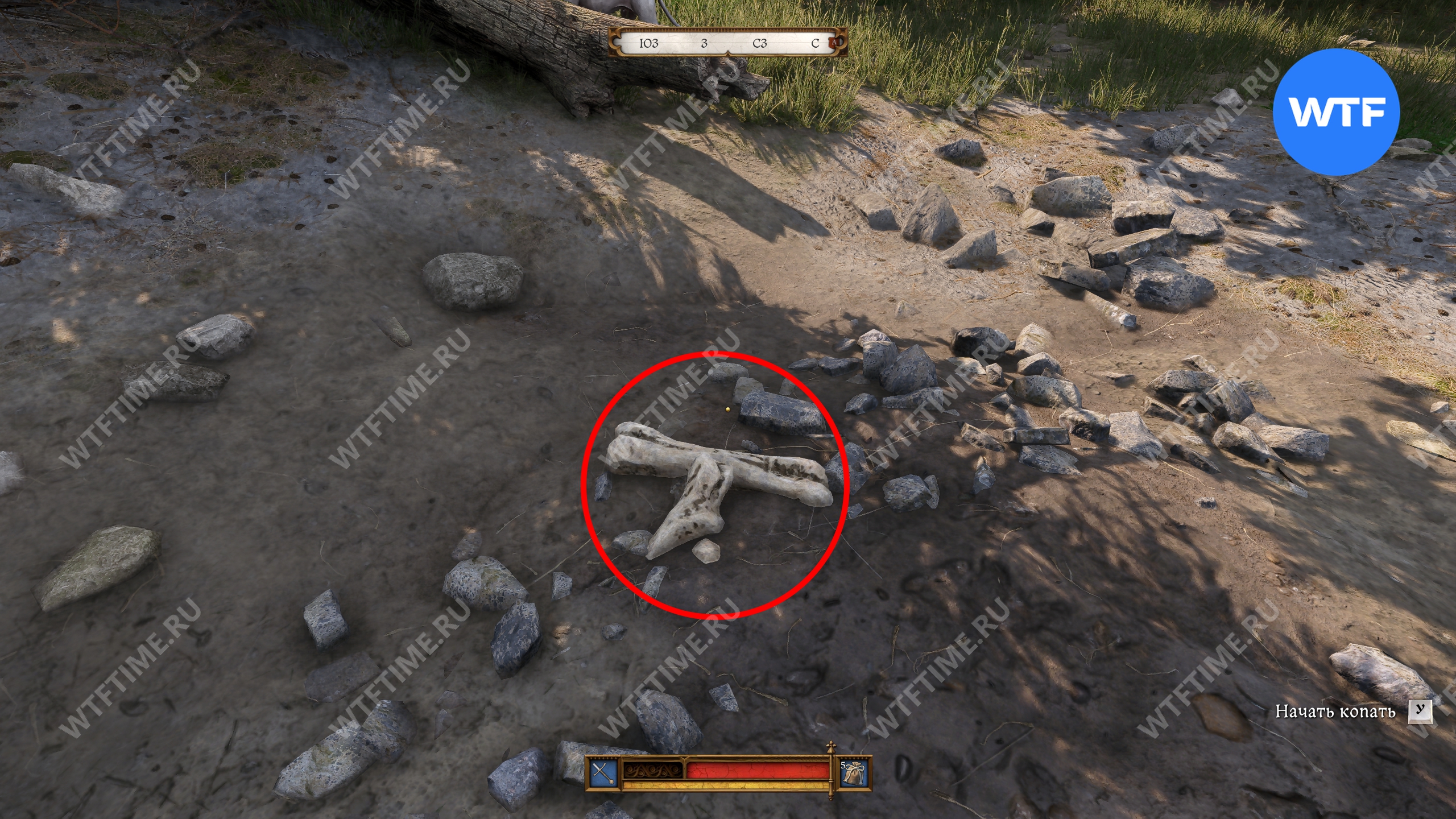Обратите внимание. Если костей на поляне нет, значит вы где-то замешкались с выполнением квеста и их просто успели выкопать до вас.