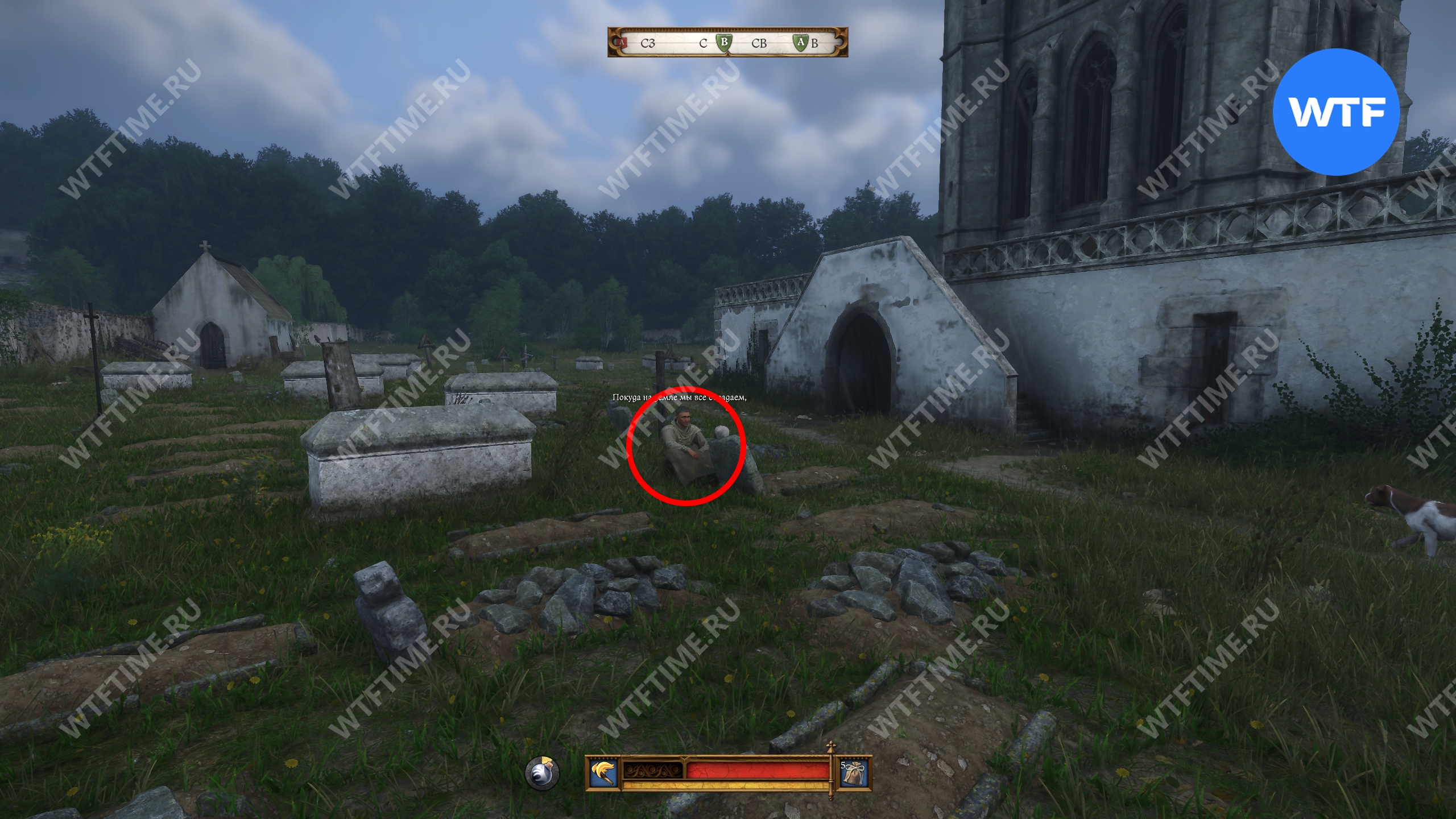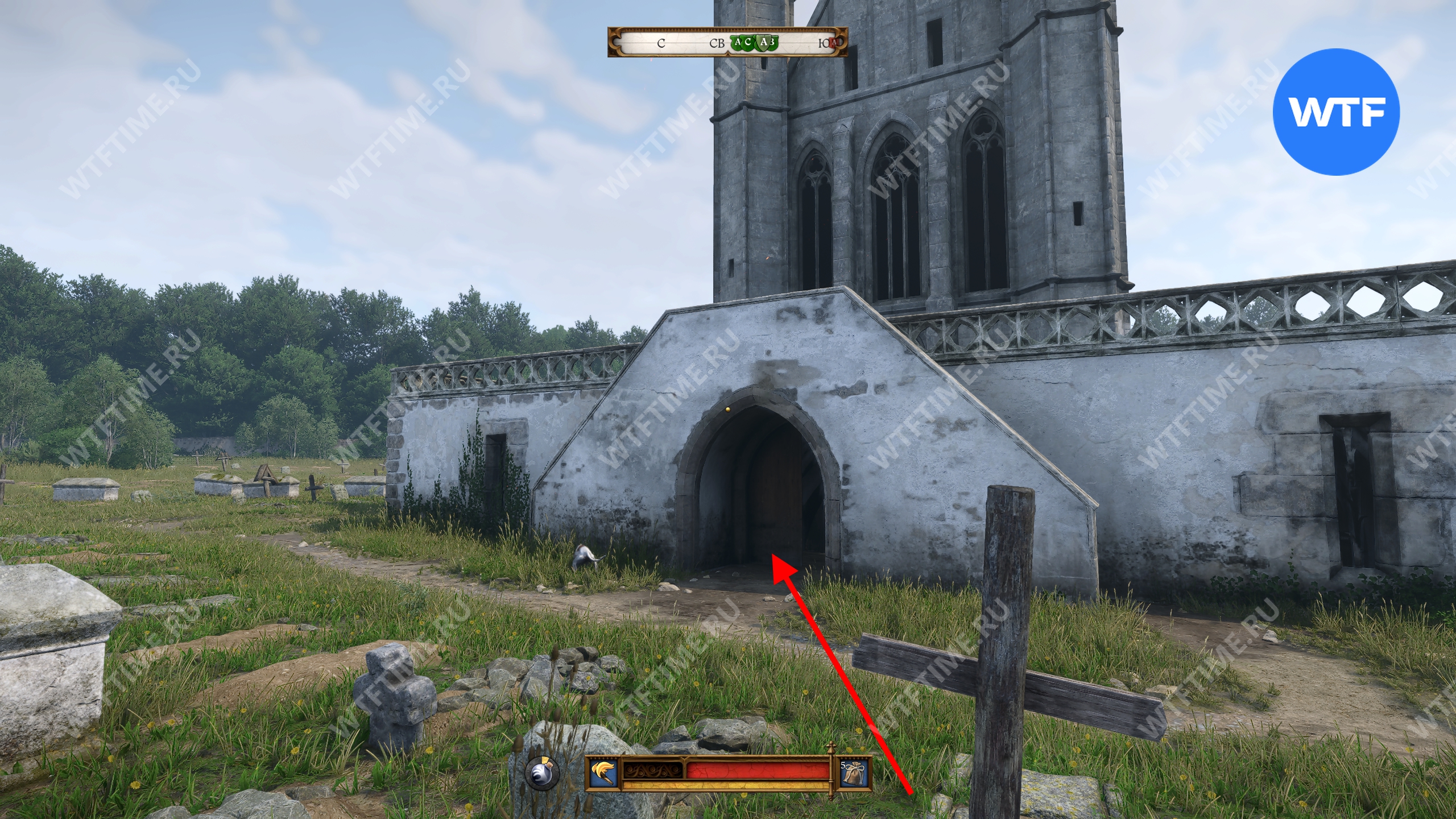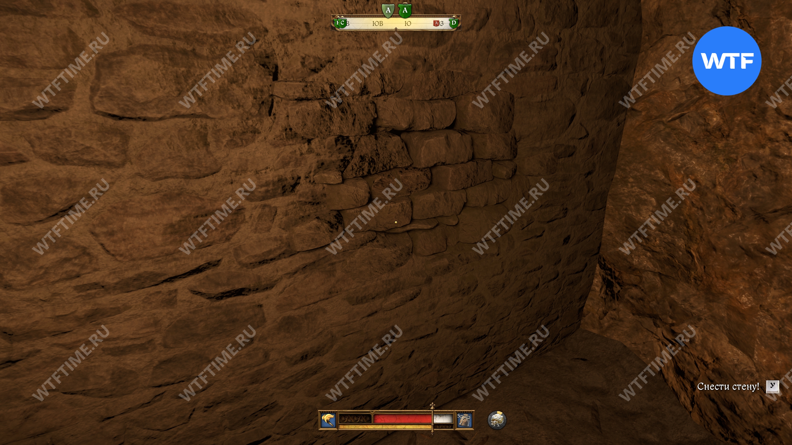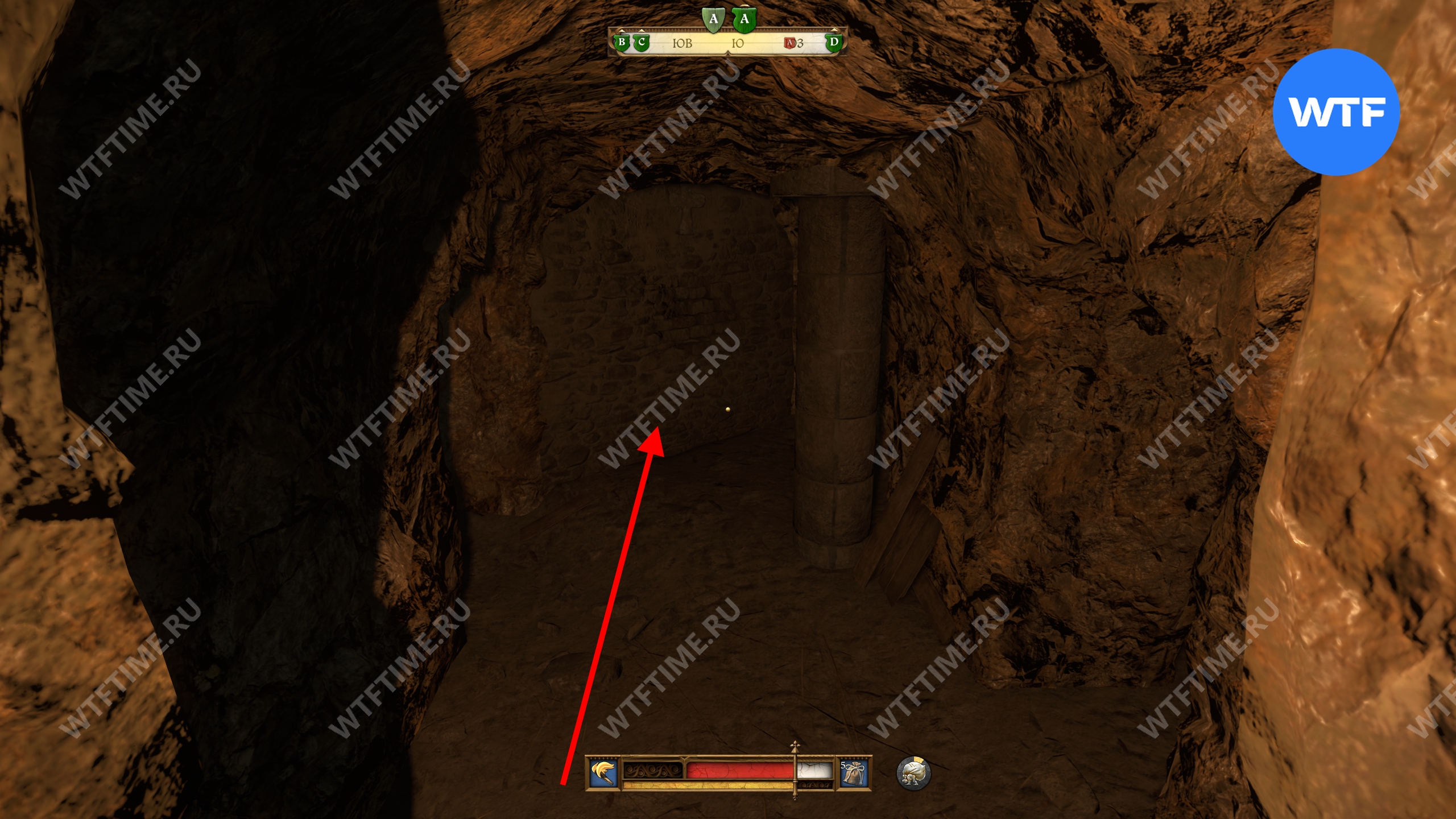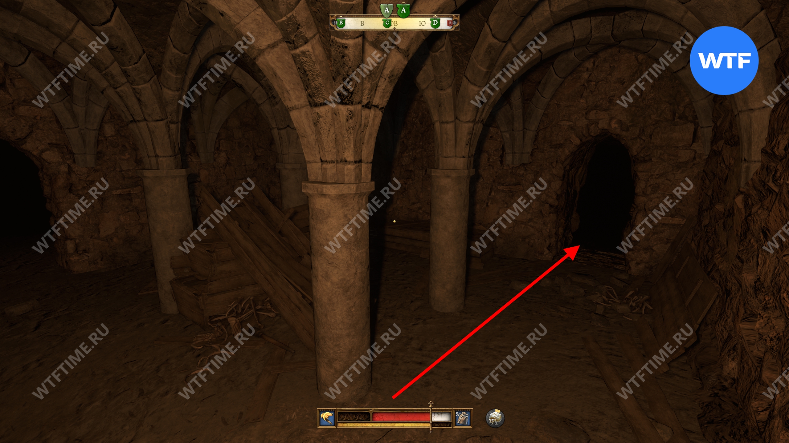 После взаимодействия с ним вы провалитесь прямиком в подземный склеп. Пройдите через правый проход перед вами вперед до конца и упретесь прямо в стену со свежей кладкой.