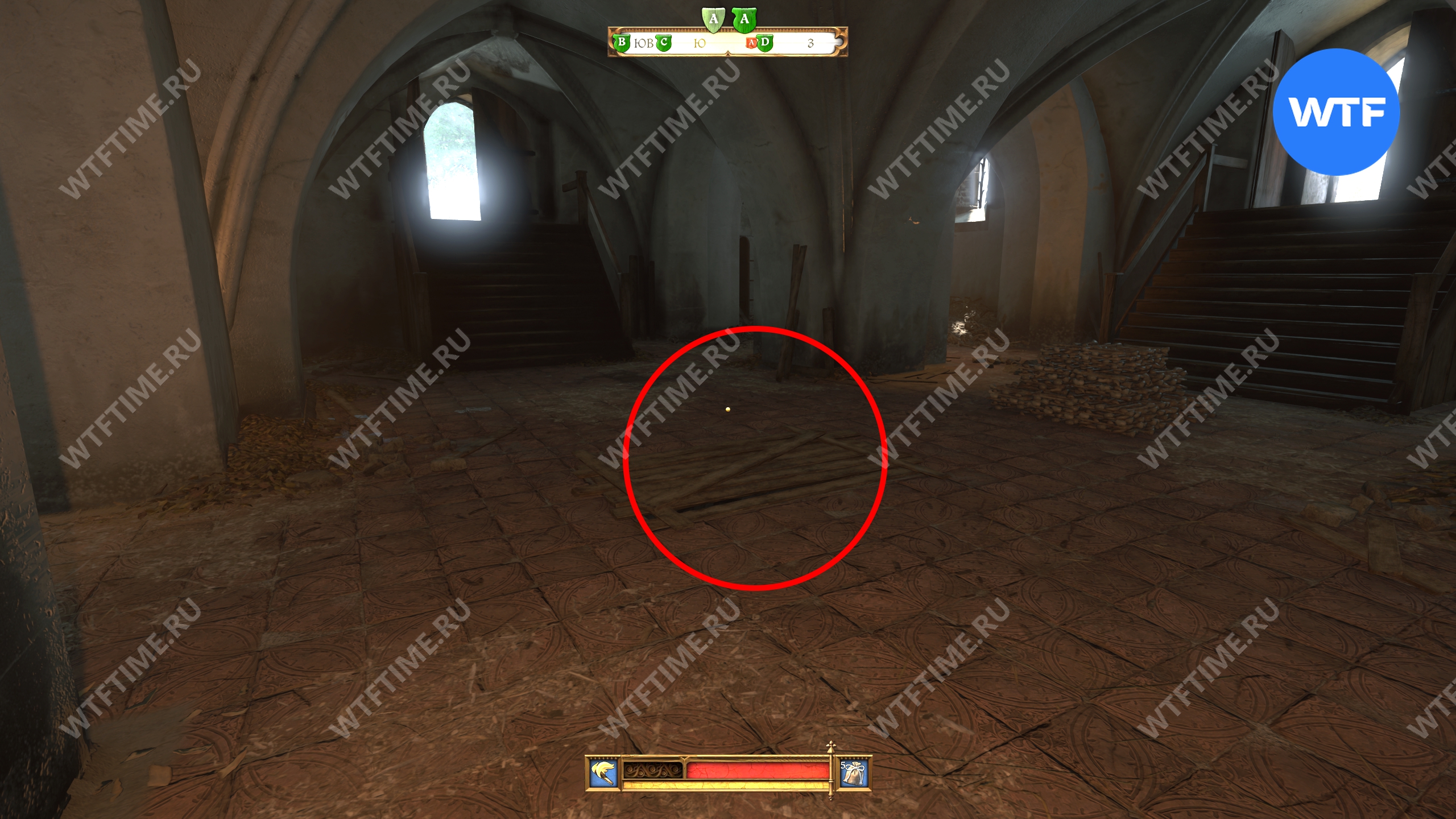 После разговора со слепым монахом войдите в костницу и следуйте целям квеста «Прах к праху». Когда закончите с уборкой костей на первом этаже, подойдите к люку в центре зала (см. скриншот 2).