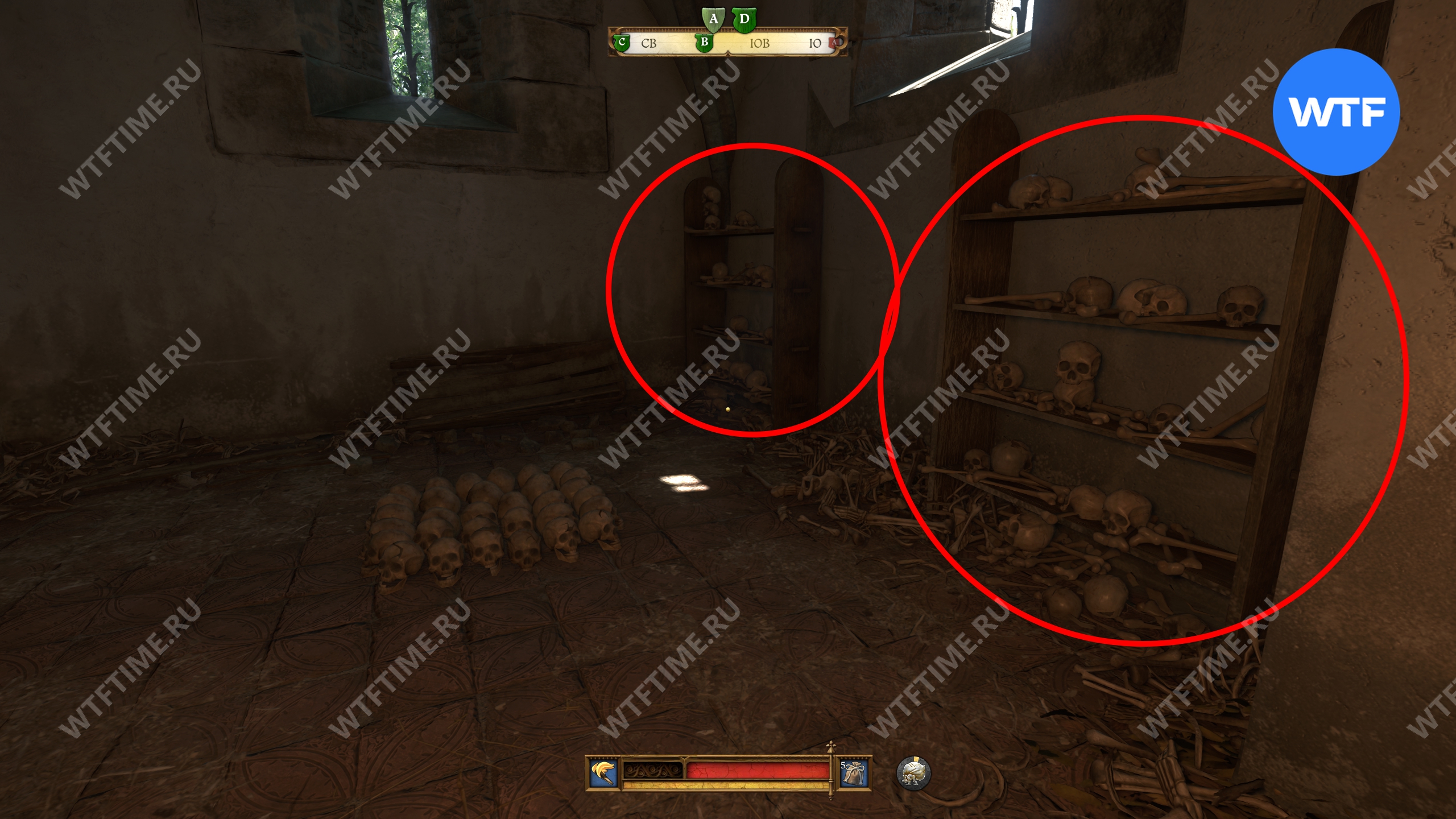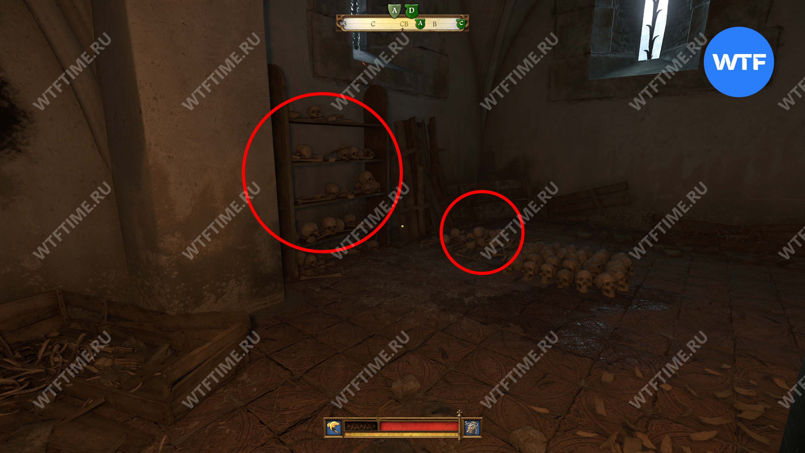 Зайдите в костницу и принимайте за уборку. Кости здесь разбросаны буквально повсюду. К счастью, собирать мы их будем кучками, а не по одной. Часть лежит вперемешку на полу, а еще часть — на стеллажах по углам комнаты.