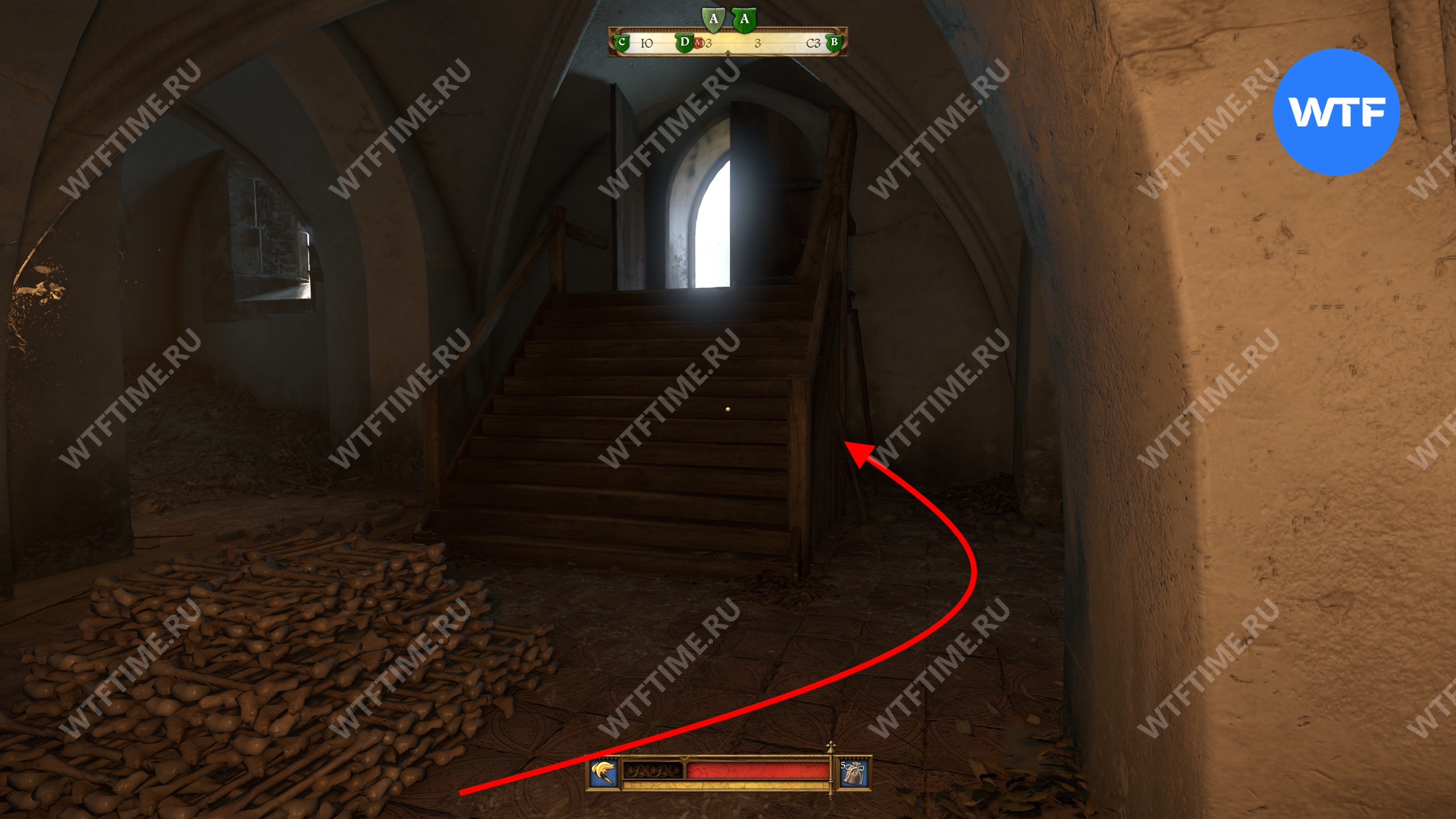 Также рекомендуем заглянуть в небольшую нишу, хорошо спрятанную за одной из лестниц. Там вы найдете скелета, в руках которого лежит книга знаний «Пир мертвецов».