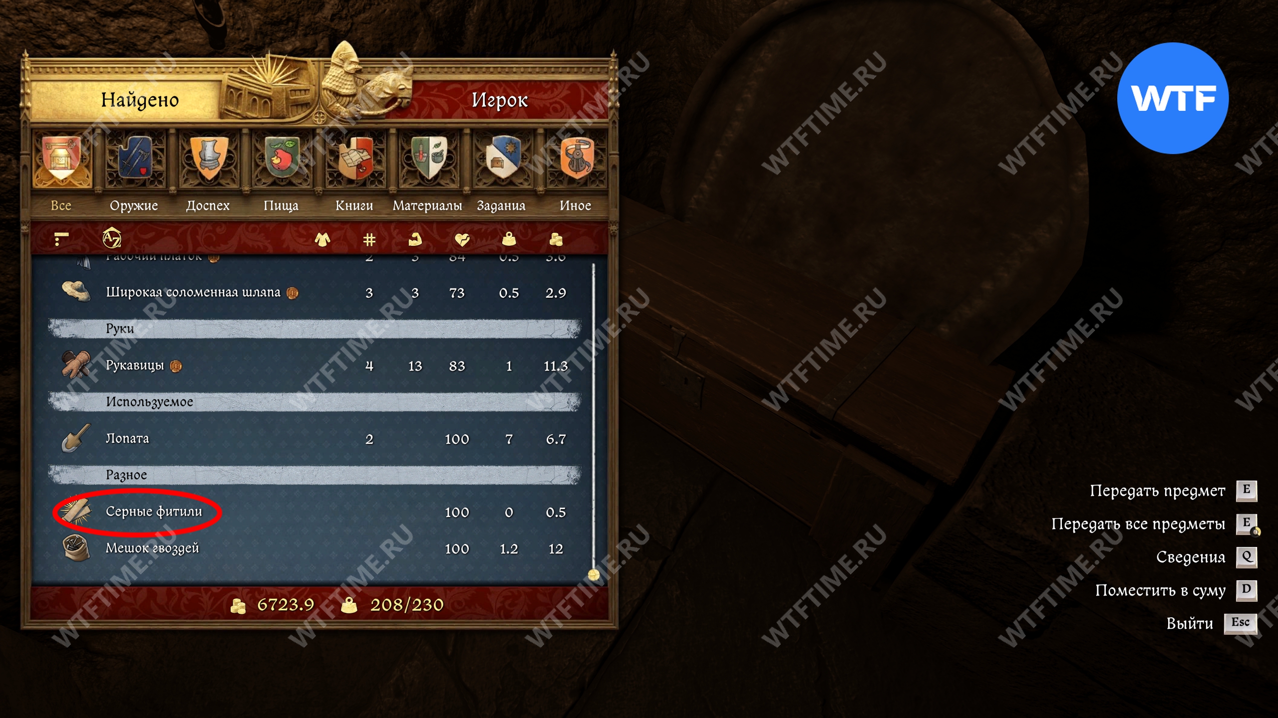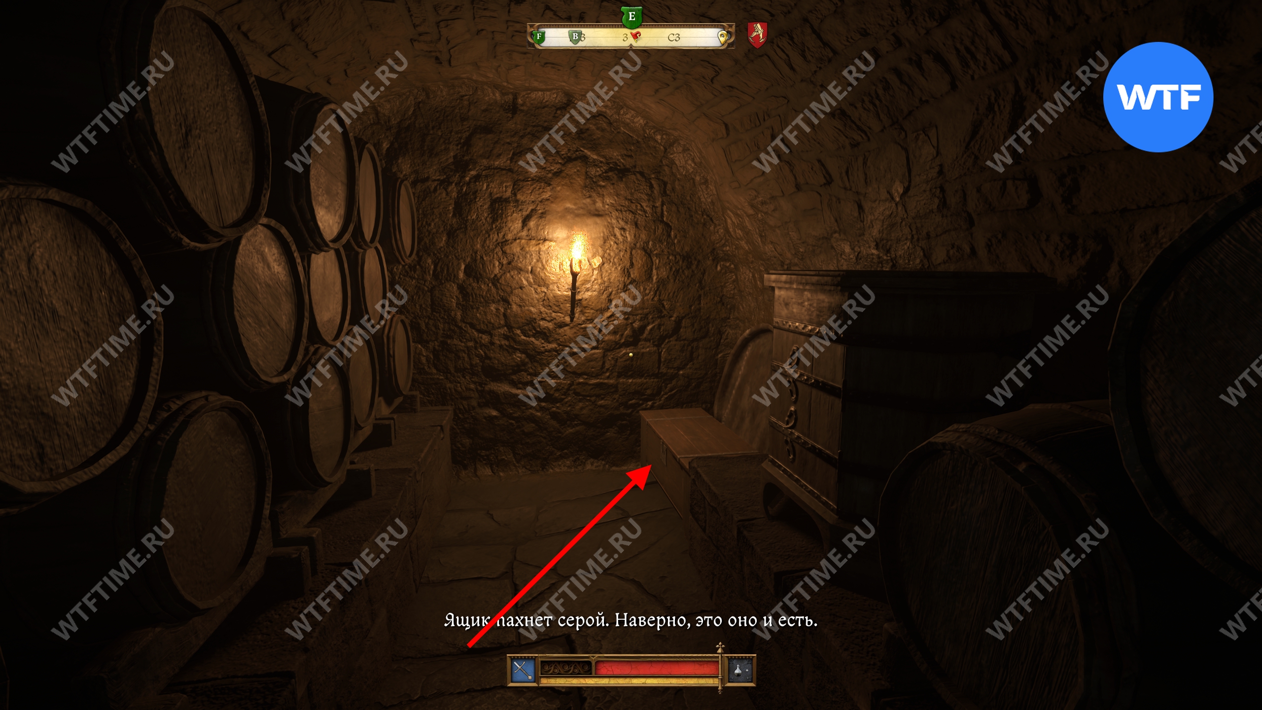 Рабочий день на винограднике длится с 6 до 18 часов. В это время вы можете спокойно зайти в главное здание винодельни, затем пройти через дверь в конце кухни и вскрыть дверь со средним замком. Внутри будет стоять незапертый сундук, в котором лежат серные фитили.