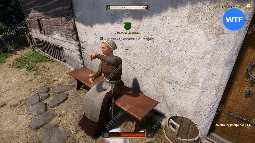 После этого на вашей карте появится отметка нового задания. Идите к дому кузнеца и поговорите с его женой Мартой, сидящей на лавочке перед домом. Она расскажет, что солдаты из лагеря Сигизмунда заказали у них два комплекта подков, а её муж наотрез отказывается их делать.