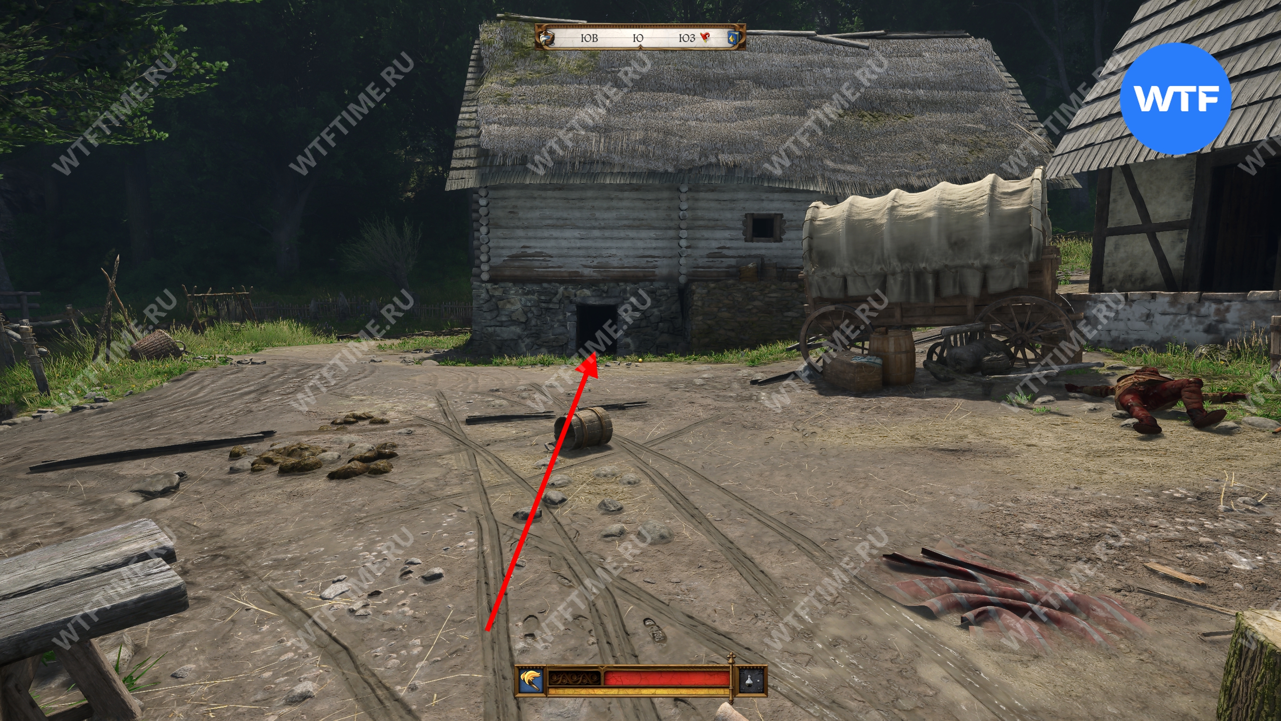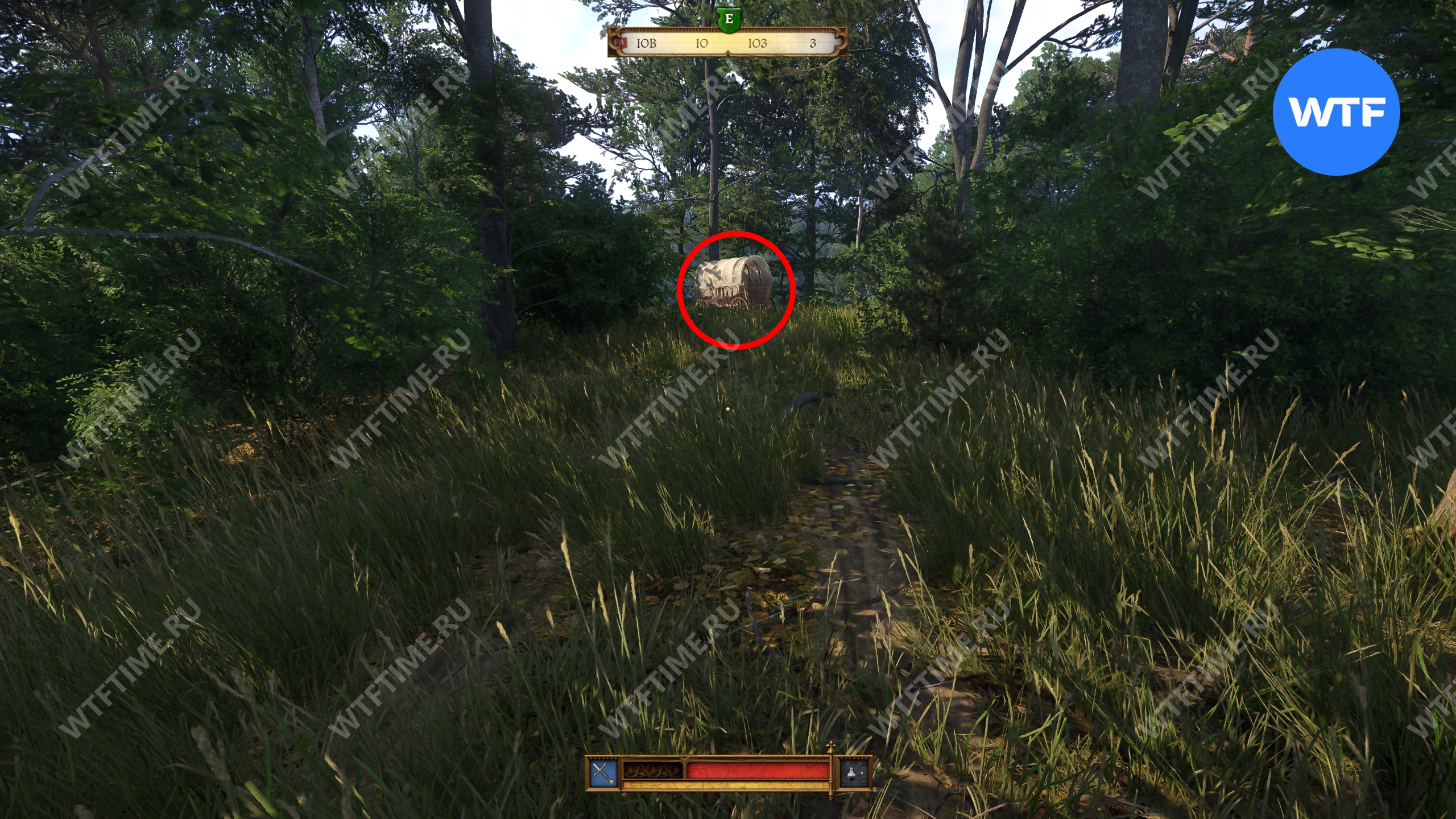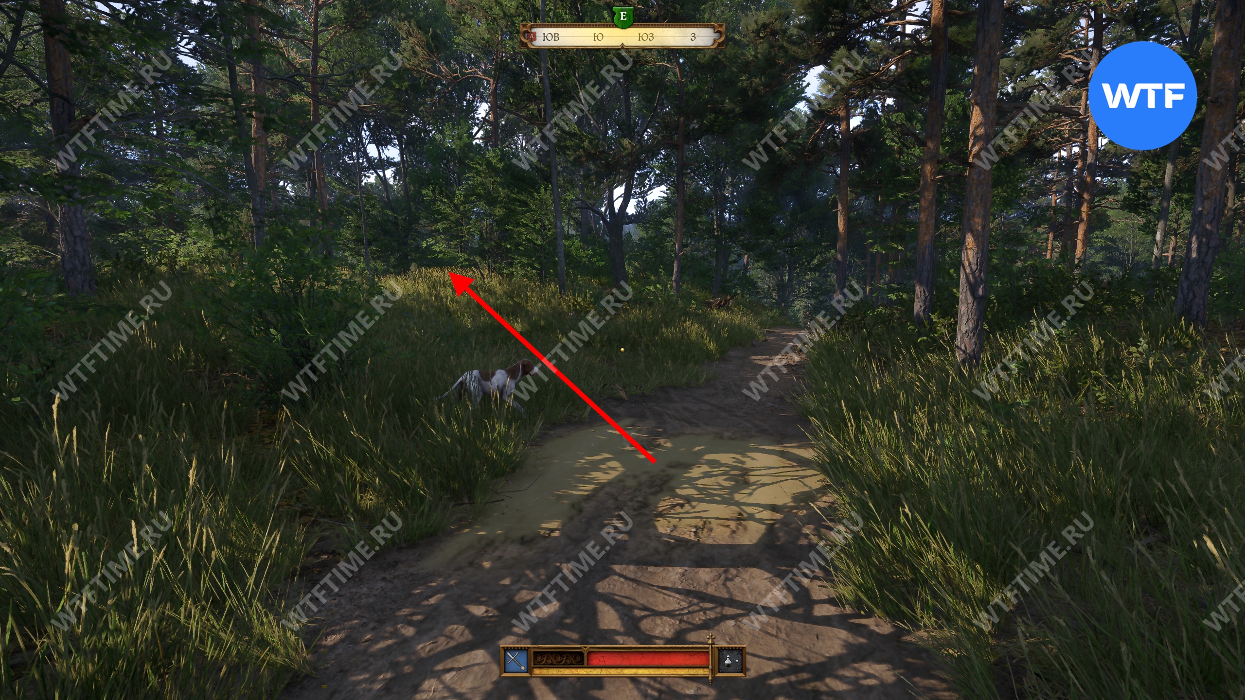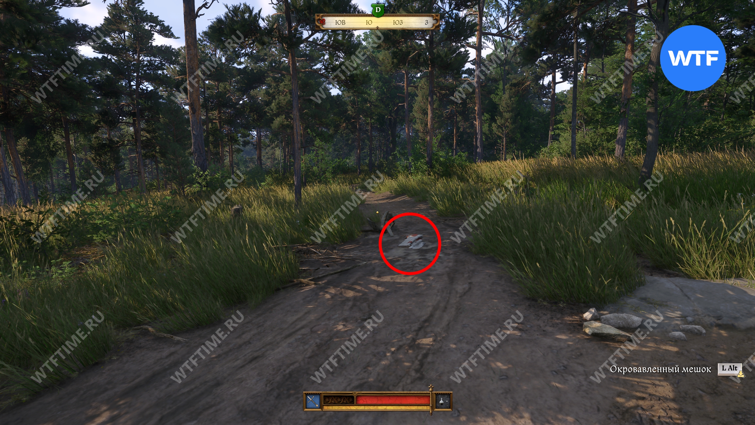 Прибыв в область в поиска, первым делом осмотрите окровавленный мешок, оставленный прямо на дороге, а затем продолжайте следовать на юг, пока не дойдете до большой лужи, возле которой следы телеги уходят в лес (см. скриншоты 3-4).