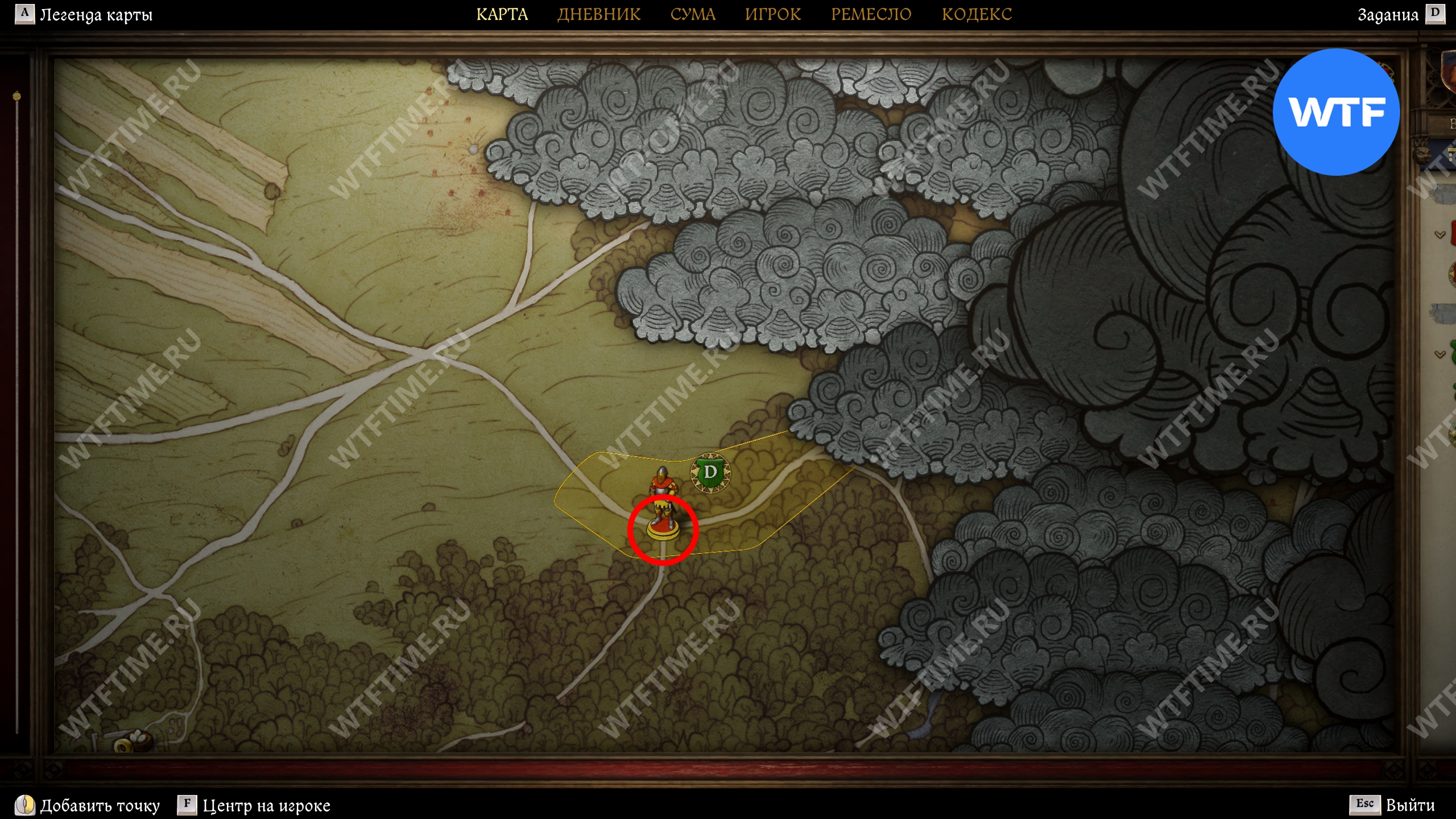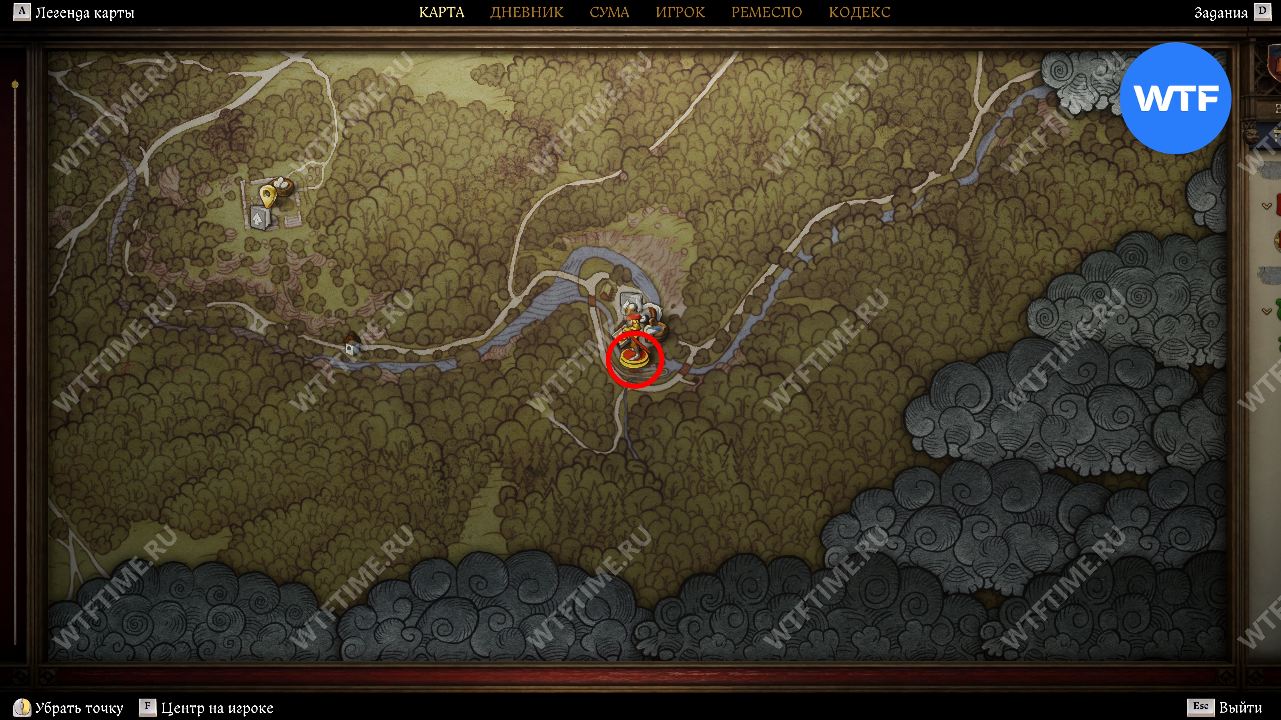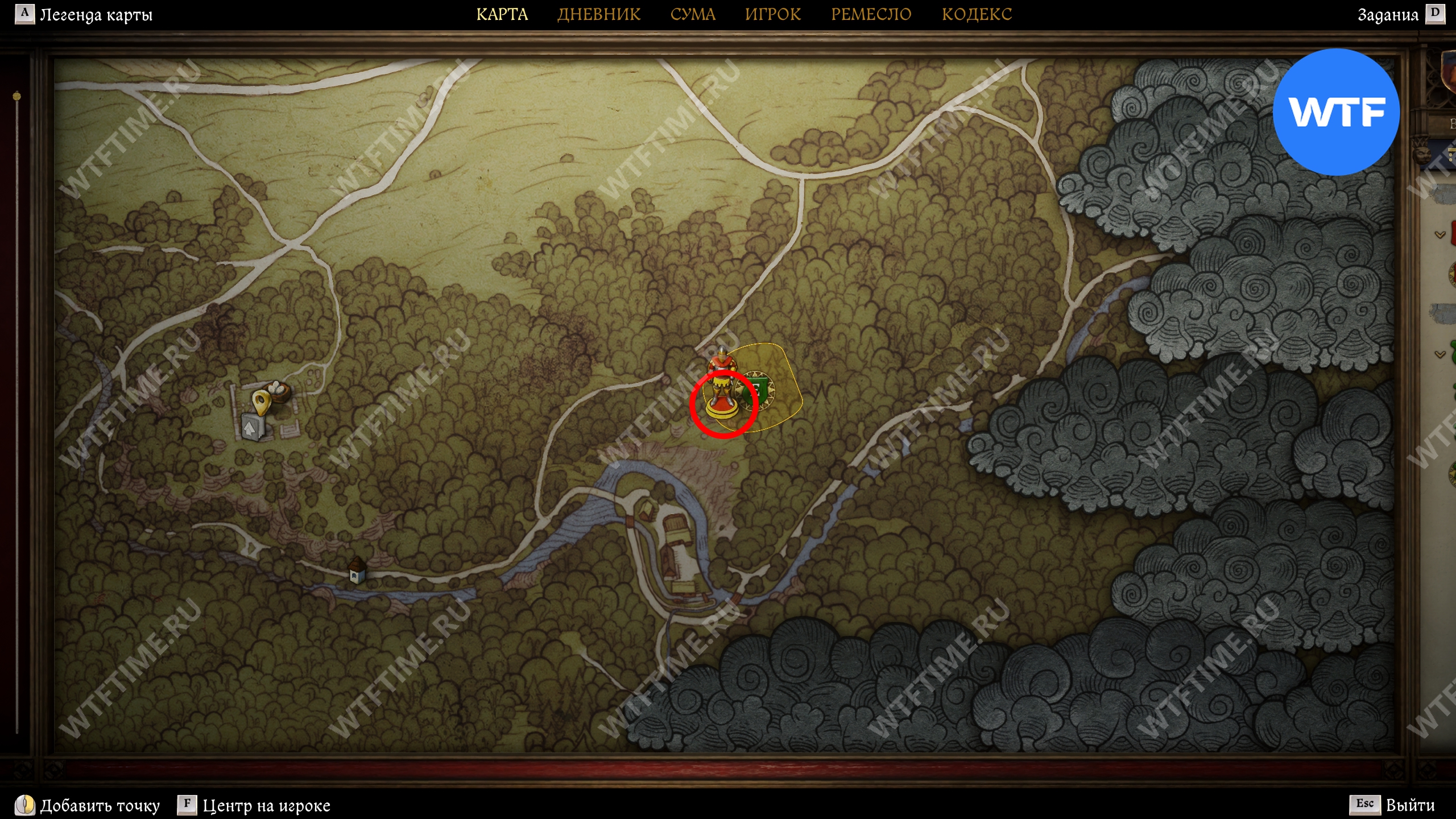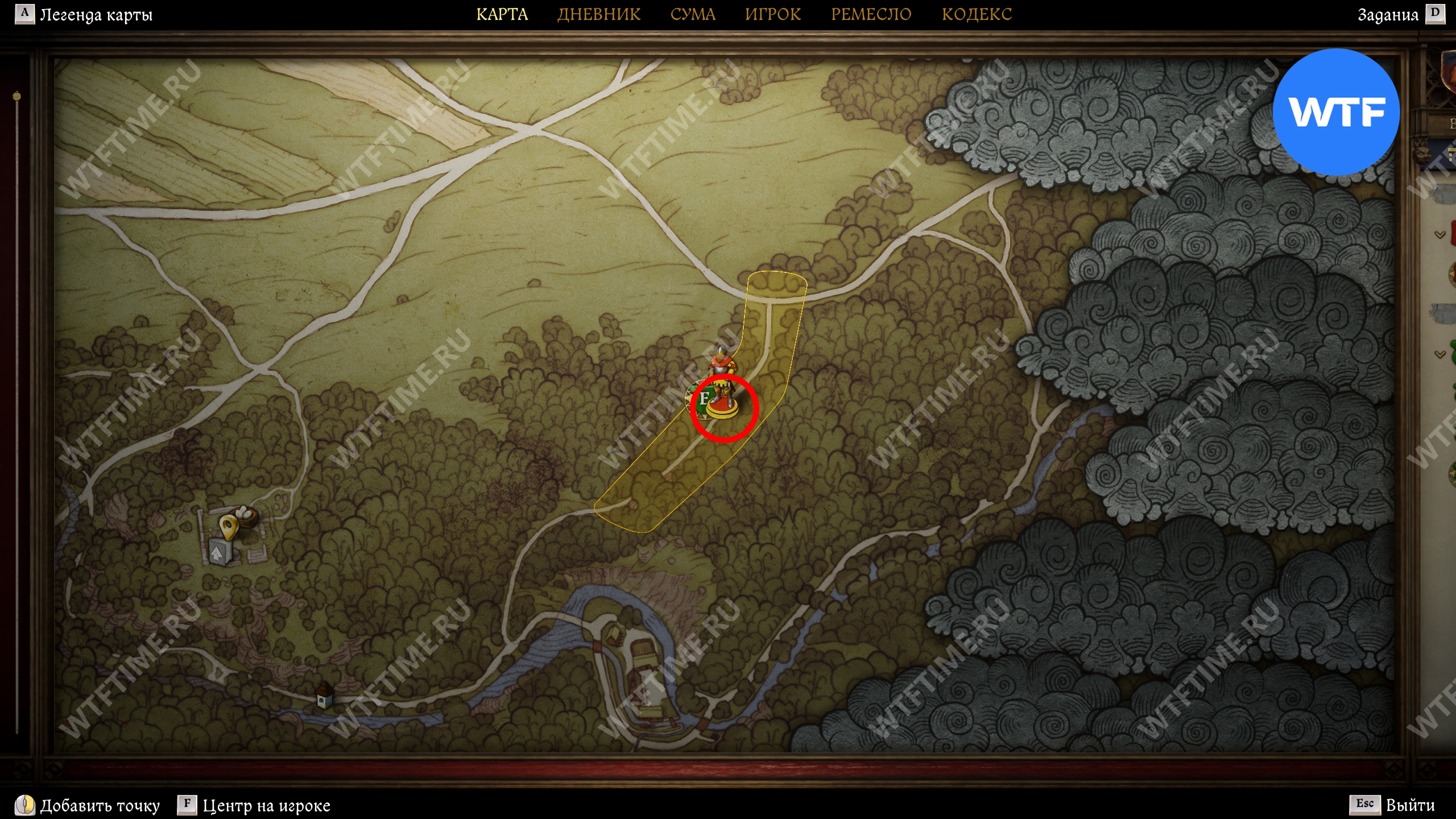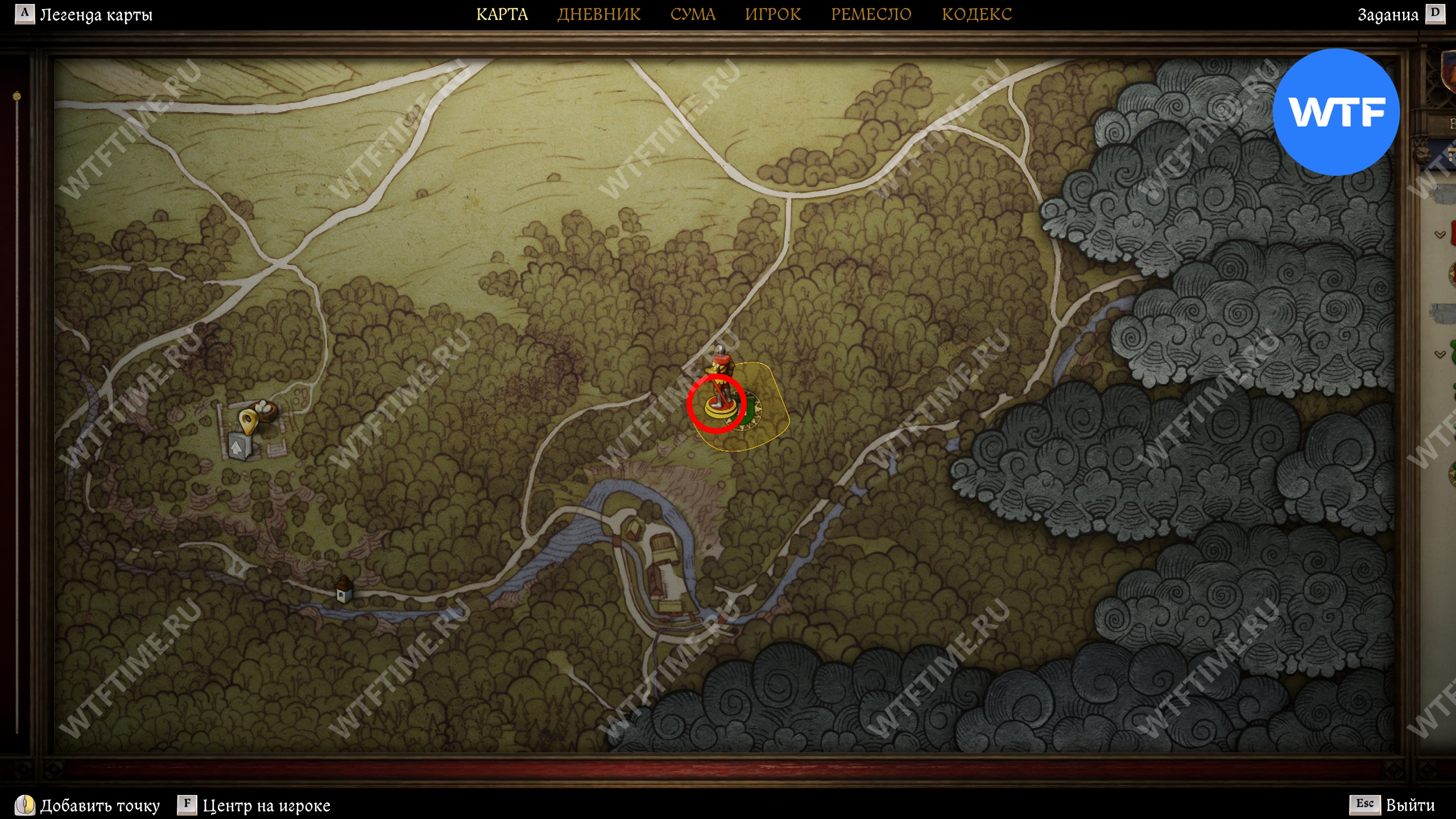Прибыв в область в поиска, первым делом осмотрите окровавленный мешок, оставленный прямо на дороге, а затем продолжайте следовать на юг, пока не дойдете до большой лужи, возле которой следы телеги уходят в лес (см. скриншоты 3-4).