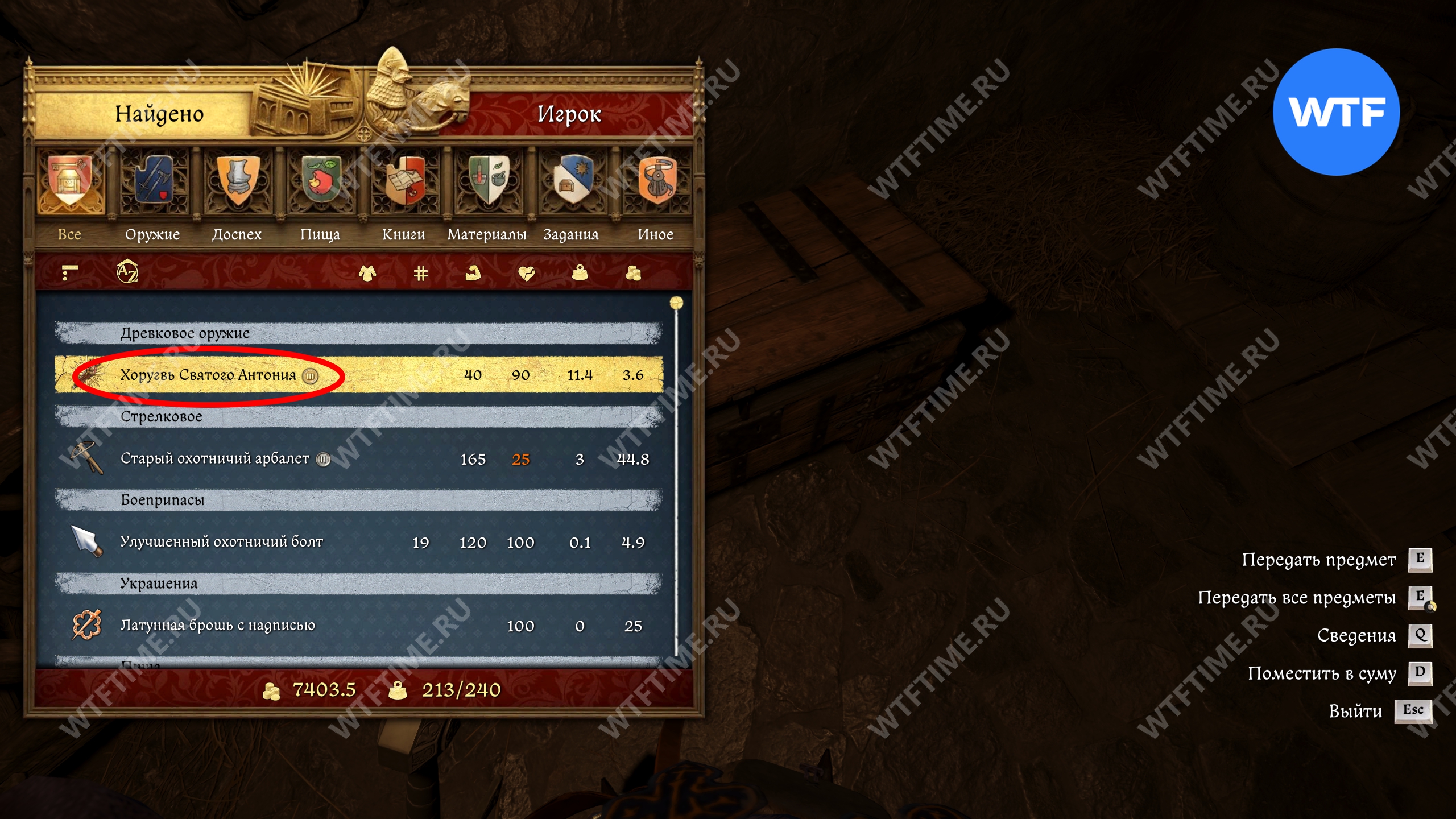 Хоругвь Святого Антония лежит в сундуке возле лестницы справа. Также в нем есть 312 грошей, золотая чаша на продажу и еще кое-что по мелочи. В сундуке на втором этаже есть кузнечные материалы.