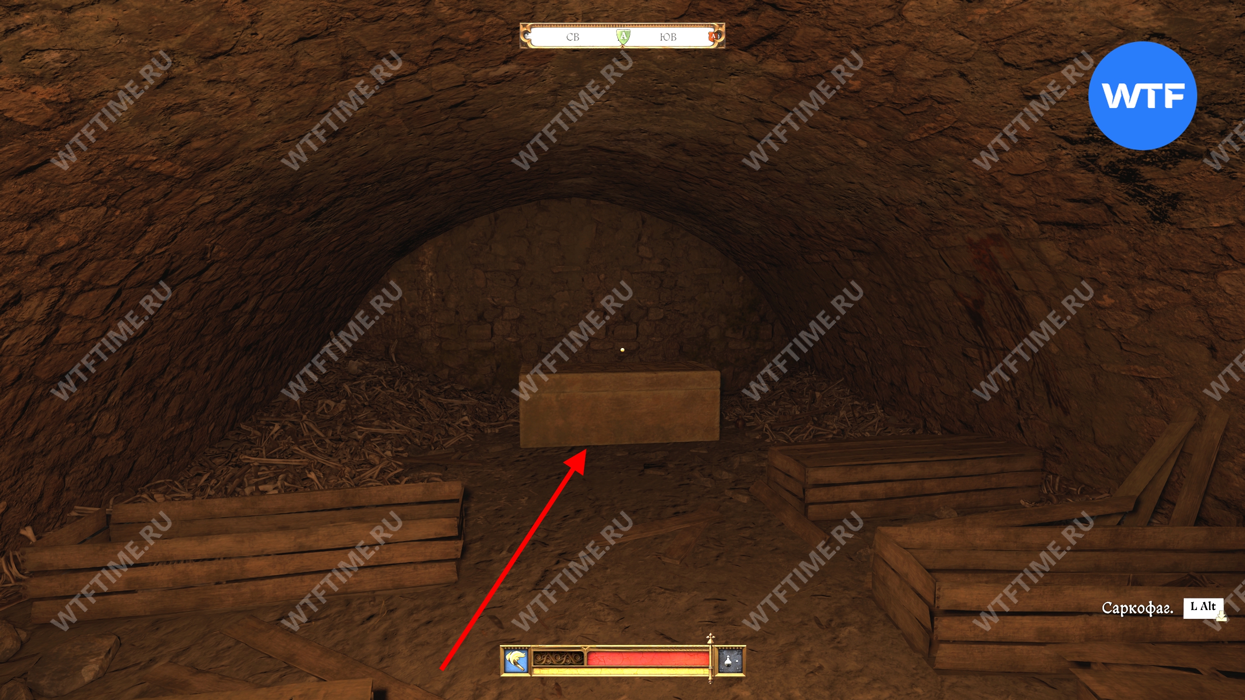 Первым делом зайдите в здание и спуститесь вниз через люк, расположенный прямо в центре зала. Так вы окажетесь в подземной части костницы, где хранятся различные саркофаги.