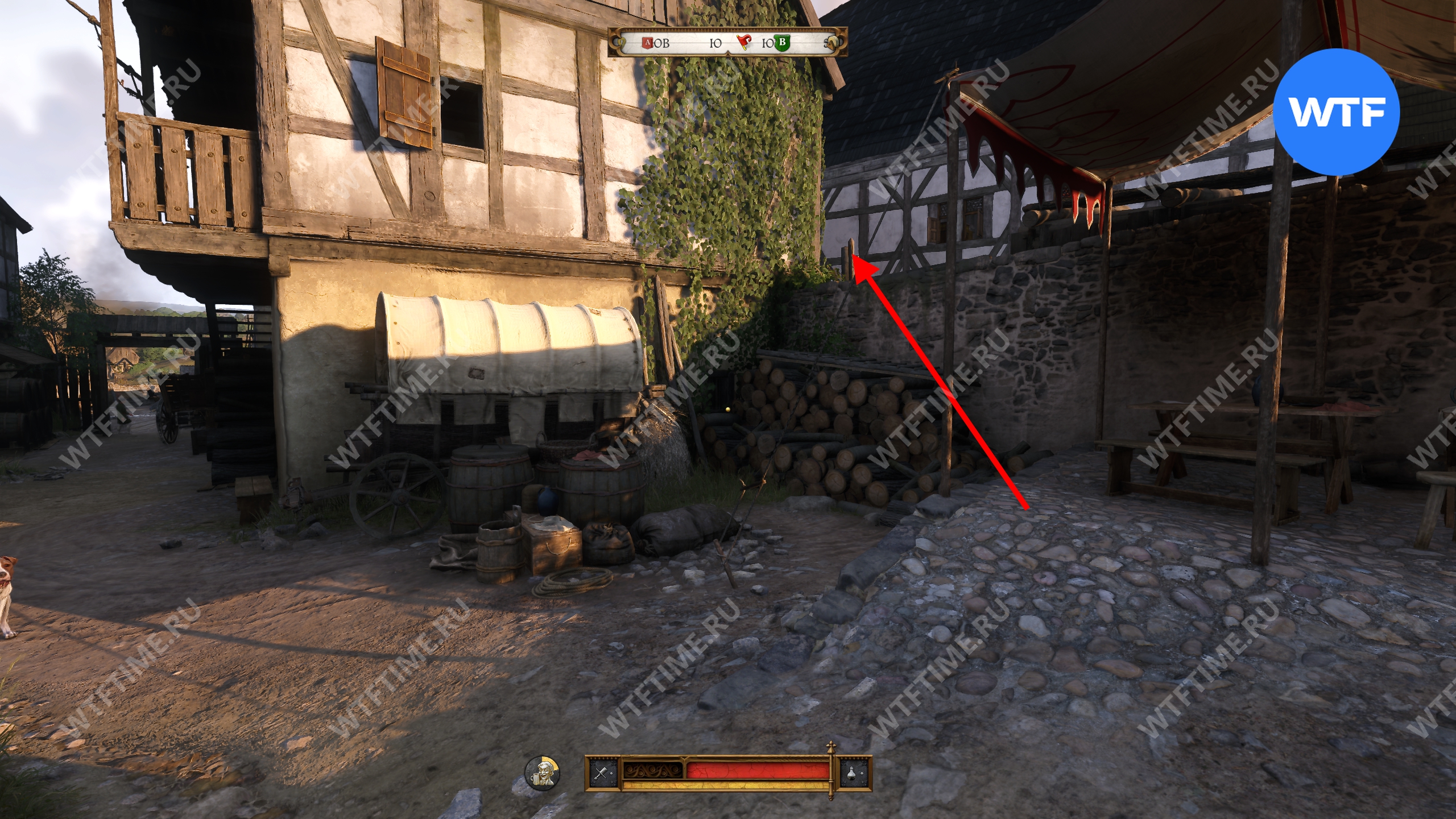 Если не уверены в своих силах, лучше заранее купите и выпейте зелья «Кошачьи лапки» и «Сыч». Чтобы не взламывать замок на главной улице, где часто ходят стражники, нырните в двор справа и перелезьте через забор по куче бревен.
