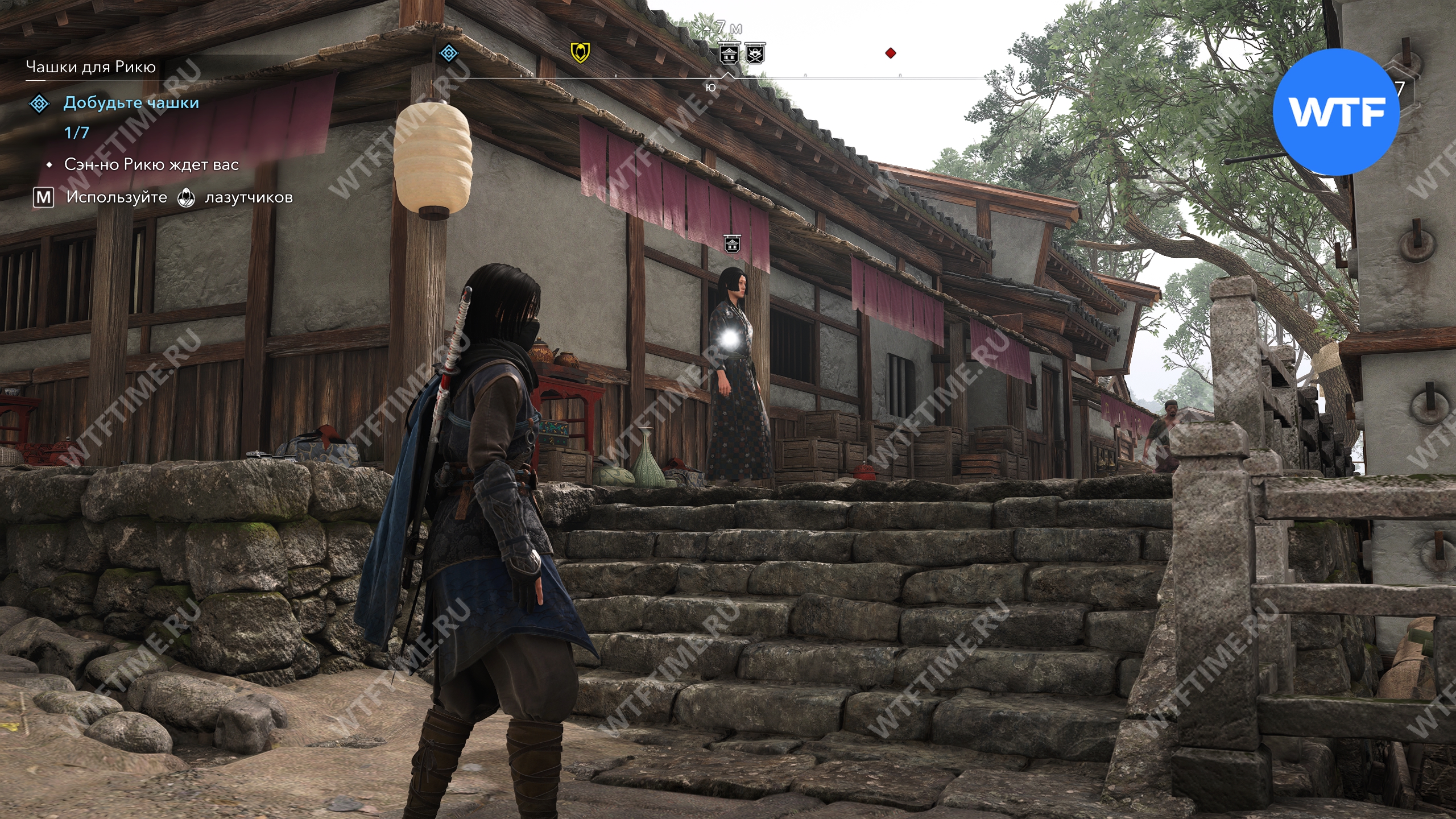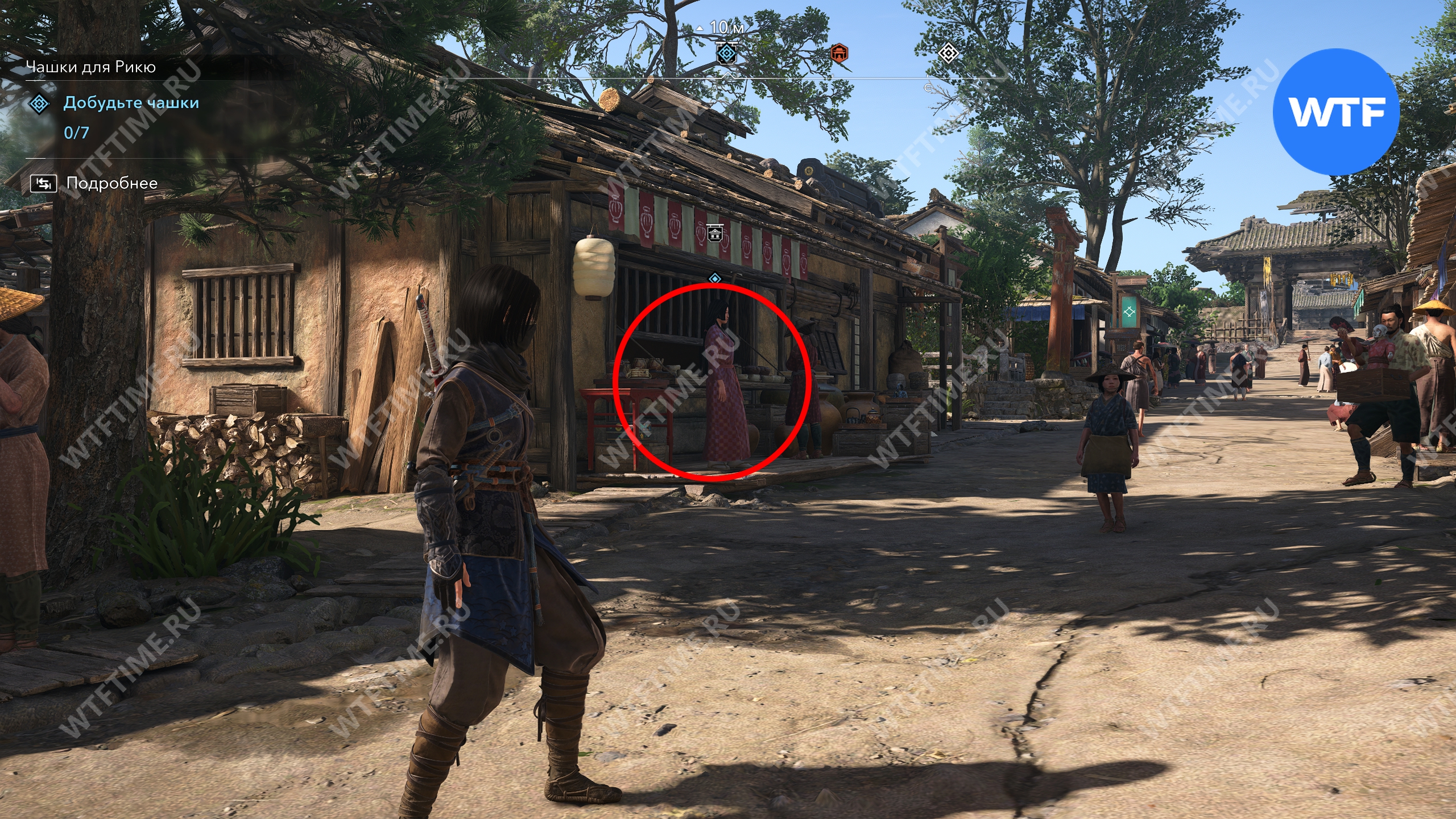 Точное место, где можно найти мастера Сэн-но Рикю показано на скриншоте ниже. Поговорите с ним и он попросит вас найти редкие чашки, достойные его нового чайного домика.