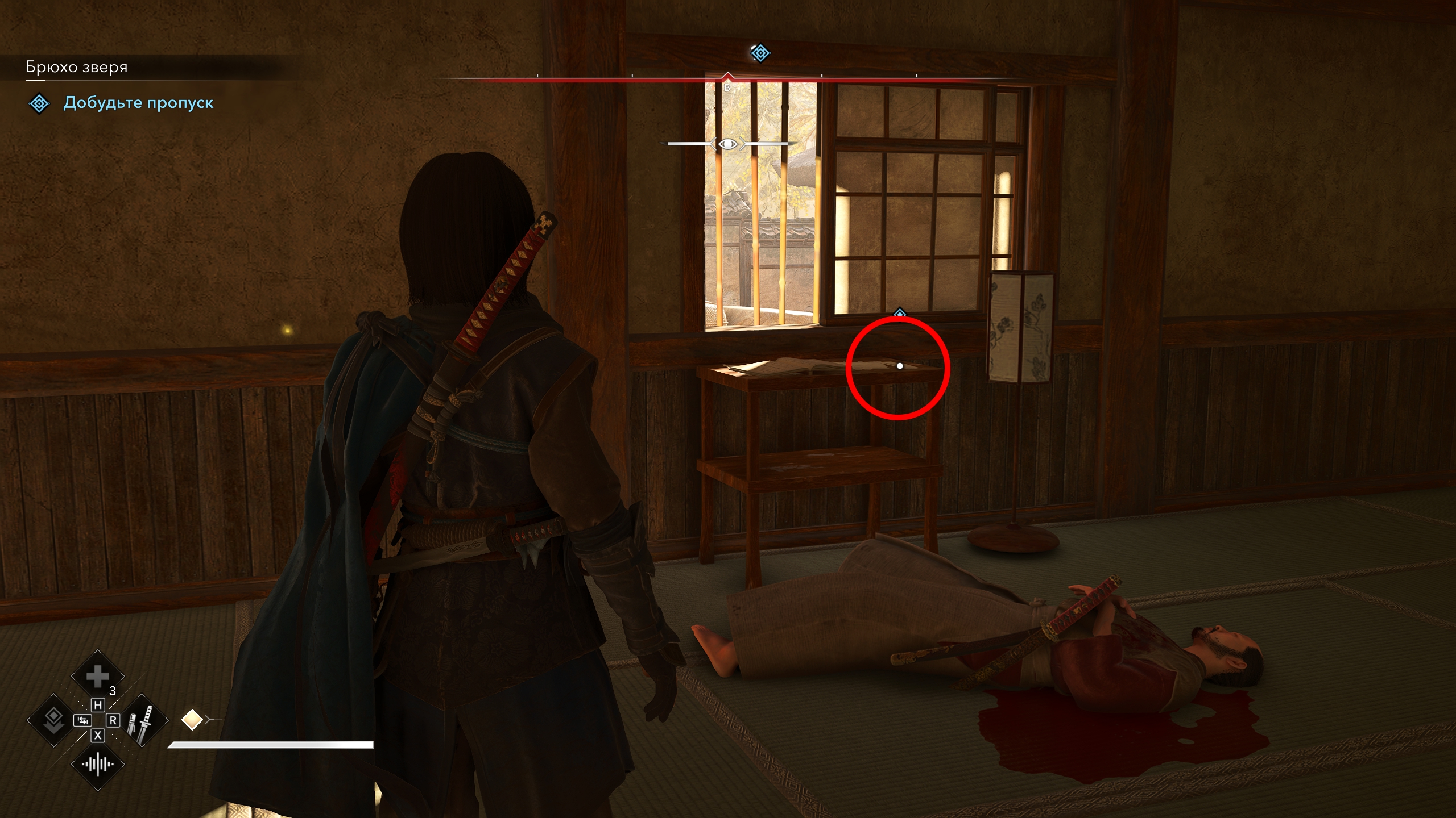 После этого вы сможете войти внутрь и убить со спины человека, стоящего возле стола. Сам пропуск лежит на столе перед ним. Забирайте и уходите, чтобы отнести его Исэ Садаоки.