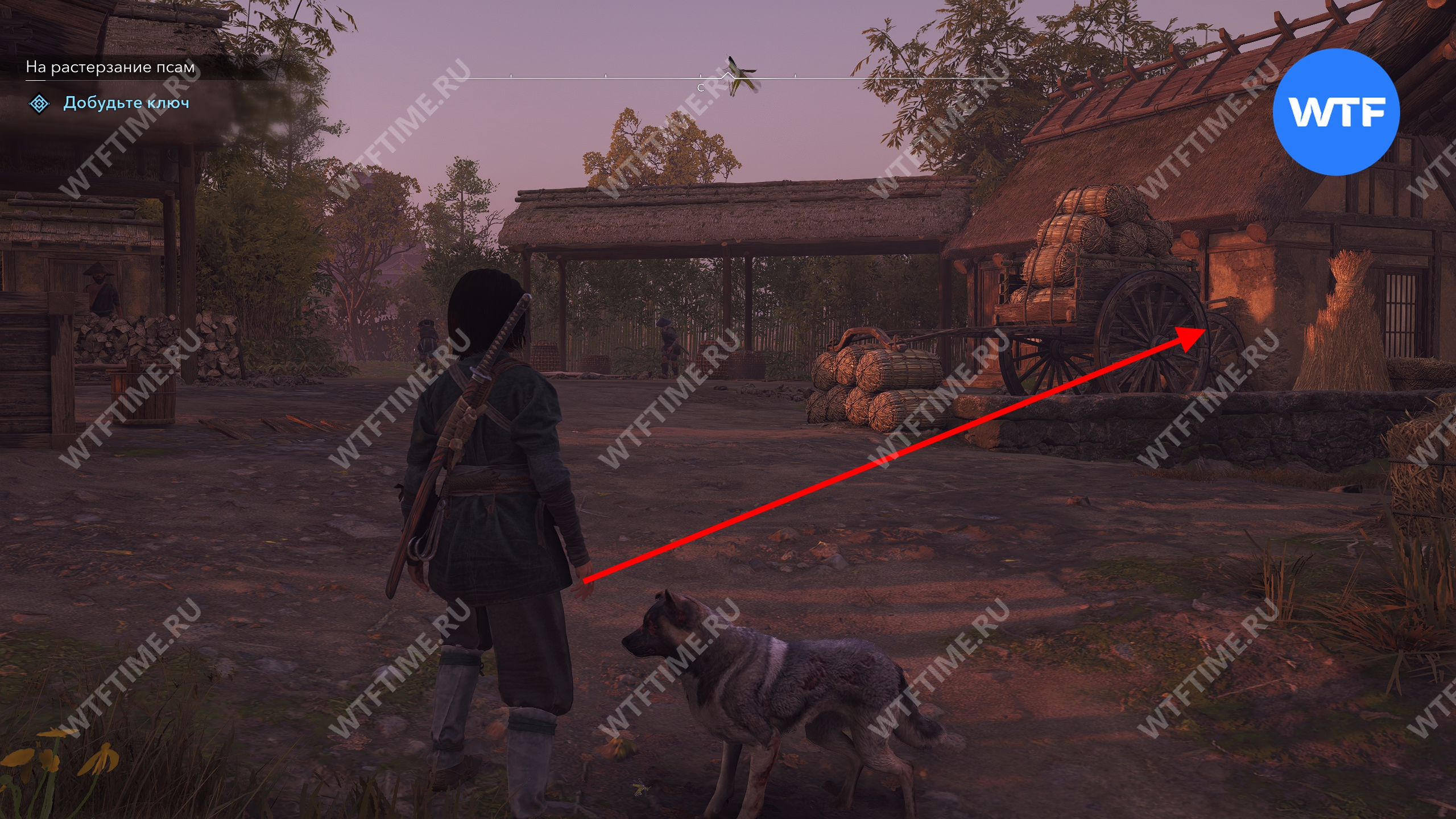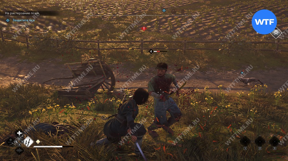 Следуйте за псом по дороге и в итоге наткнетесь на нескольких самураев, которые ищут собаку и что-то говорят про ключ. Вам придется убить их, чтобы защитить несчастного пса.