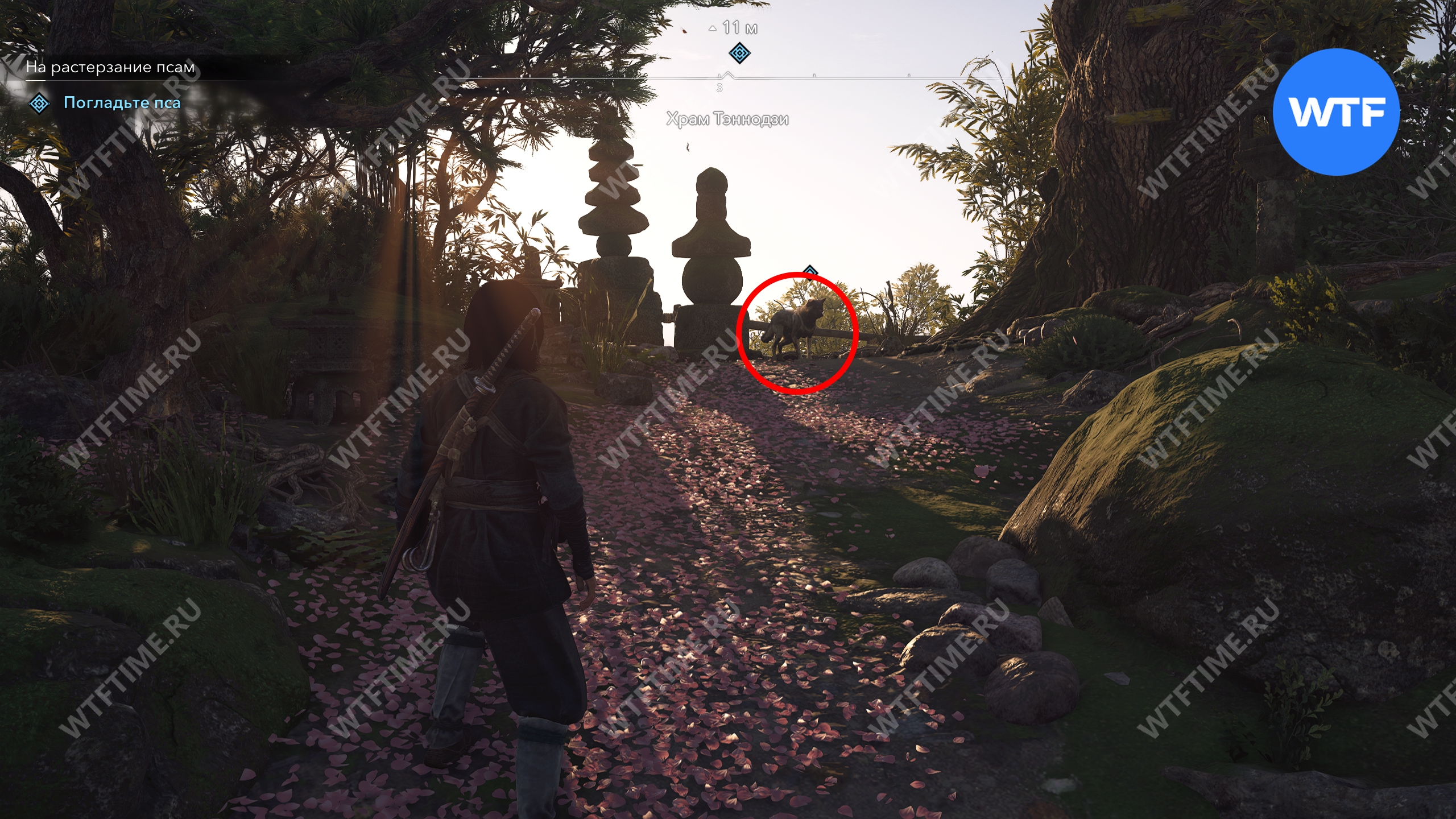 Чтобы найти и погладить пса, от западного входа в храм идите наверх по дорожке из розовых лепестков. В итоге она приведет вас к небольшой могиле, возле которой и будет сидеть израненная собака.