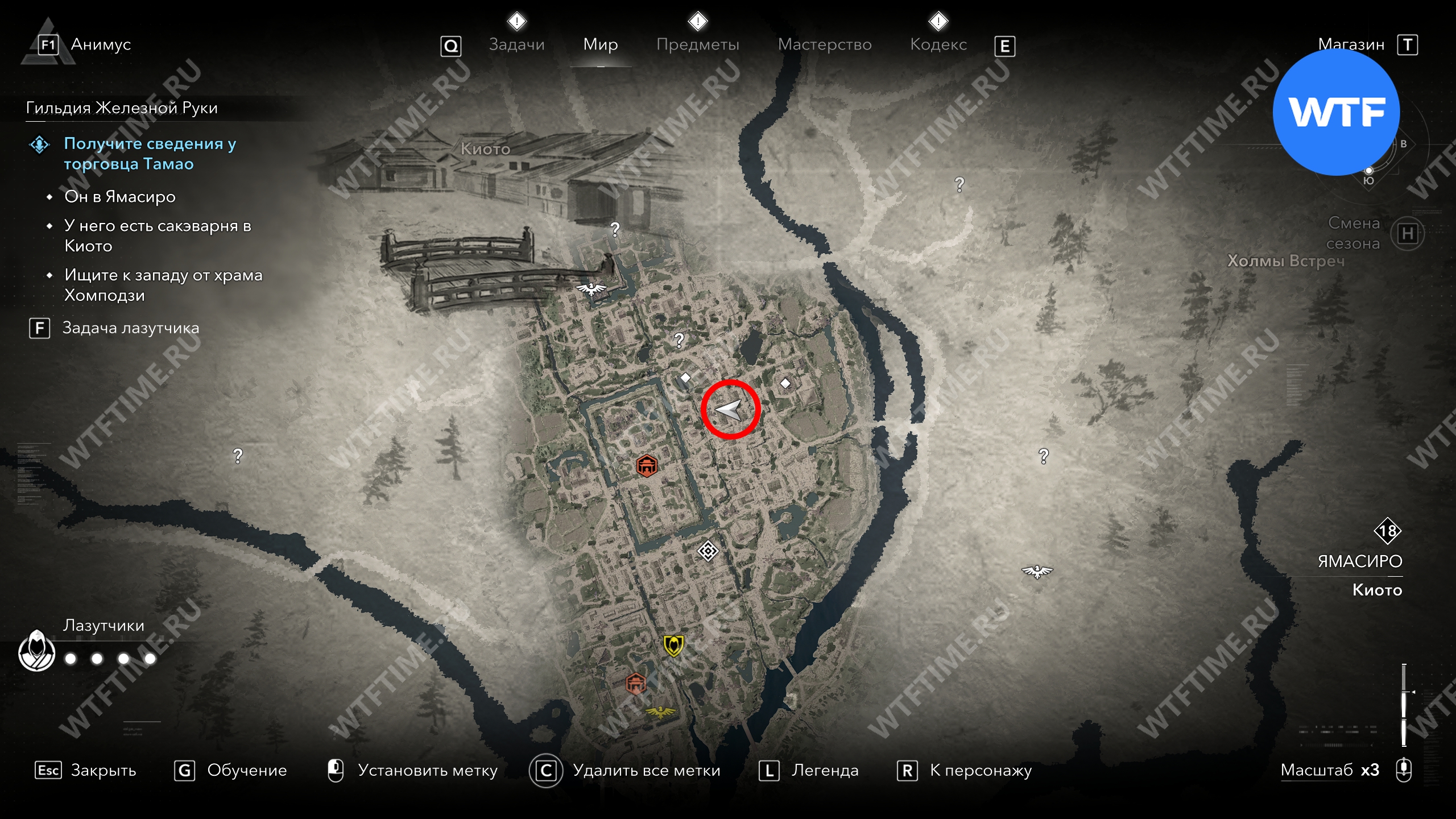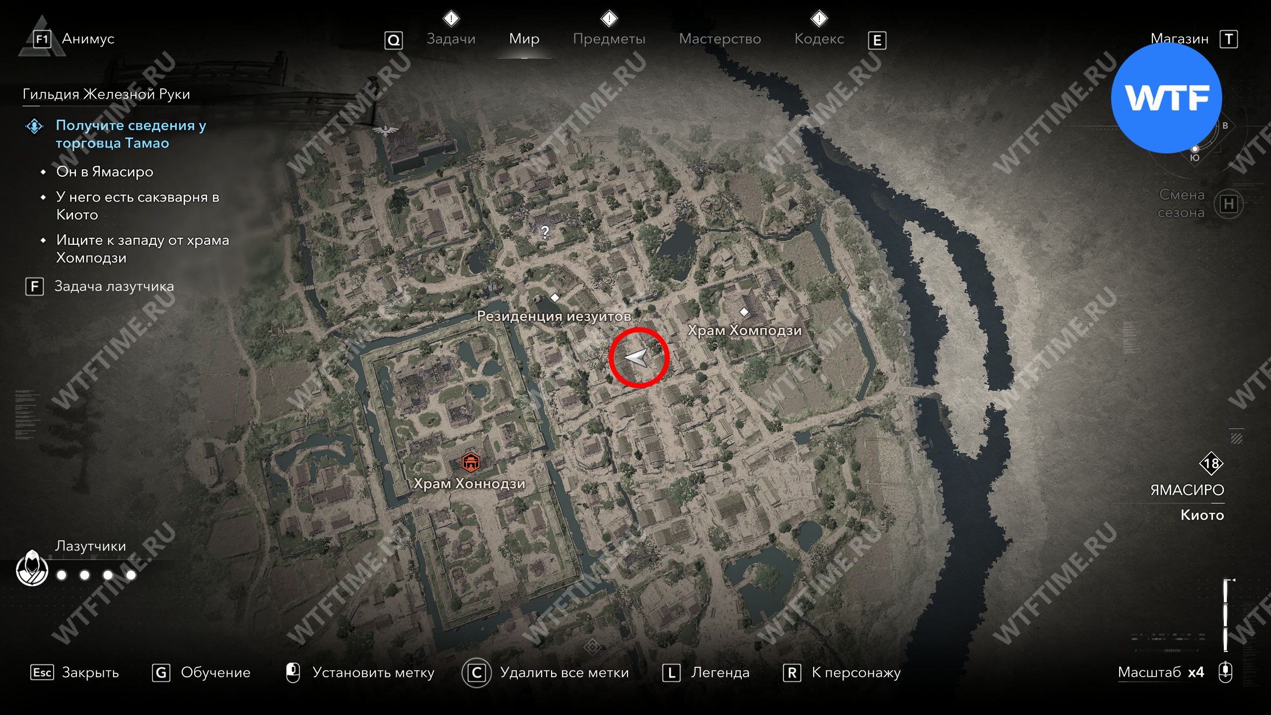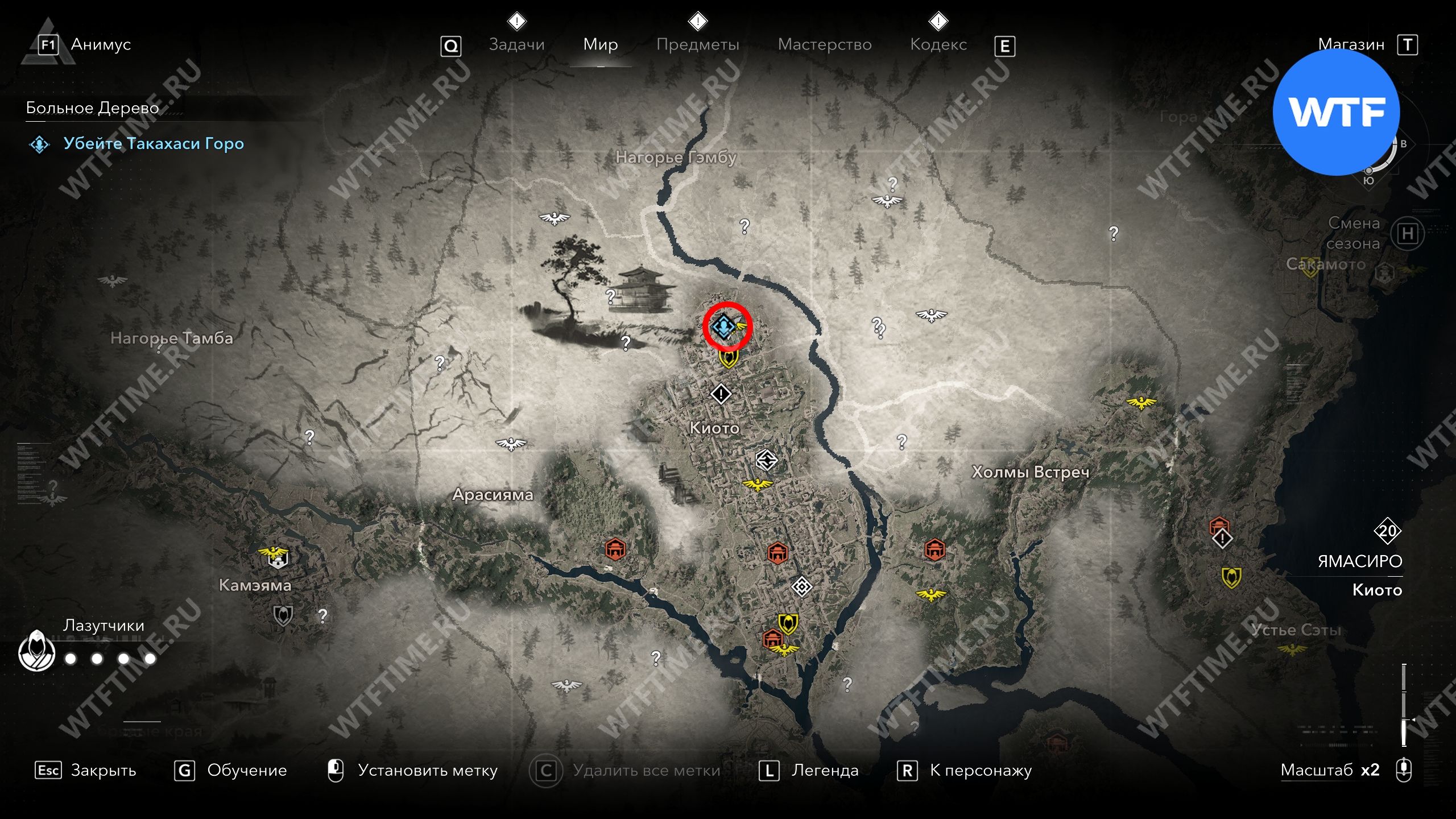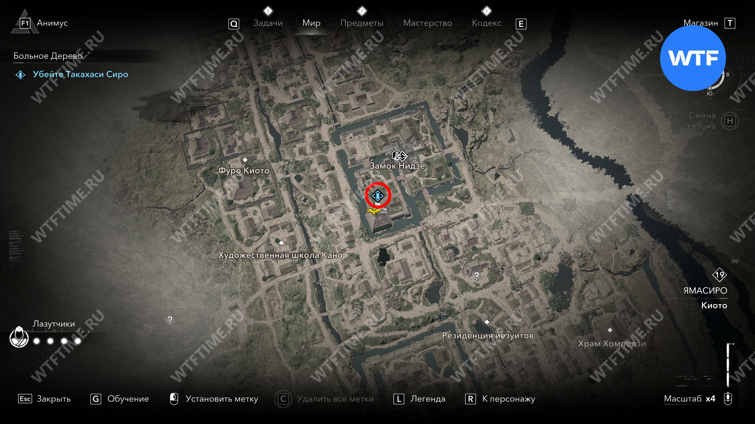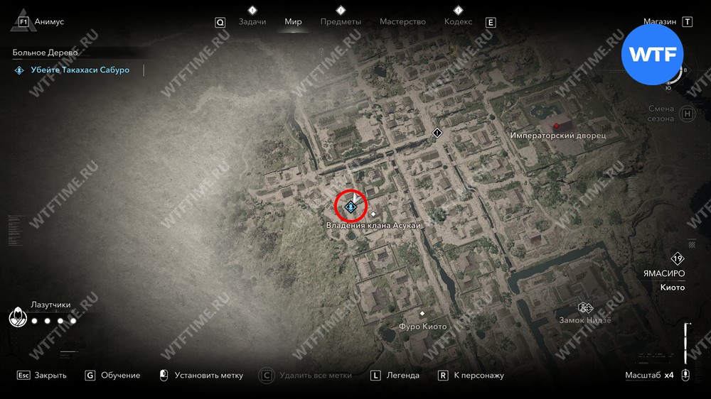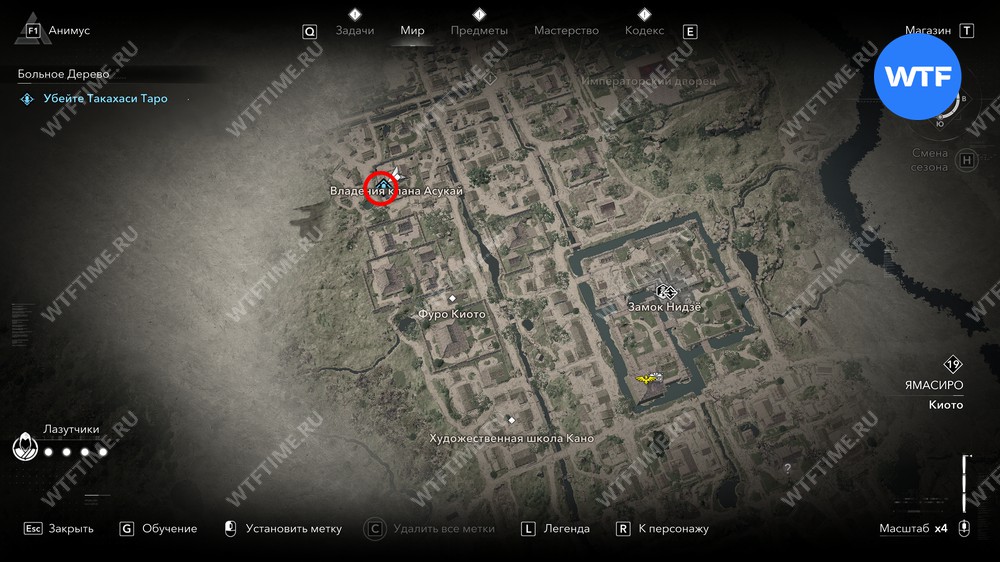 Такахаси Дзиро можно найти буквально в двух шагах от какурэги на юге Киото. Заберитесь на ближайшую крышу, чтобы спрыгнуть сверху и убить охранника, а затем разберитесь непосредственно с Дзиро.