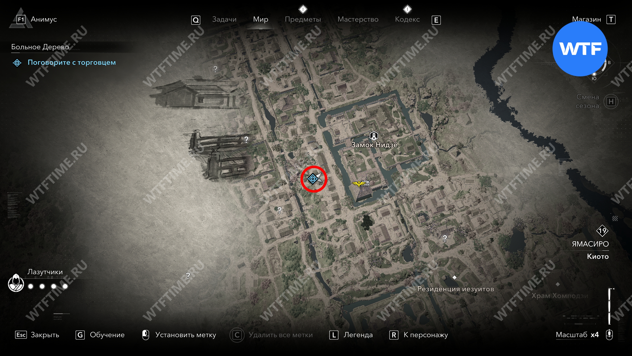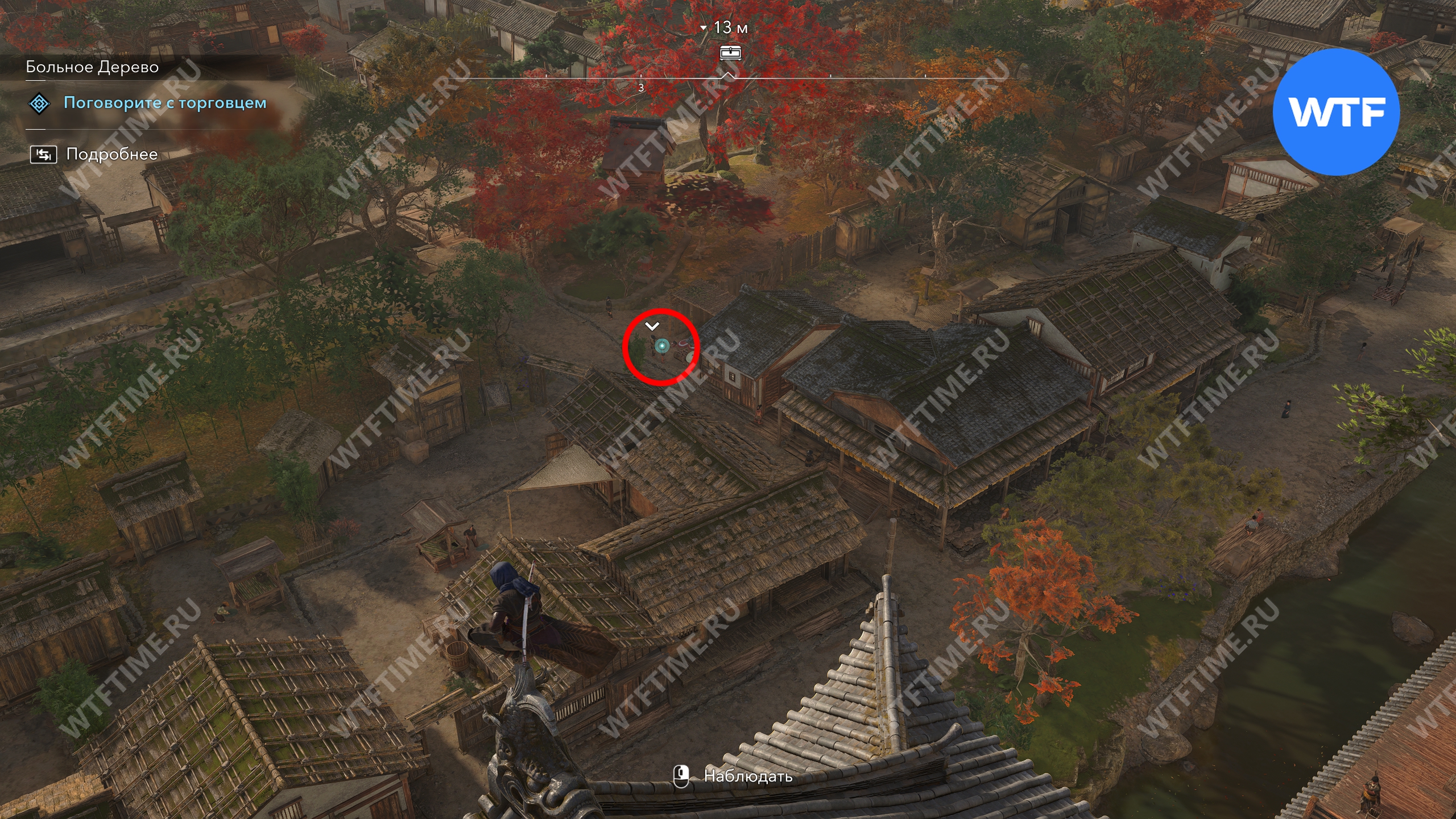 Точное место, где можно найти торговца, показано на скриншоте ниже. Если вы уже открыли точку быстрого перемещения в замке Нидзё, то легко заметите его с высоты.