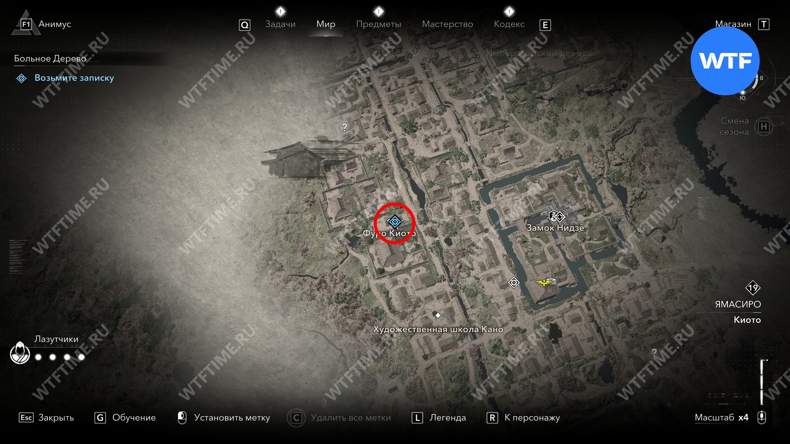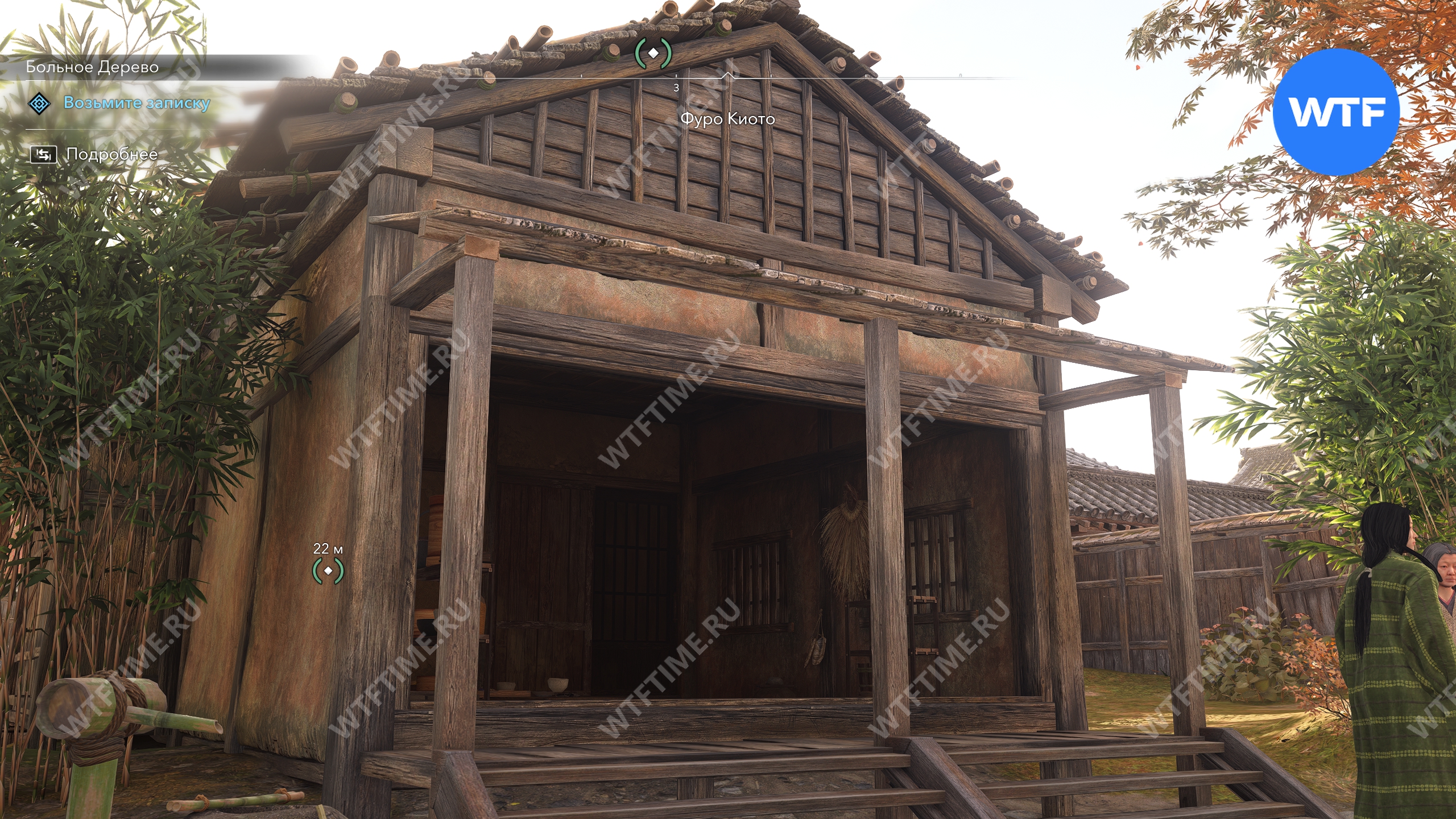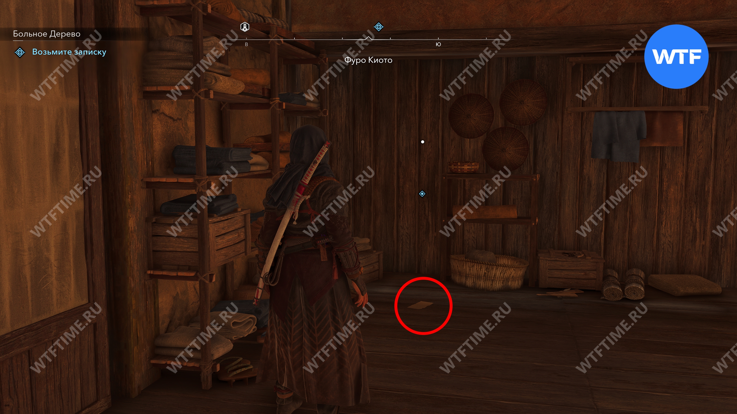 Здание, где вы найдете записку, отмечено на скриншотах ниже. Войдите в Фуро Киото и сразу же посмотрите налево: листок с местом дозора Дзиро будет лежать на полу в углу.