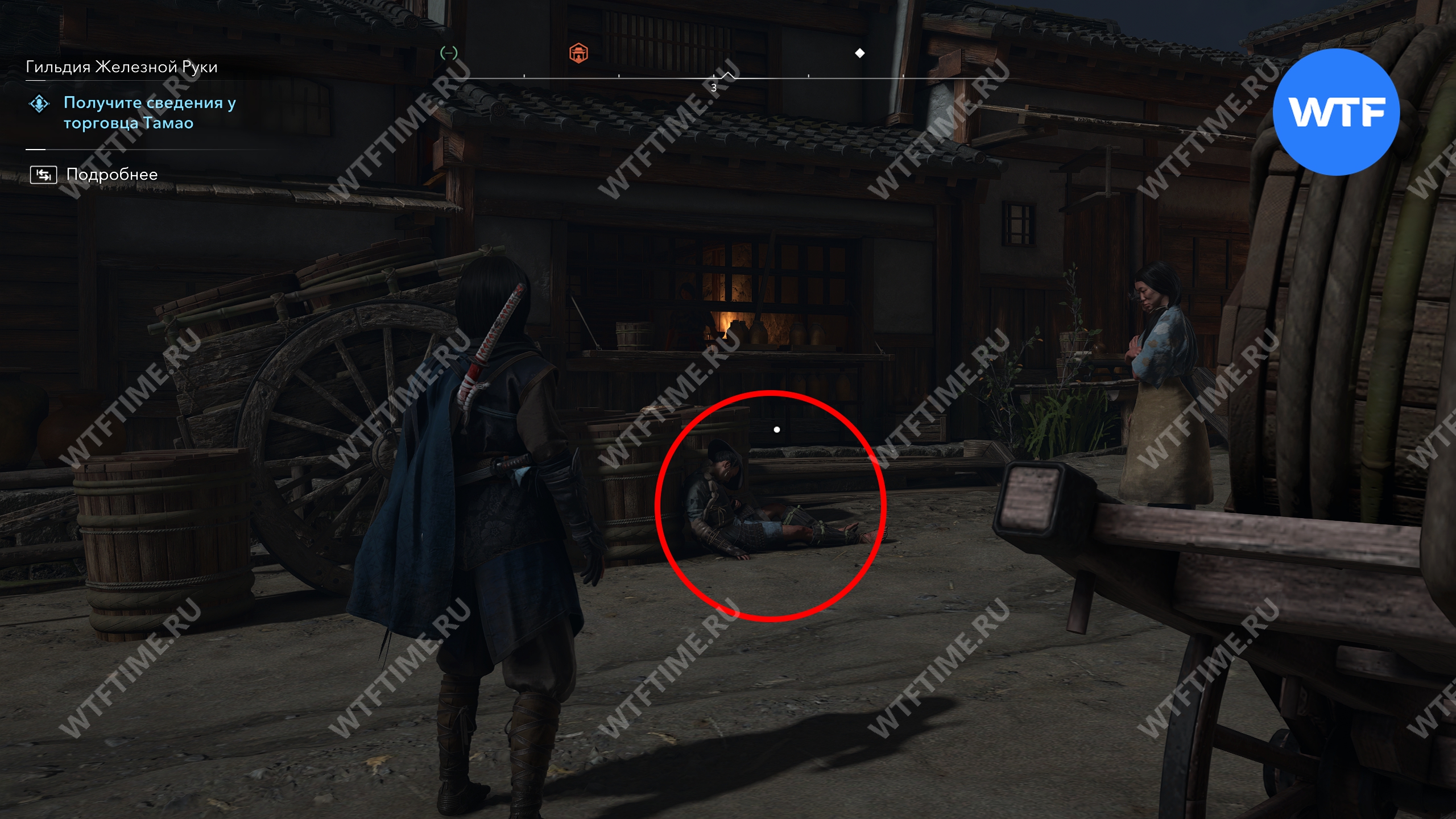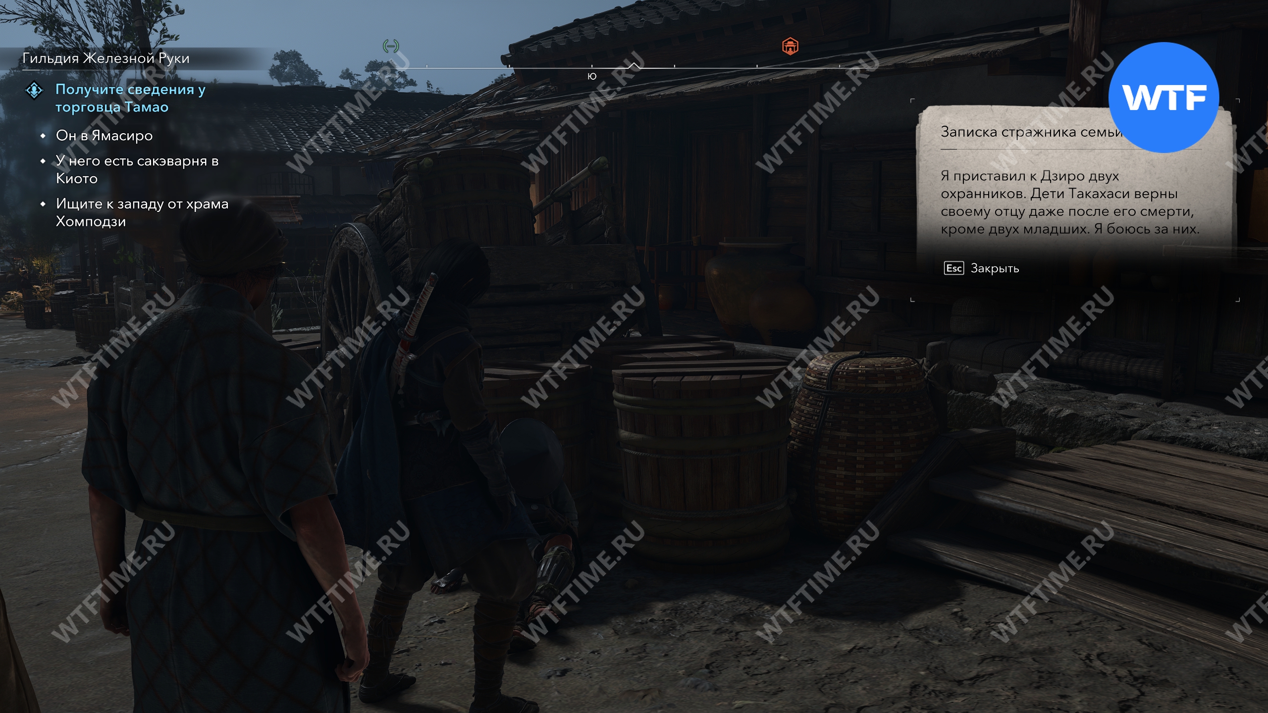Сломанная телега находится прямо возле точки быстрого перемещения за пределами замка Нидзё. Спрыгните с вышки, а затем посмотрите направо, чтобы её увидеть. Осмотрите бумаги рядом с телегой — это раскроет местонахождение Такахаси Сиро.