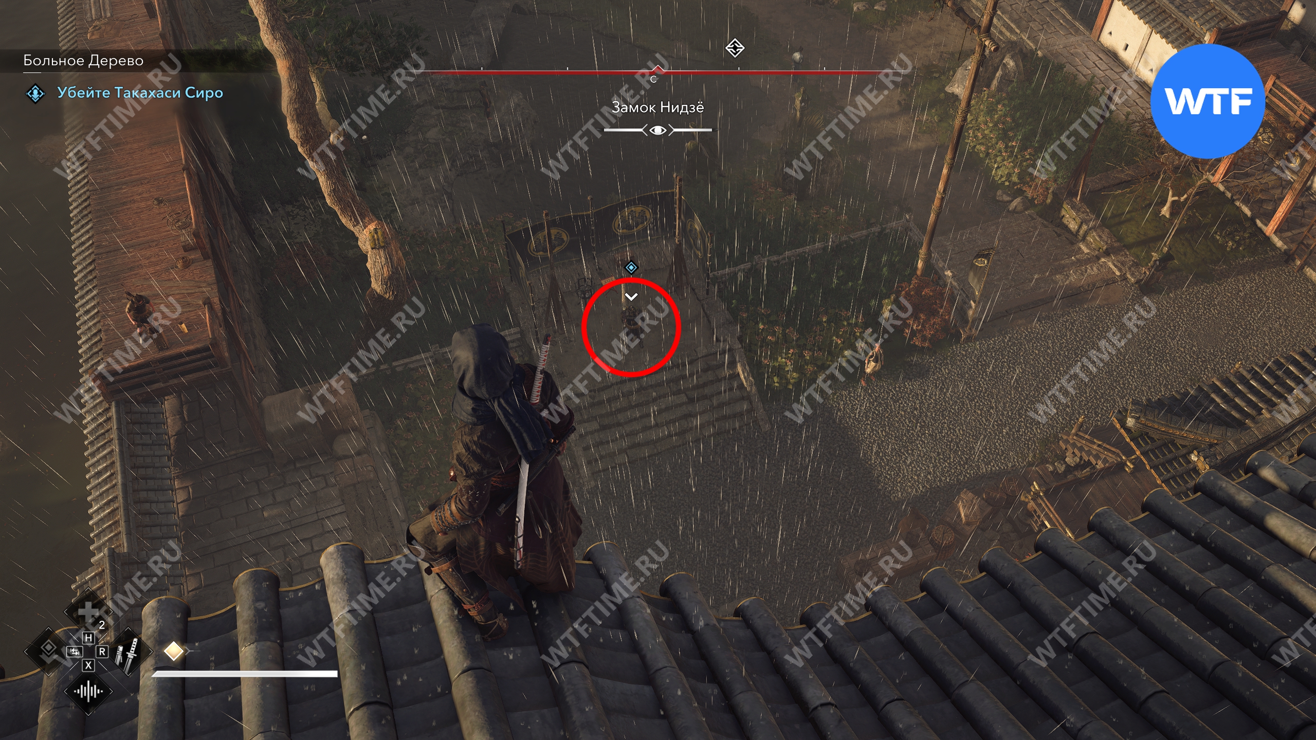 Такахаси Сиро стоит во дворе к северо-востоку от главной башни замка Нидзё. Он достаточно далеко от всех крыш, так что спрыгнуть сверху не получится. Вместо этого вы можете пробраться по стене слева и сначала снять лучника.