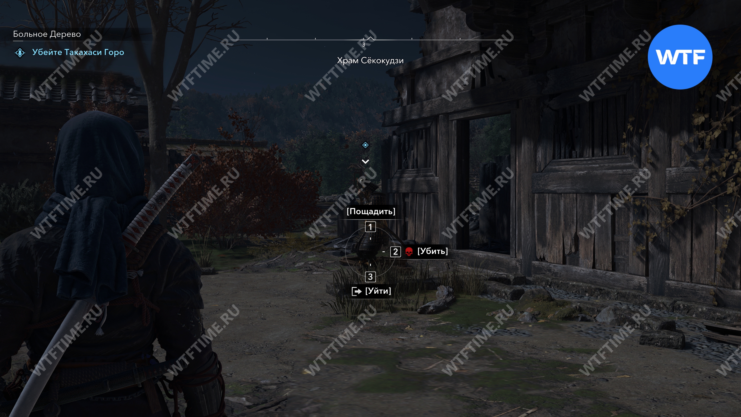 Но вы все равно можете подкрасться по стене рядом и спрыгнуть сверху, чтобы совершить внезапную атаку. В награду за победу над Такахаси Сабуро вы получите редкую катану «Почтение Сабуро», 2000 опыта, 2 очка мастерства и зацепку для поисков Такахаси Ити-химэ.
