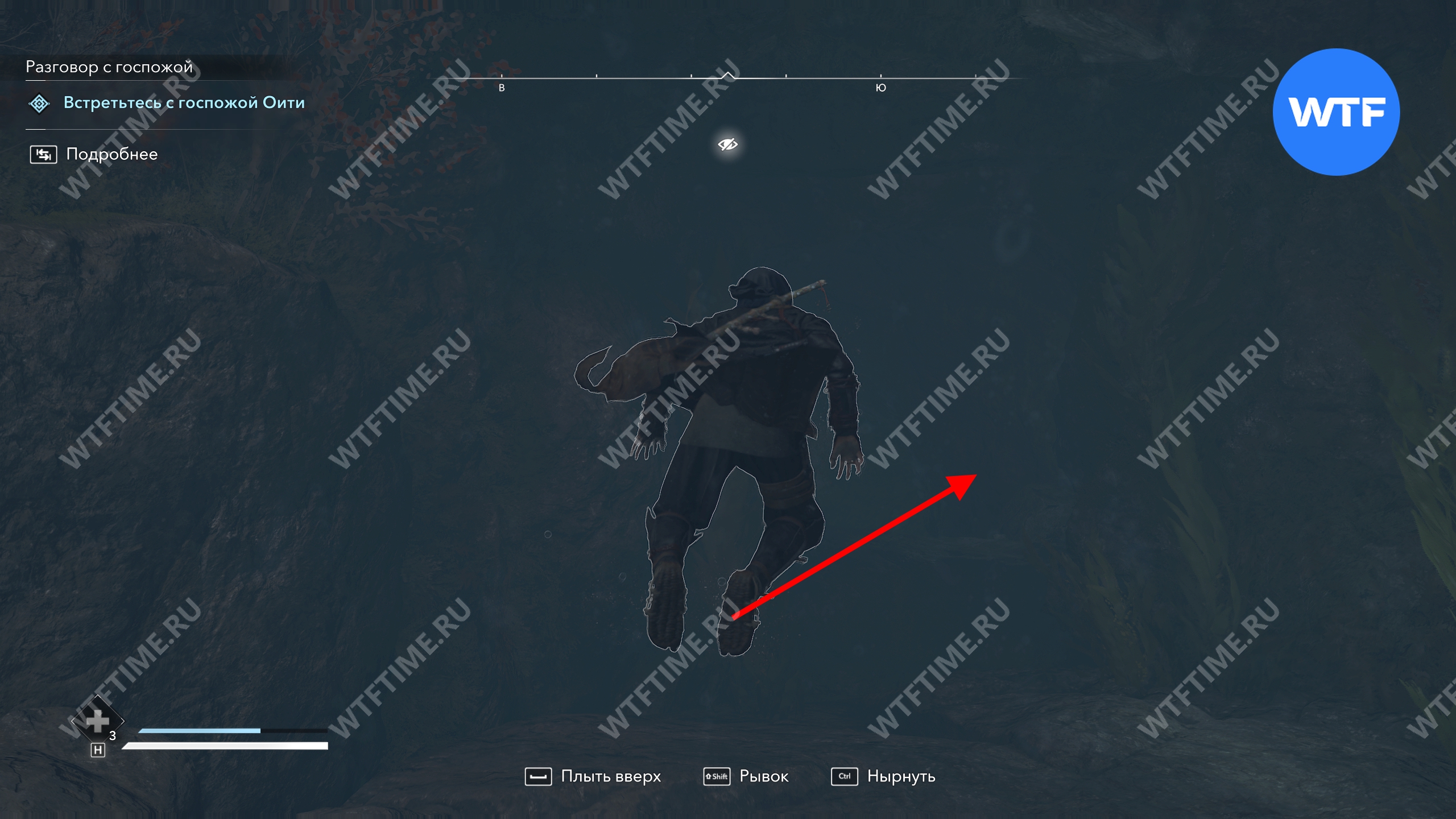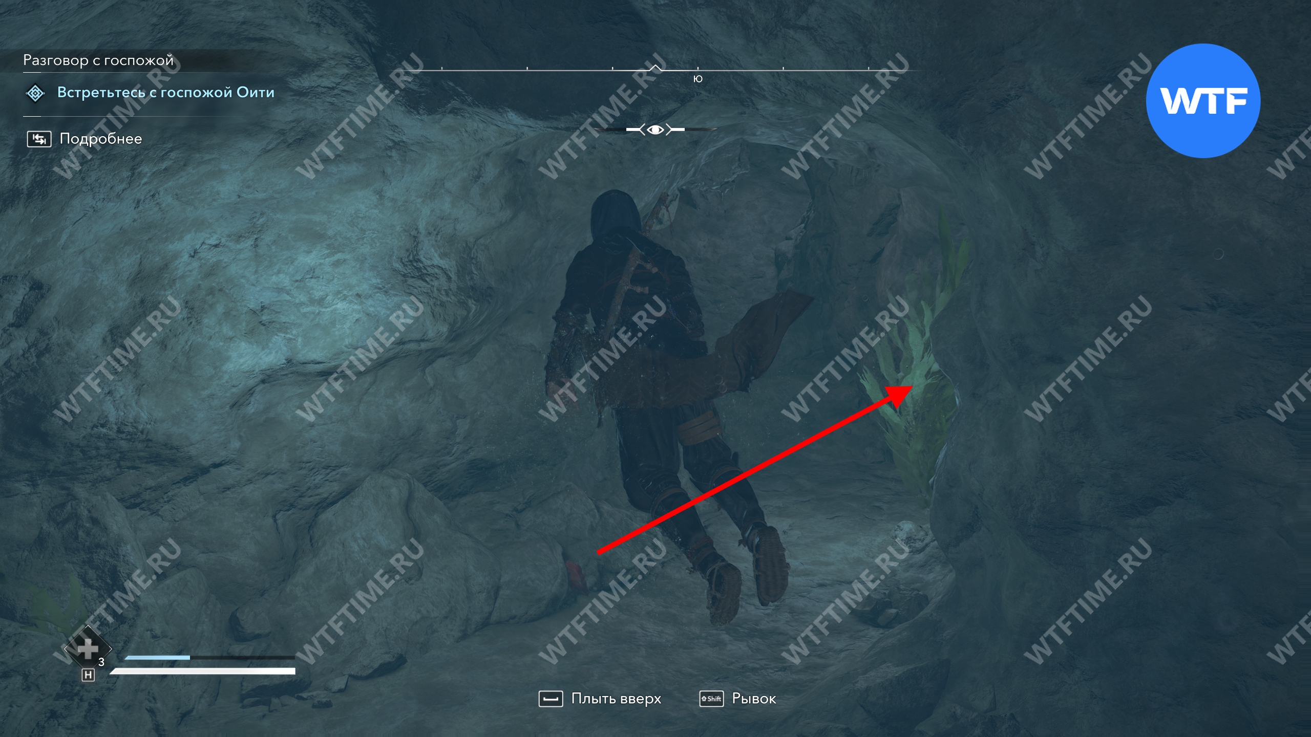 Визуально вы должны стать примерно посередине между костром и деревом, растущим на берегу, затем нырнуть и сделать 3-4 гребка вниз. После этого вход в подводную пещеру будет прямо перед вами.