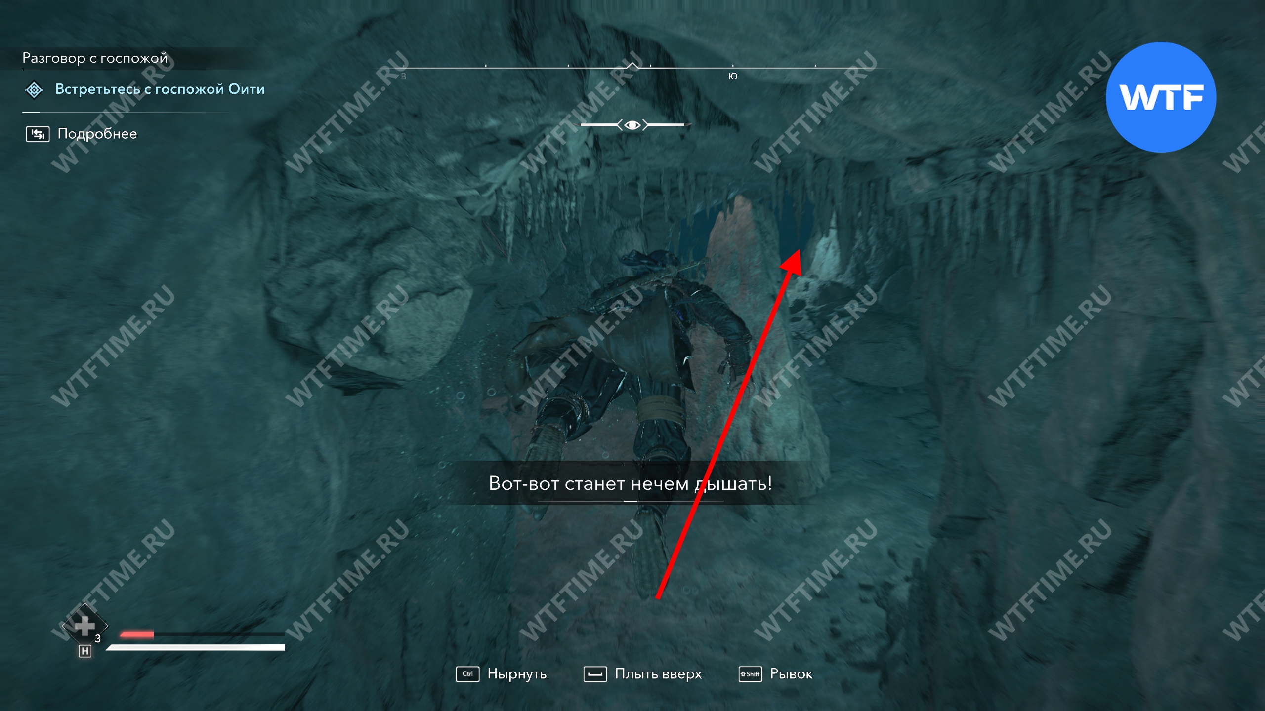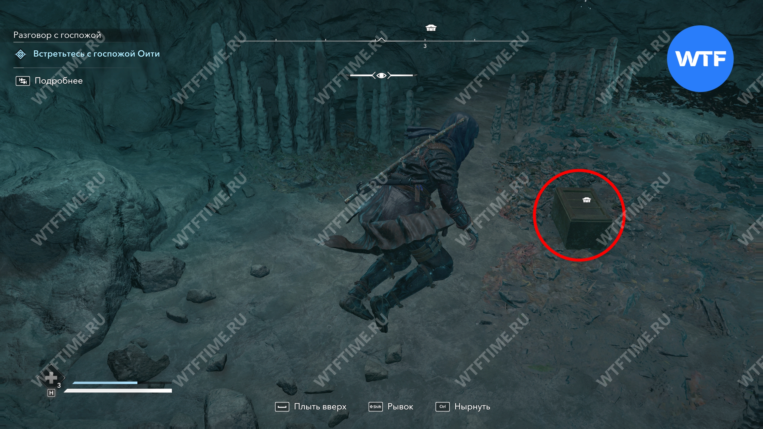 Путь под водой не очень долгий и линейный, но кислорода хватает впритык. Поэтому лучше всплыть наверх, как только это станет возможным, и только потом снова нырнуть за сундуком.