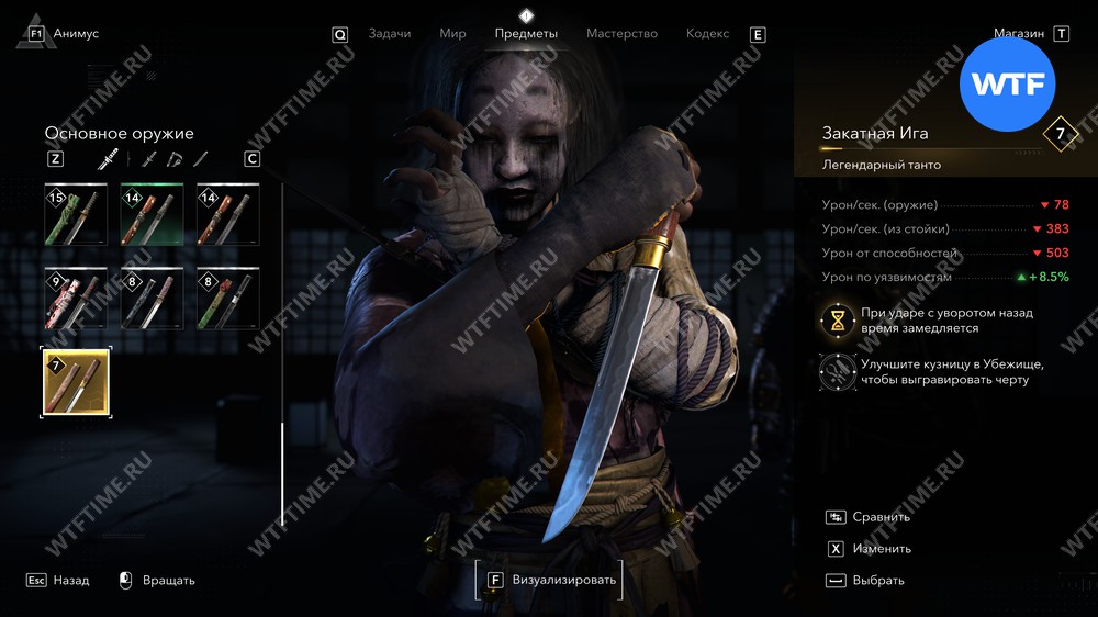 Легендарный танто «Закатная Ига» хорош не столько сам по себе, сколько своей гравировкой, которую вы получаете в комплекте и можете в дальнейшем нанести на другое такое же оружие.