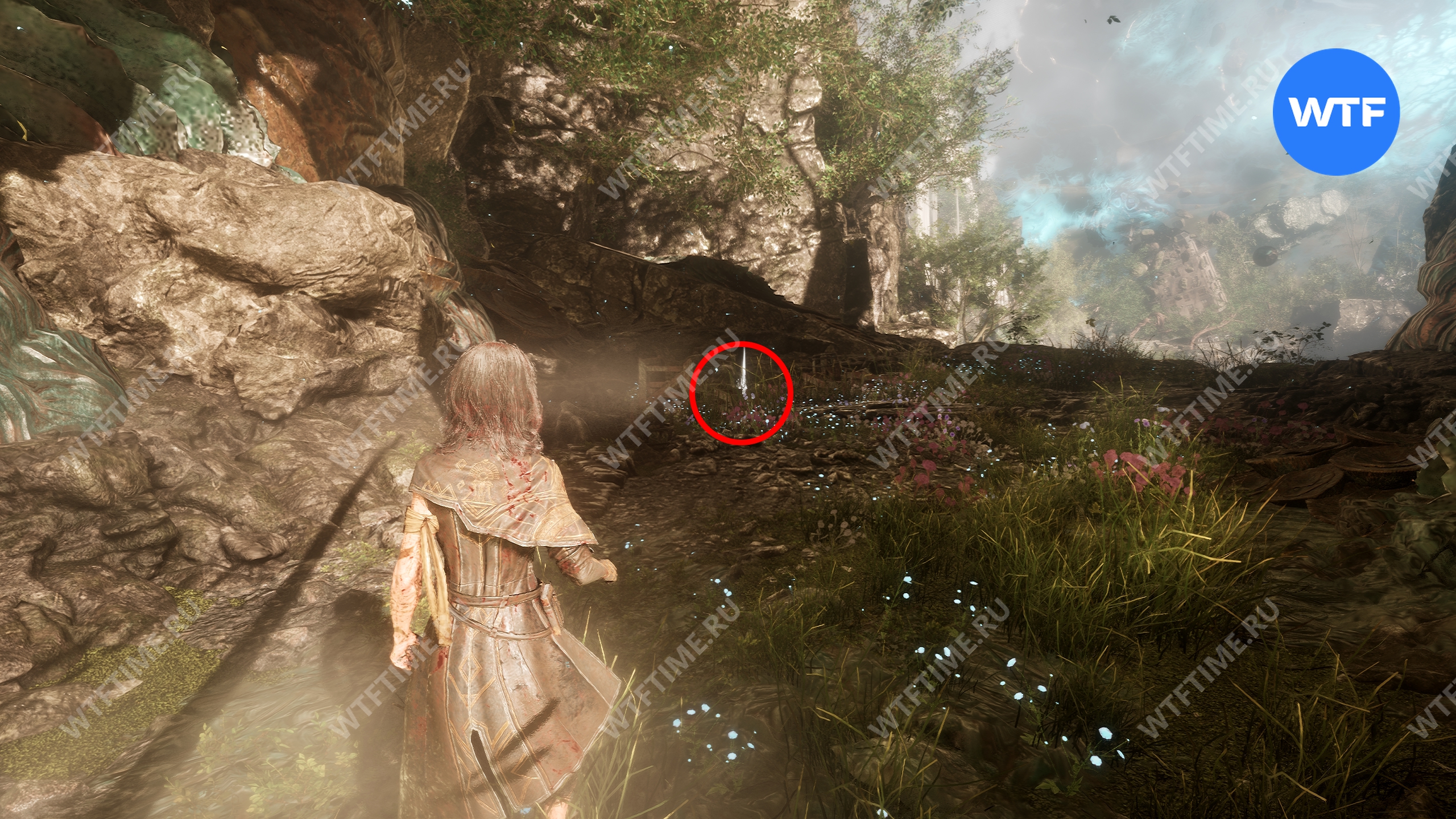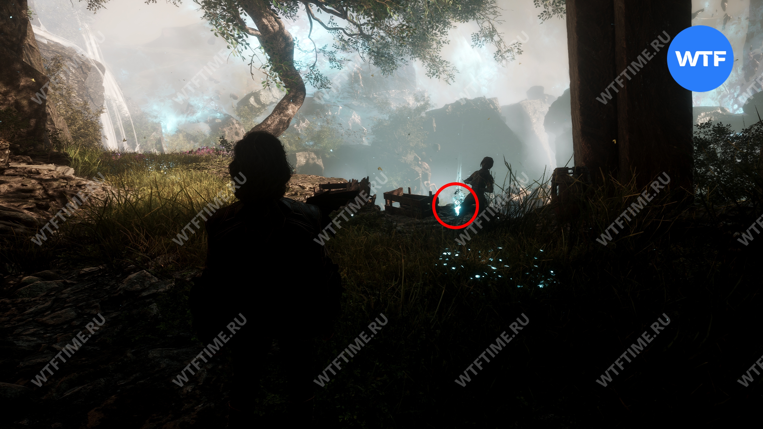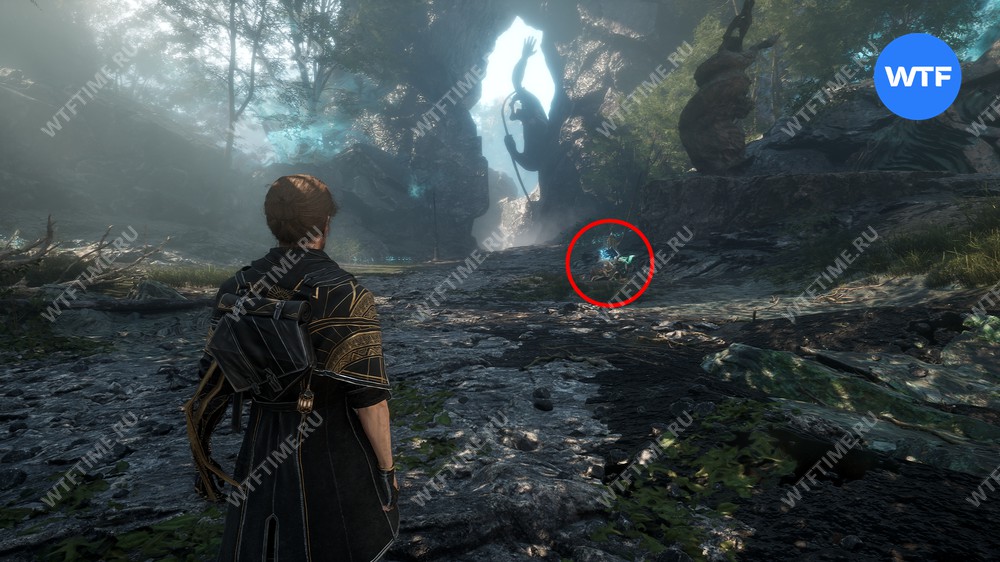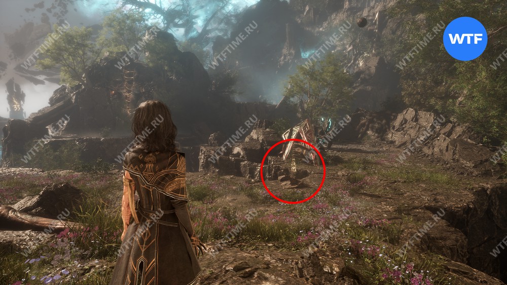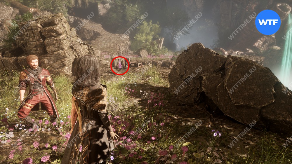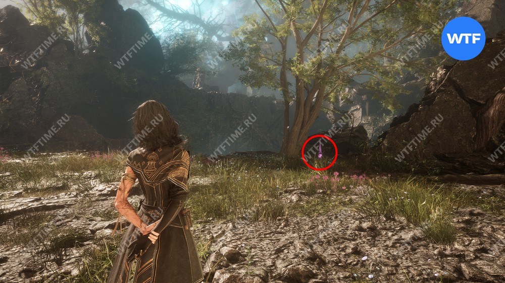 Если пройти по тропинке между скал прямо напротив места, где вы нашли смолу, то в конце пути можно найти осколок тоника возрождения. Это очень полезный предмет, который позволит вам воскрешать павших персонажей.