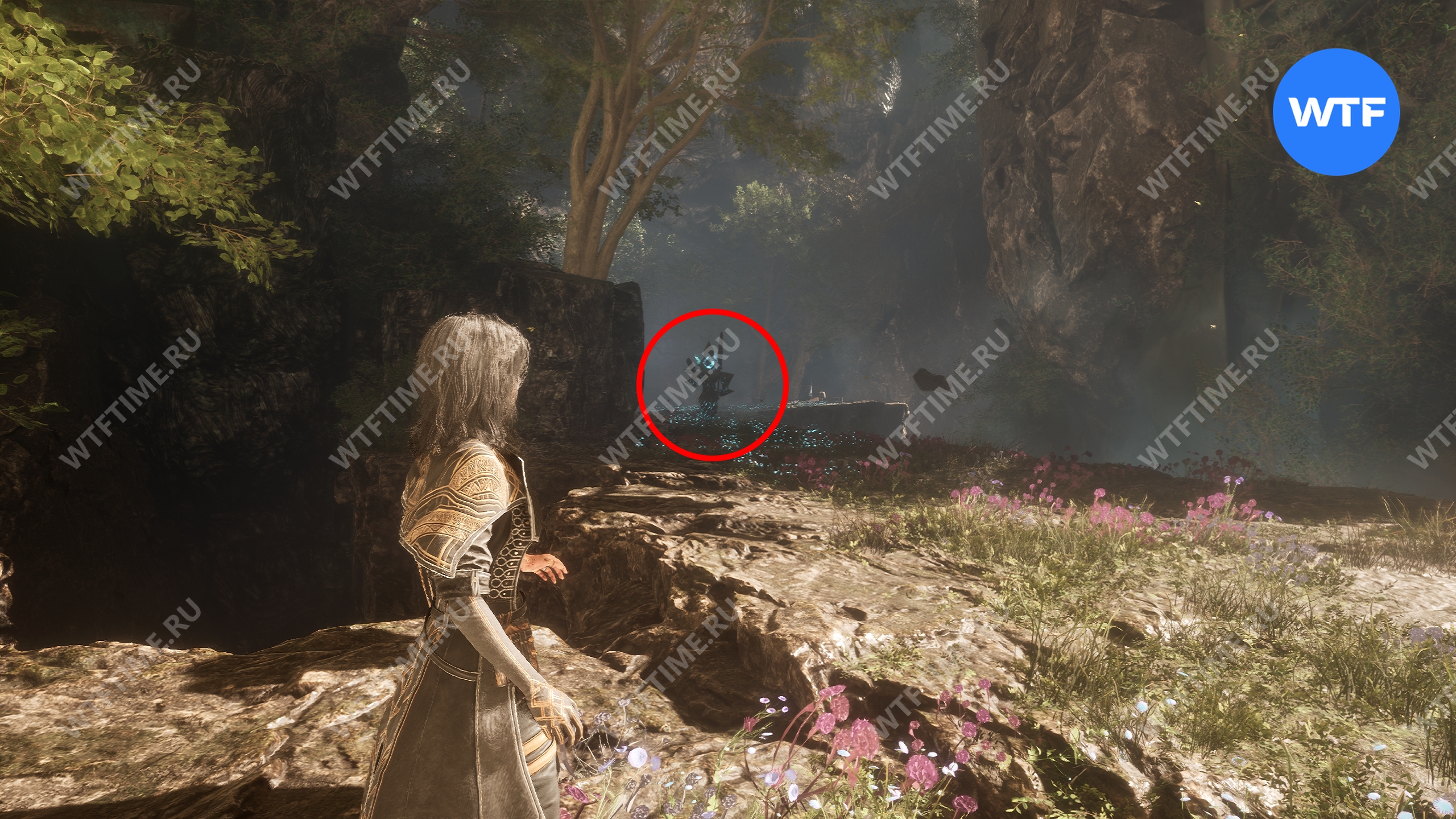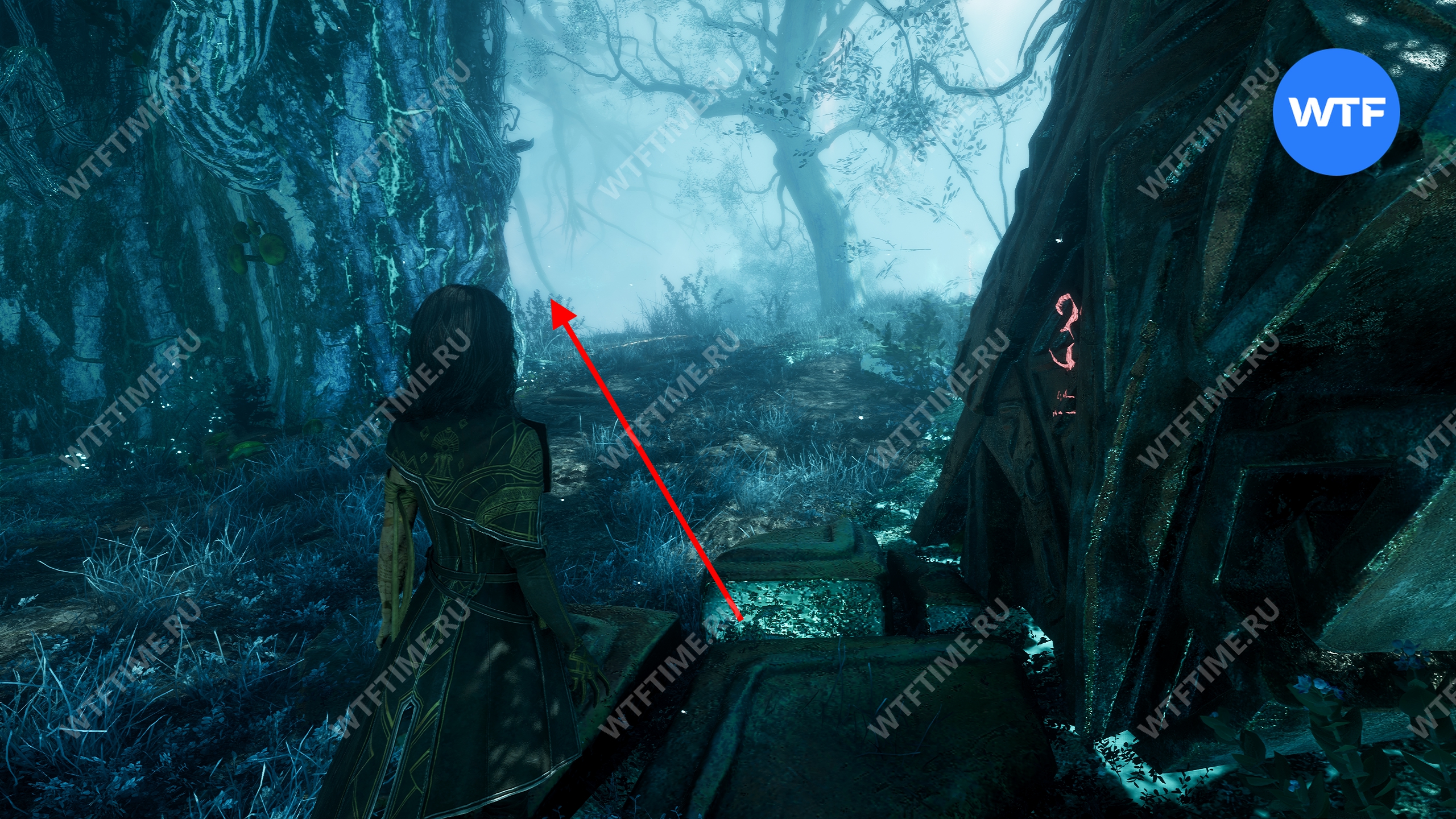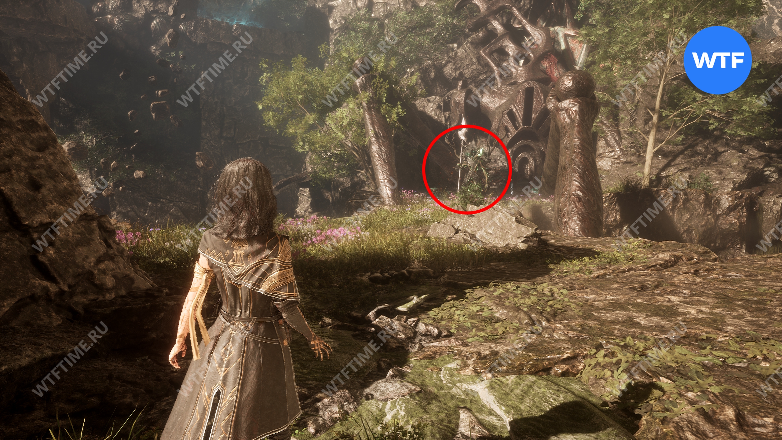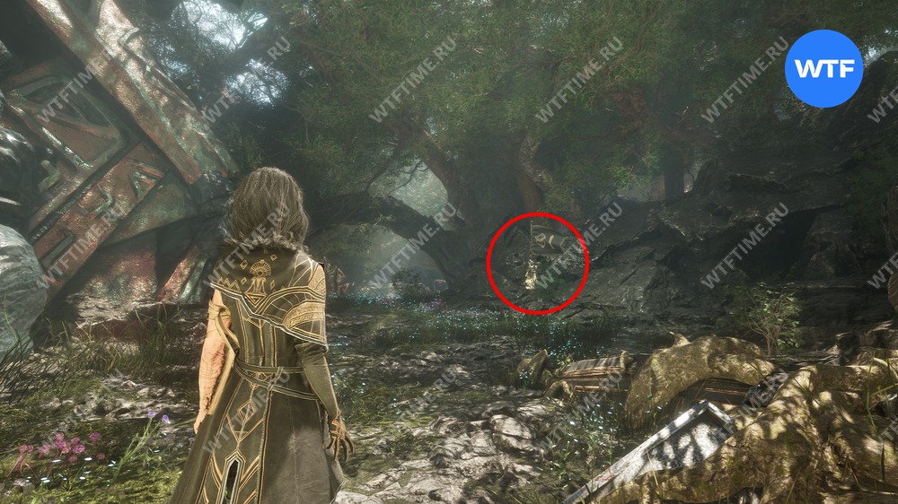 Вернитесь к светящемуся дереву и теперь идите направо. Используйте точку захвата, чтобы перебраться на другую сторону. Затем на развилке идите направо и сразитесь с еще одним отрядом противников с дверье во главе.