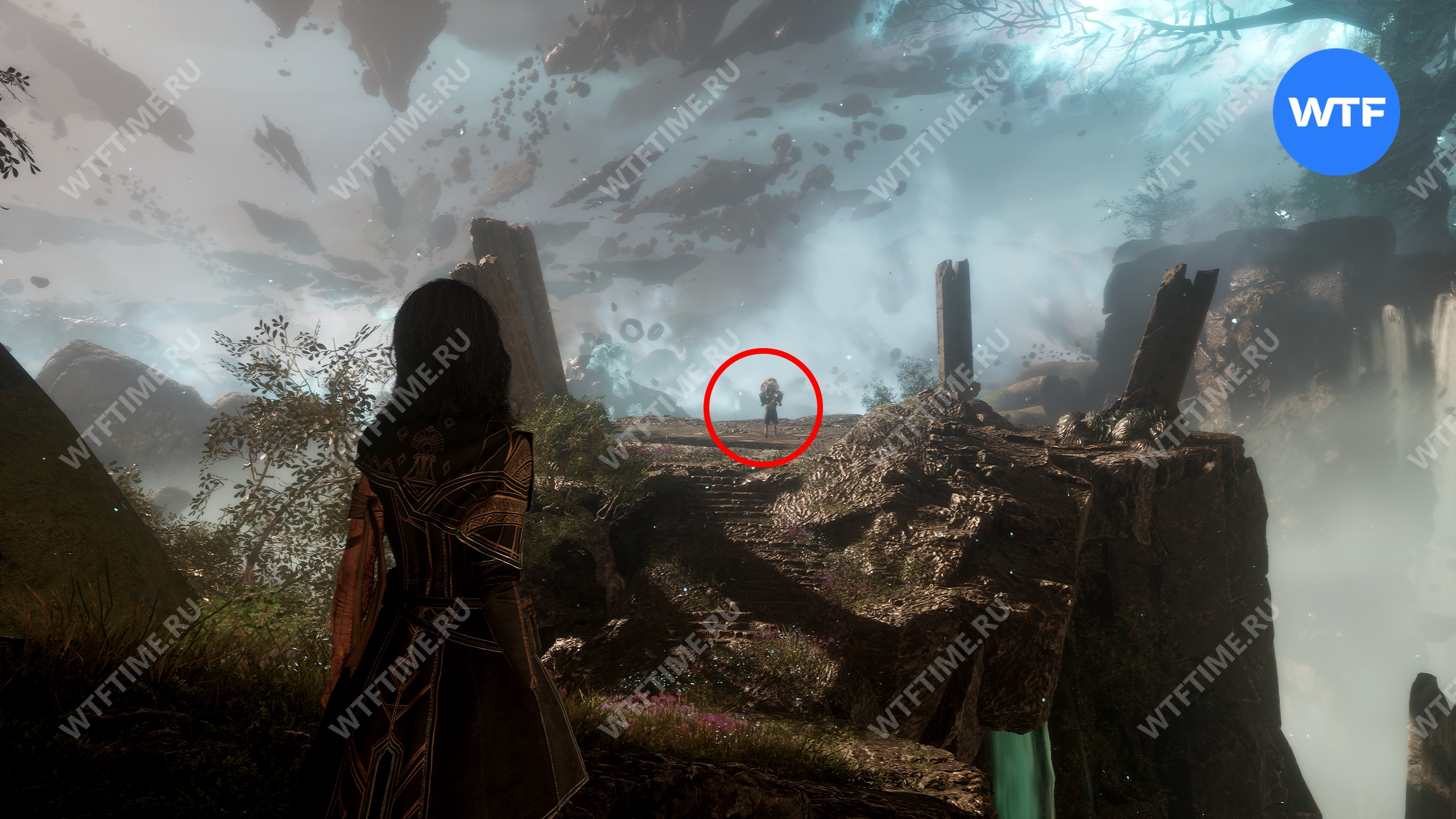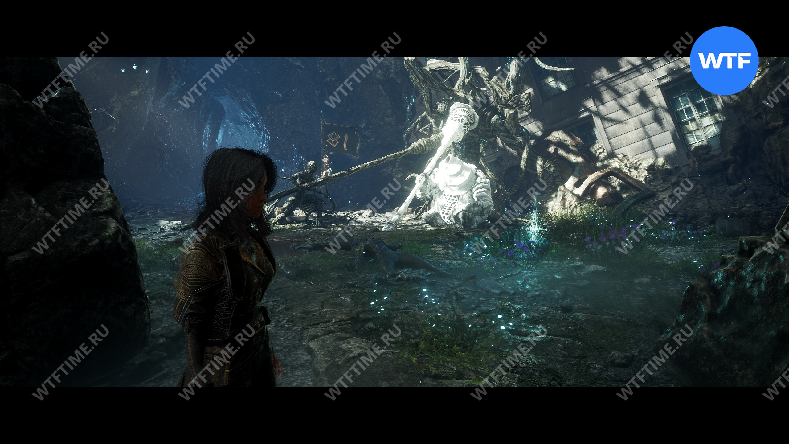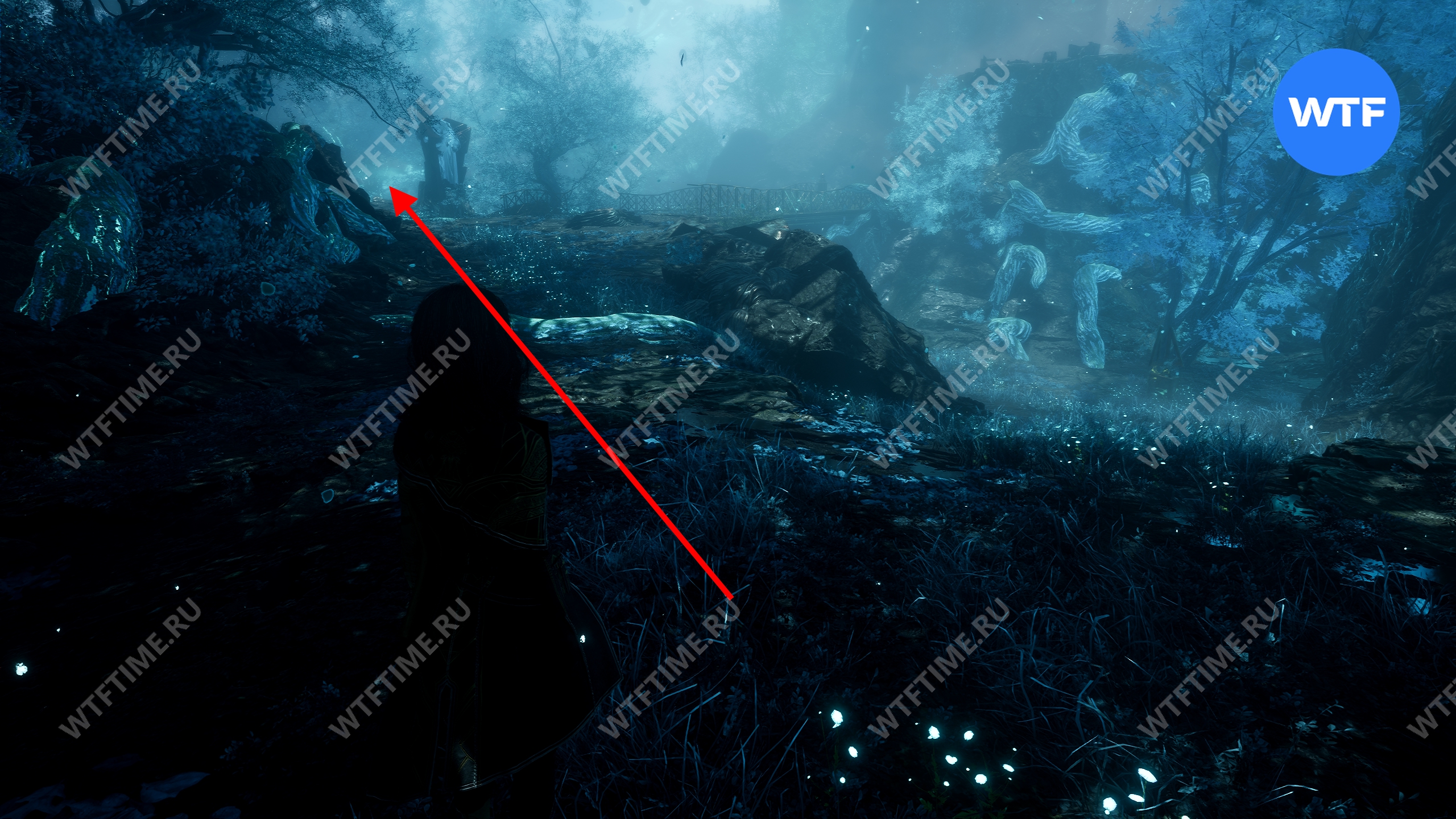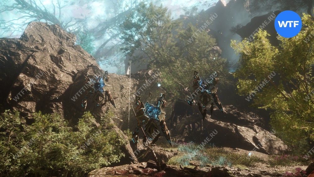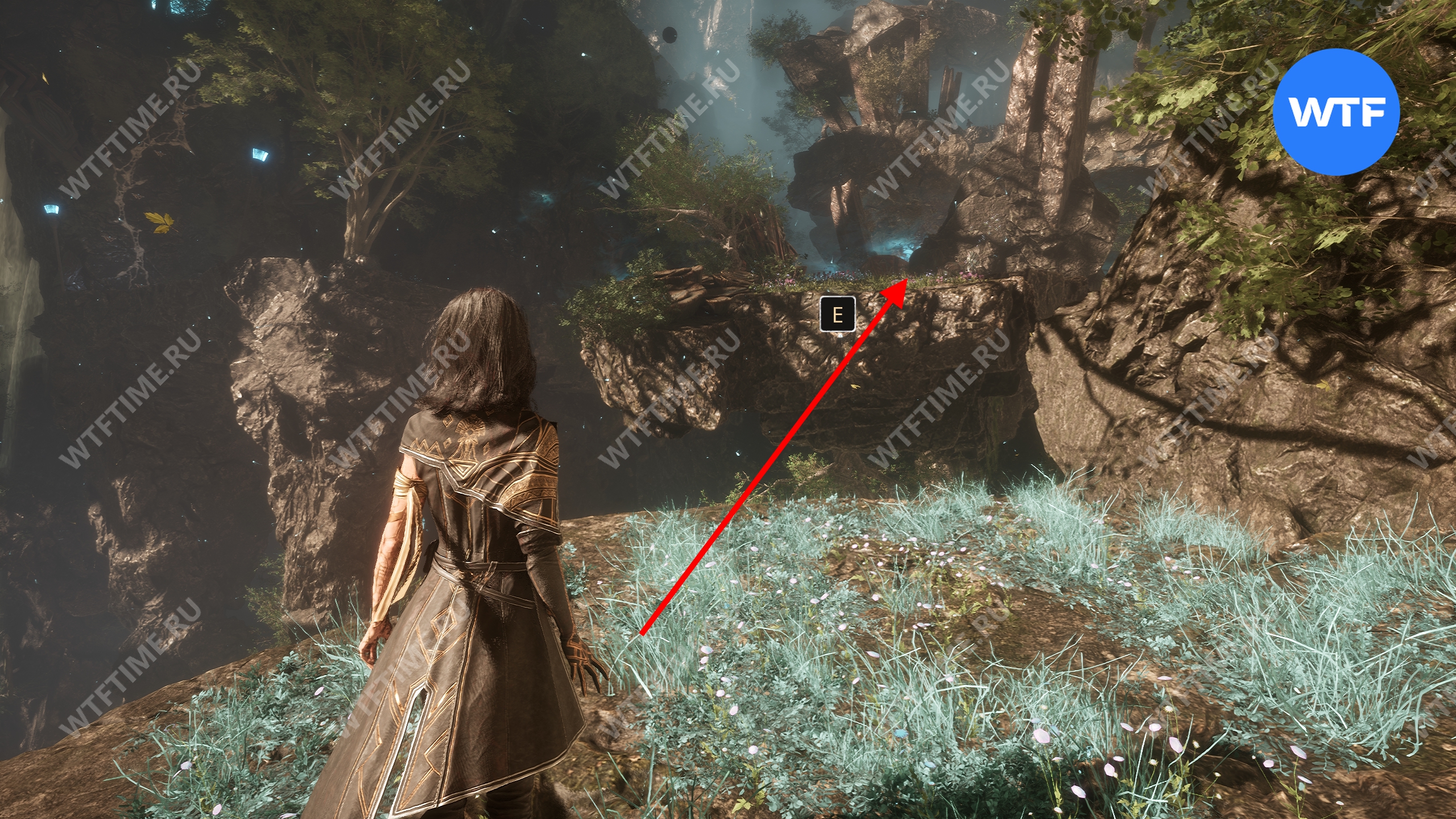 Вернитесь к светящемуся дереву и теперь идите направо. Используйте точку захвата, чтобы перебраться на другую сторону. Затем на развилке идите направо и сразитесь с еще одним отрядом противников с дверье во главе.