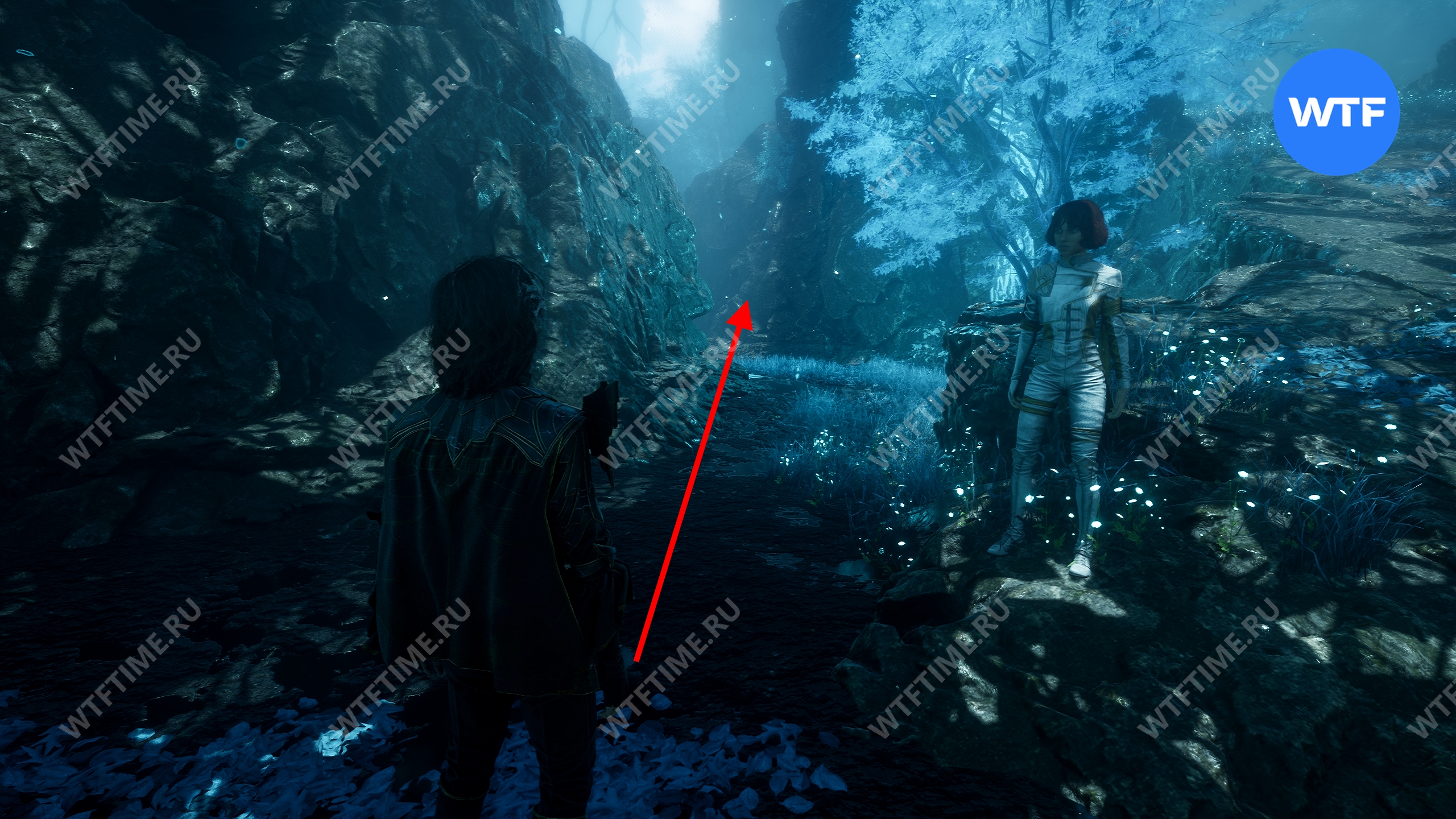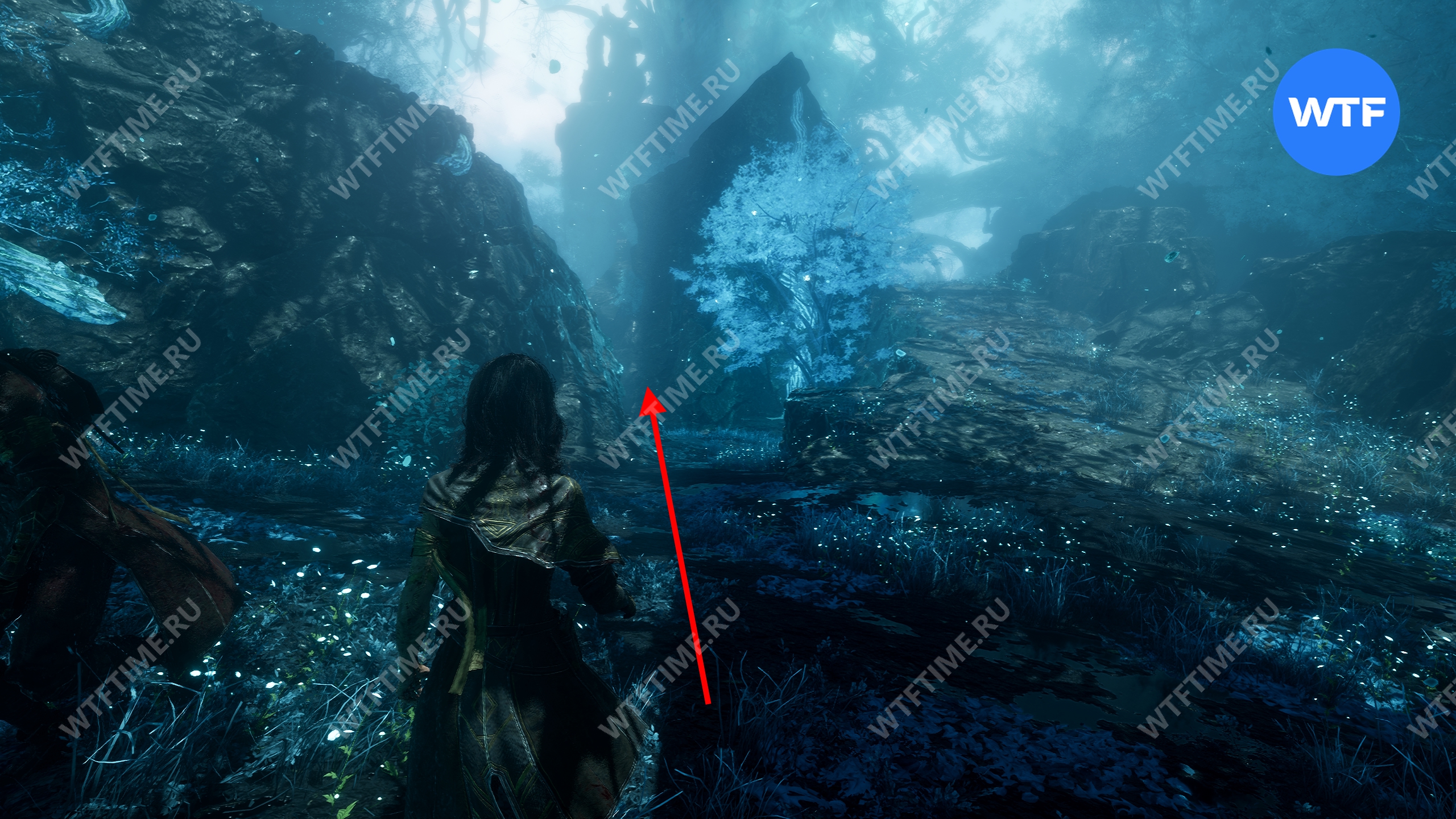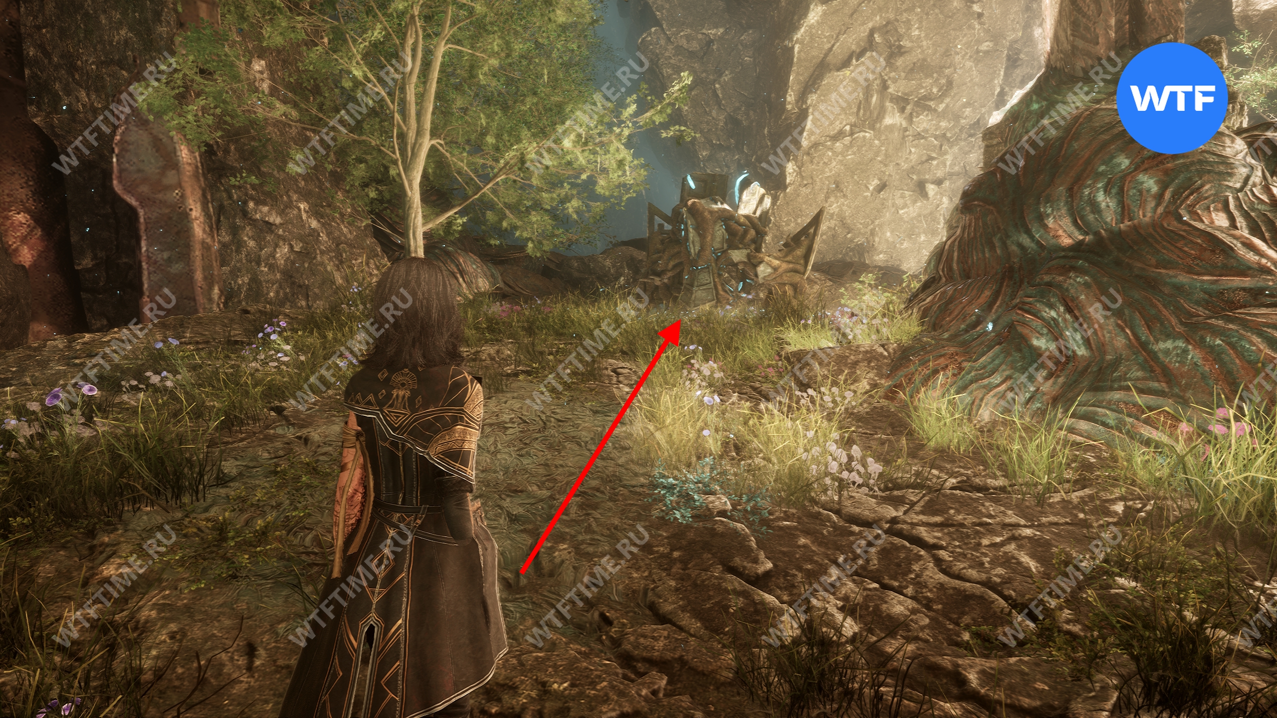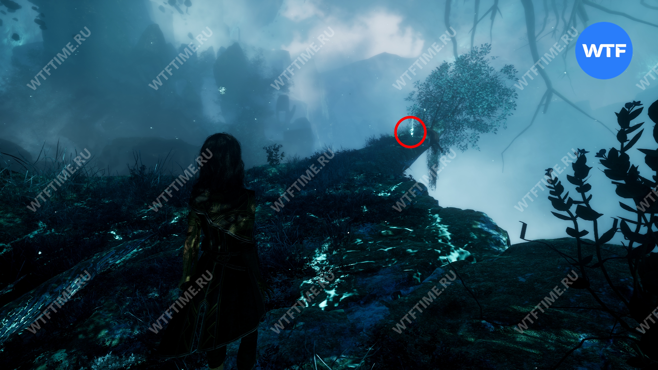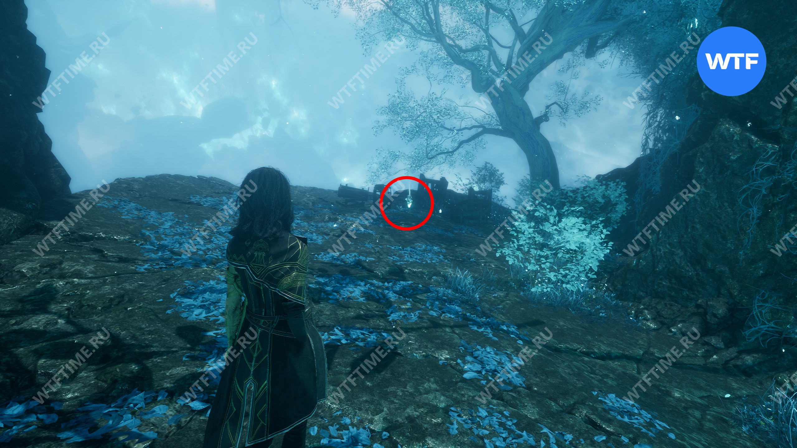 Переместитесь к флагу экспедиции «Индиговое дерево», развернитесь и спуститесь обратно вниз по склону. Затем сразу же поверните направо, в небольшой проход между скал, где растет голубое дерево.