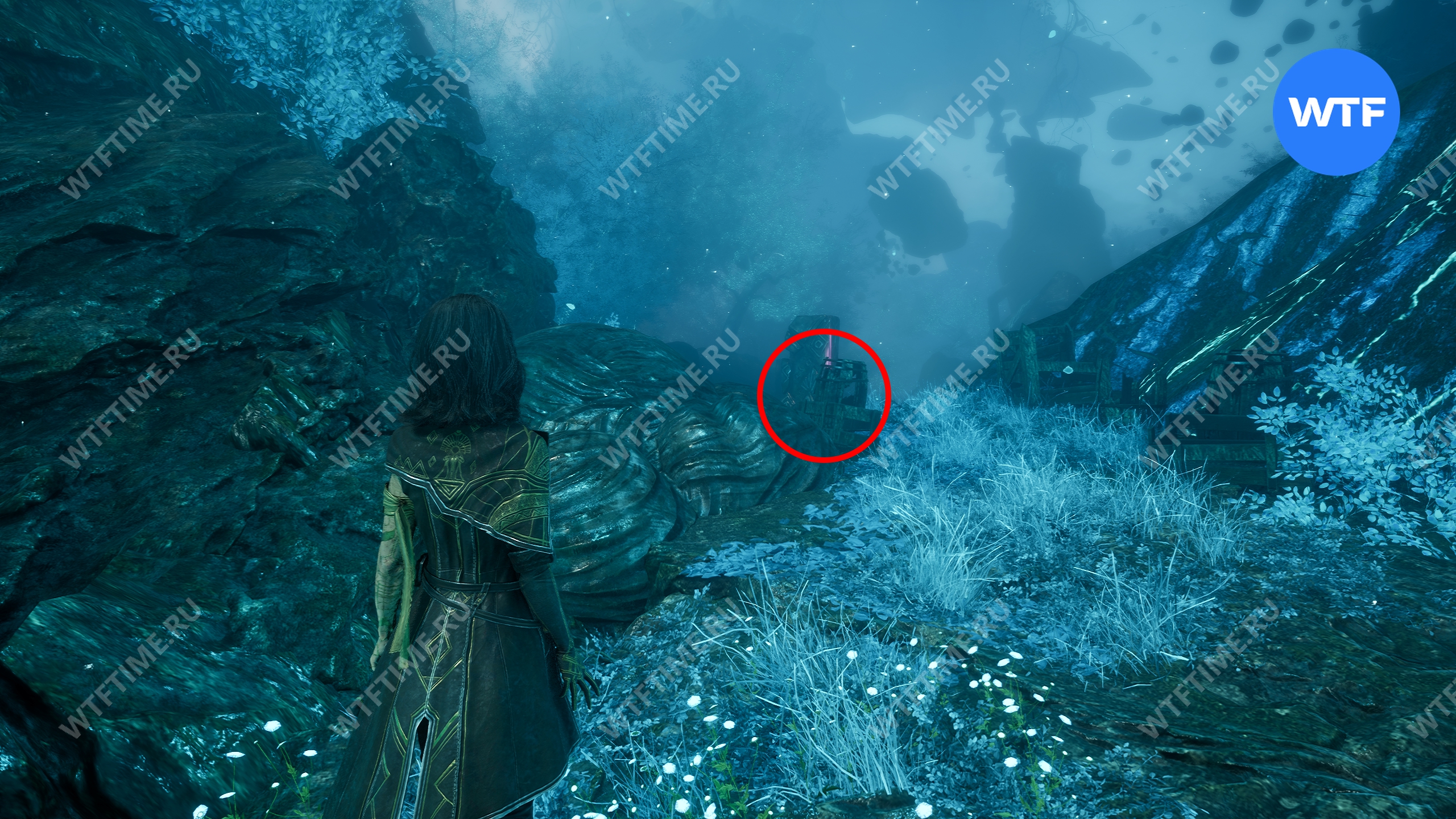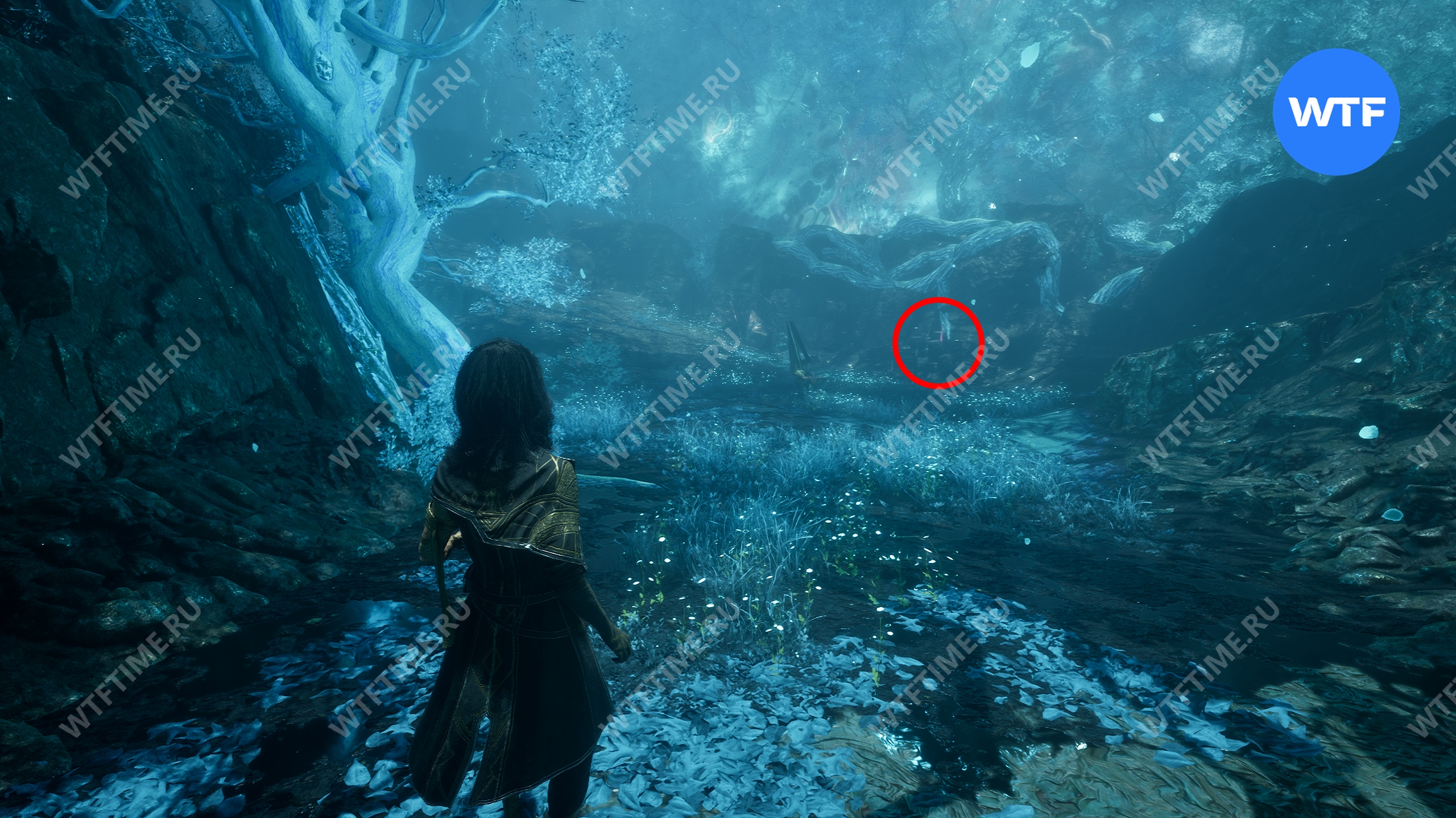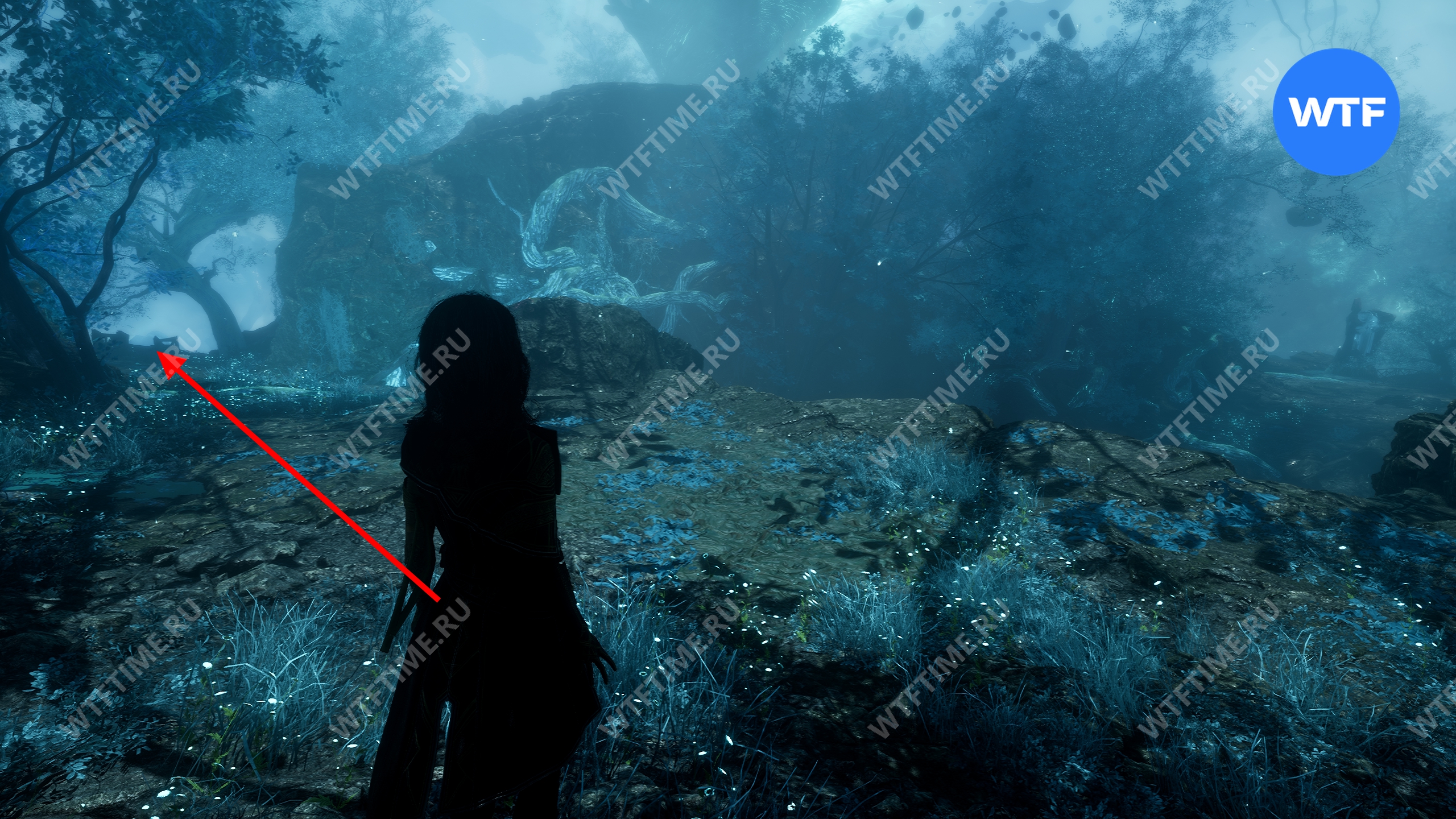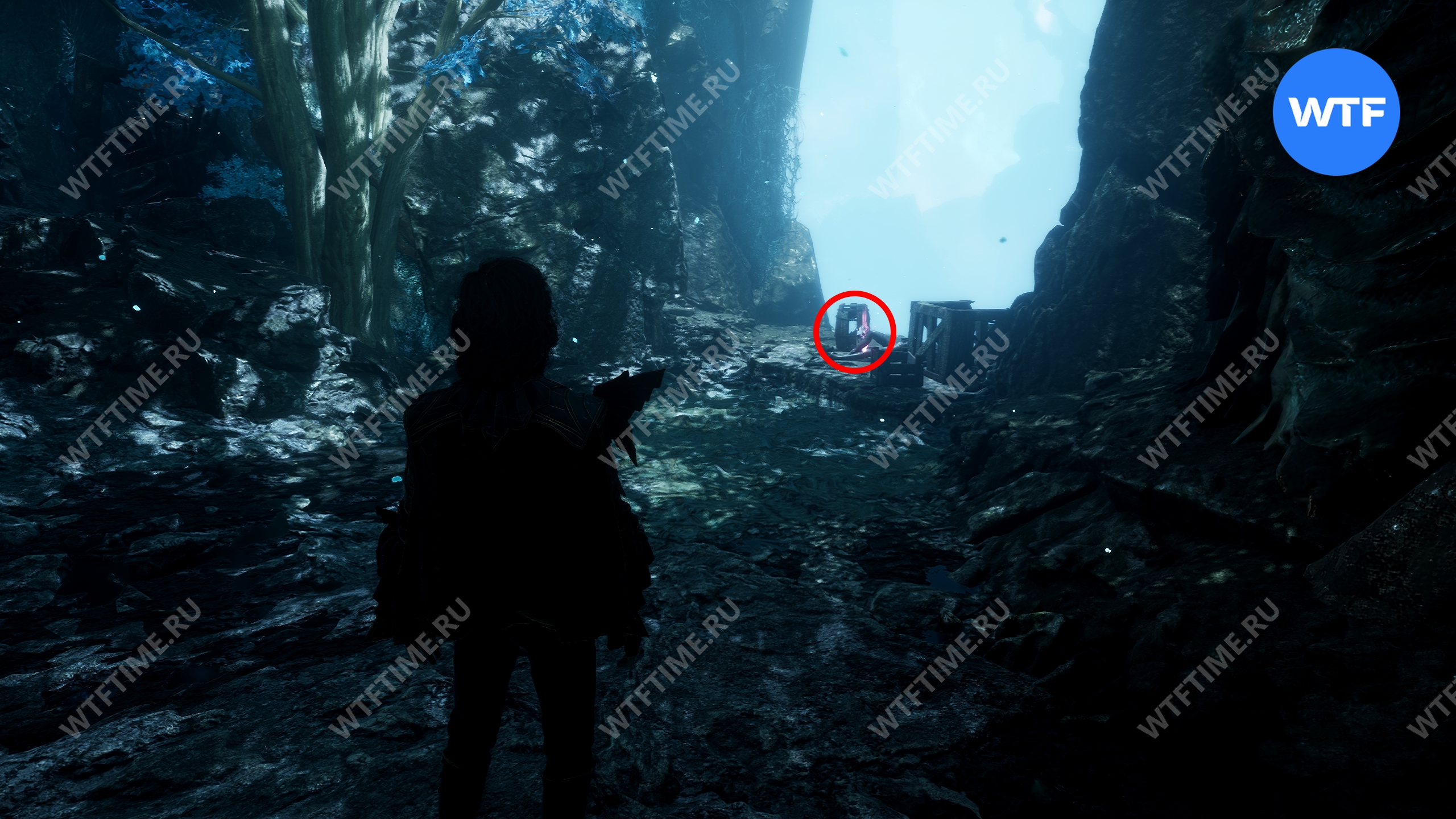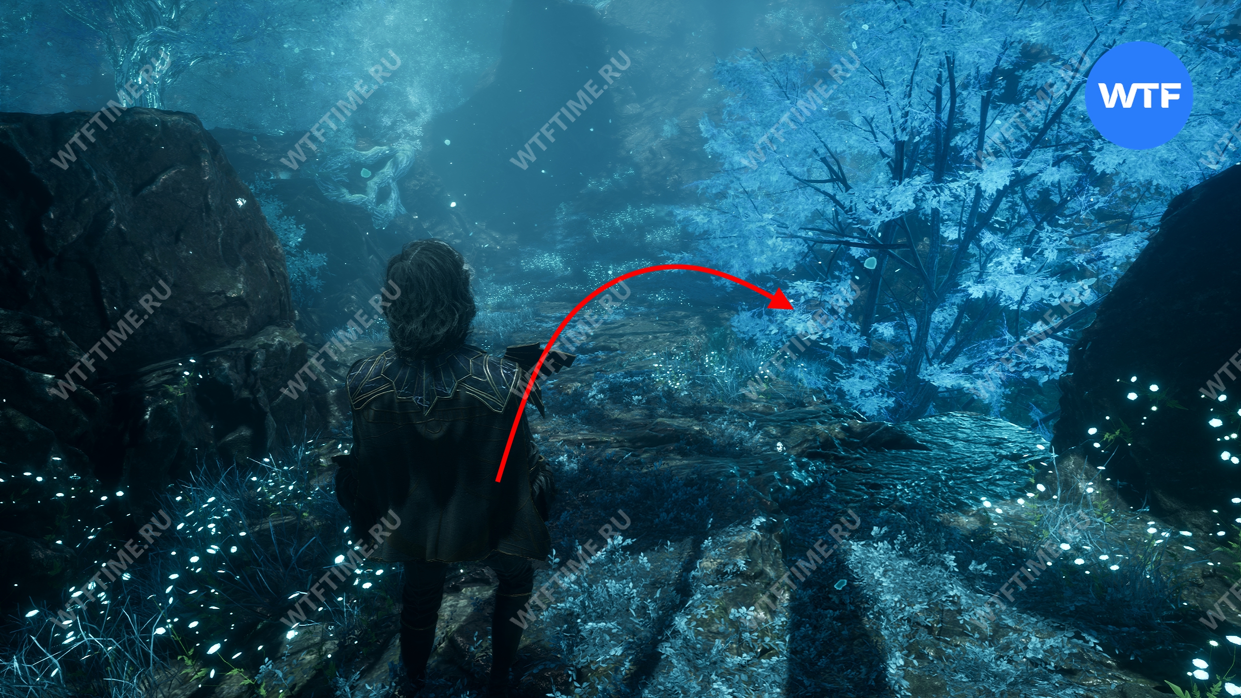 Переместитесь к флагу экспедиции «Индиговое дерево», развернитесь и спуститесь обратно вниз по склону. Затем сразу же поверните направо, в небольшой проход между скал, где растет голубое дерево.