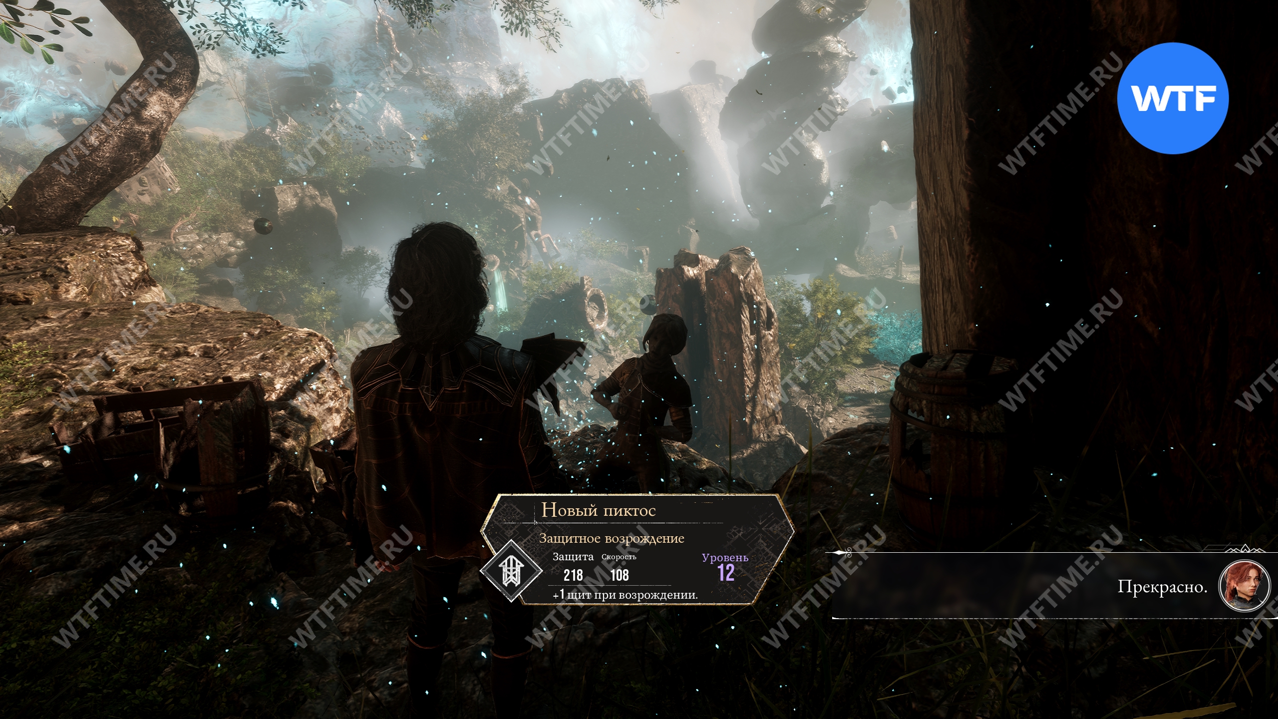 Затем воспользуйтесь точкой захвата, чтобы перебраться через пропасть. Пройдите немного вперед и возле кучи ящиков у обрыва справа увидите новый пиктос «Защитное возрождение» (уровень 12, защита 218, скорость 108), дающий 1 щит при возрождении.
