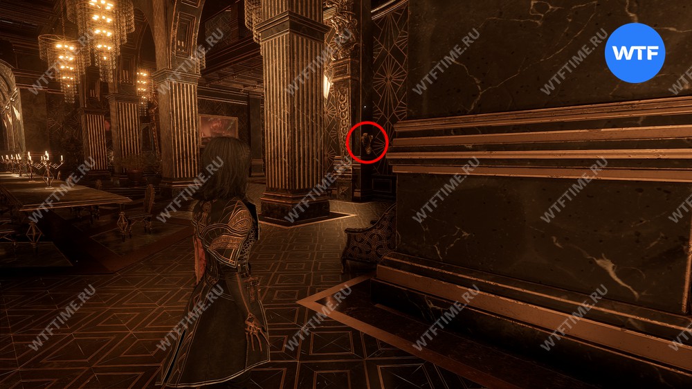 Поднимитесь в обеденный зал по главной лестнице и от входа посмотрите направо. На стене за колонной вы найдете первый рычаг, на которой нужно нажать.