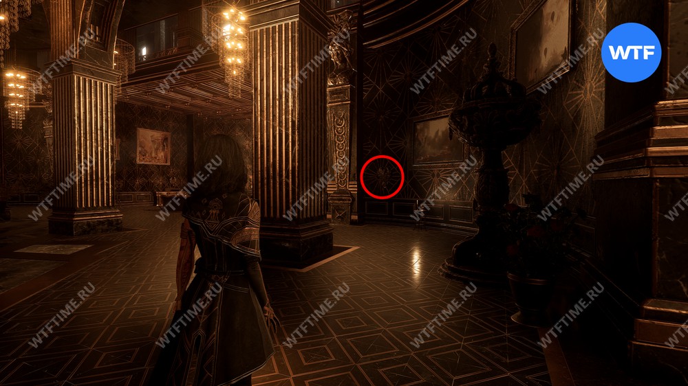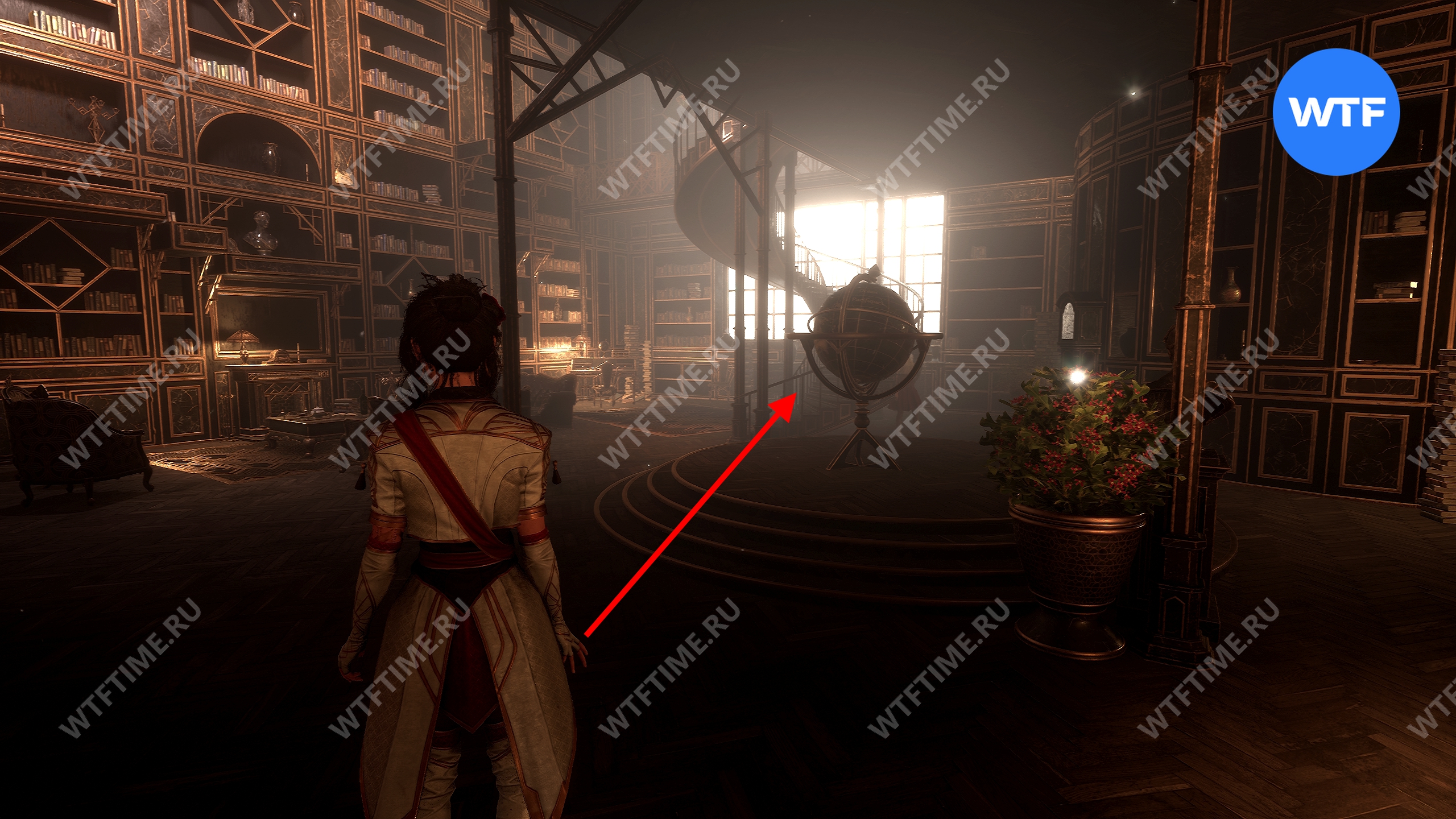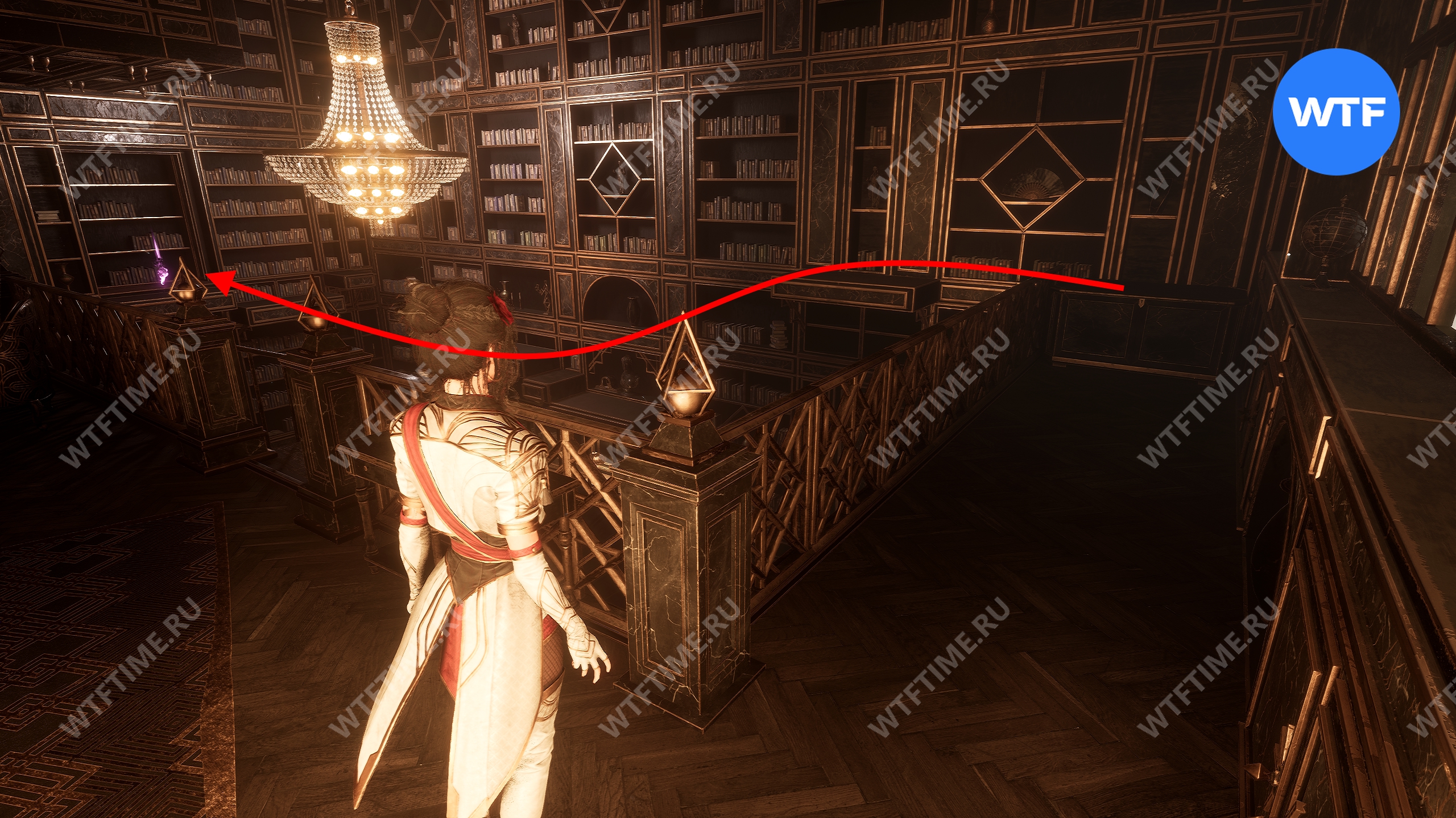 Эта дверь перенесет вас в библиотеку. Поднимитесь по винтовой лестнице на второй этаж, а затем развернитесь. У стены вы увидите небольшую тумбу, на которую можно залезть.