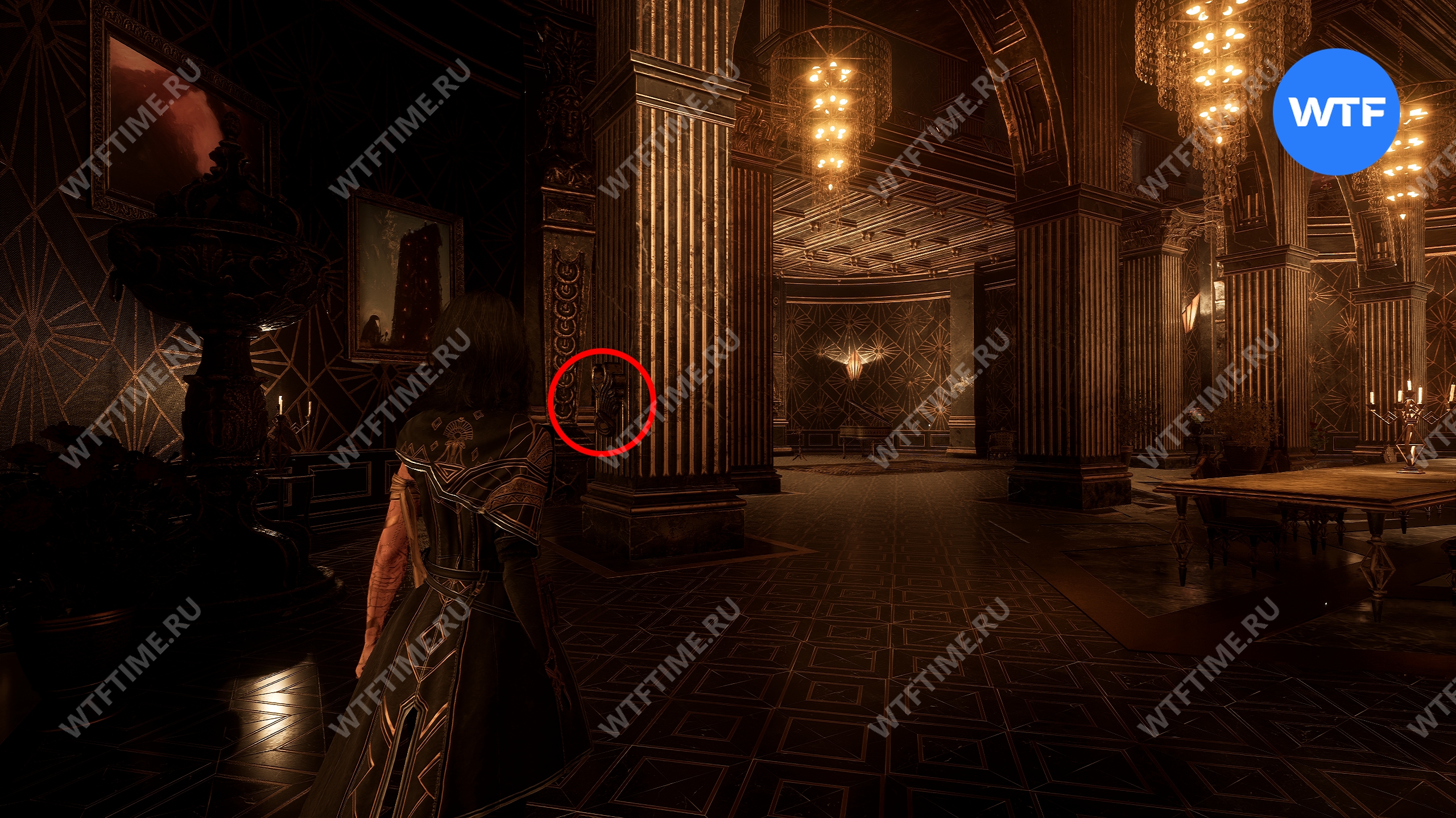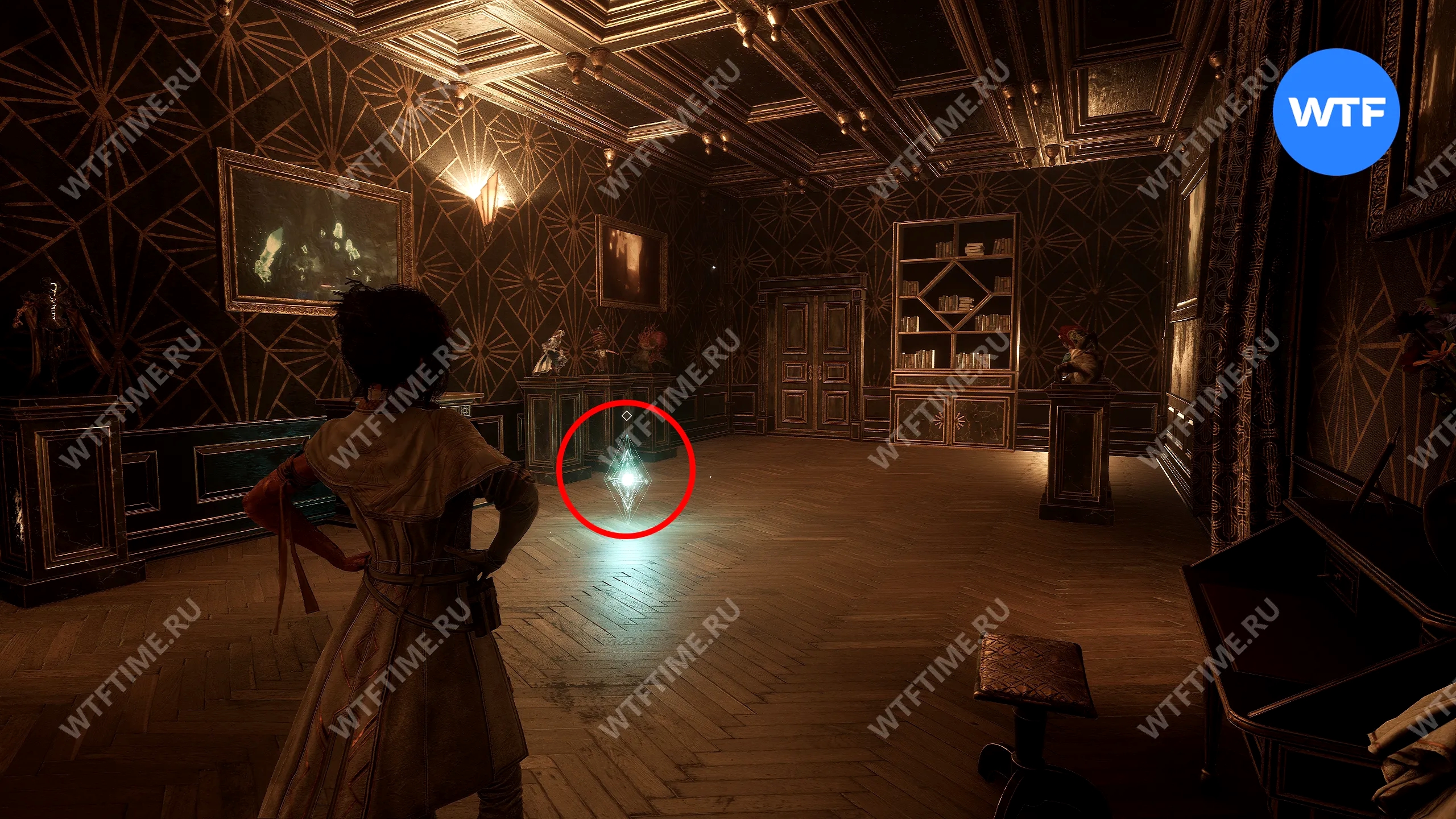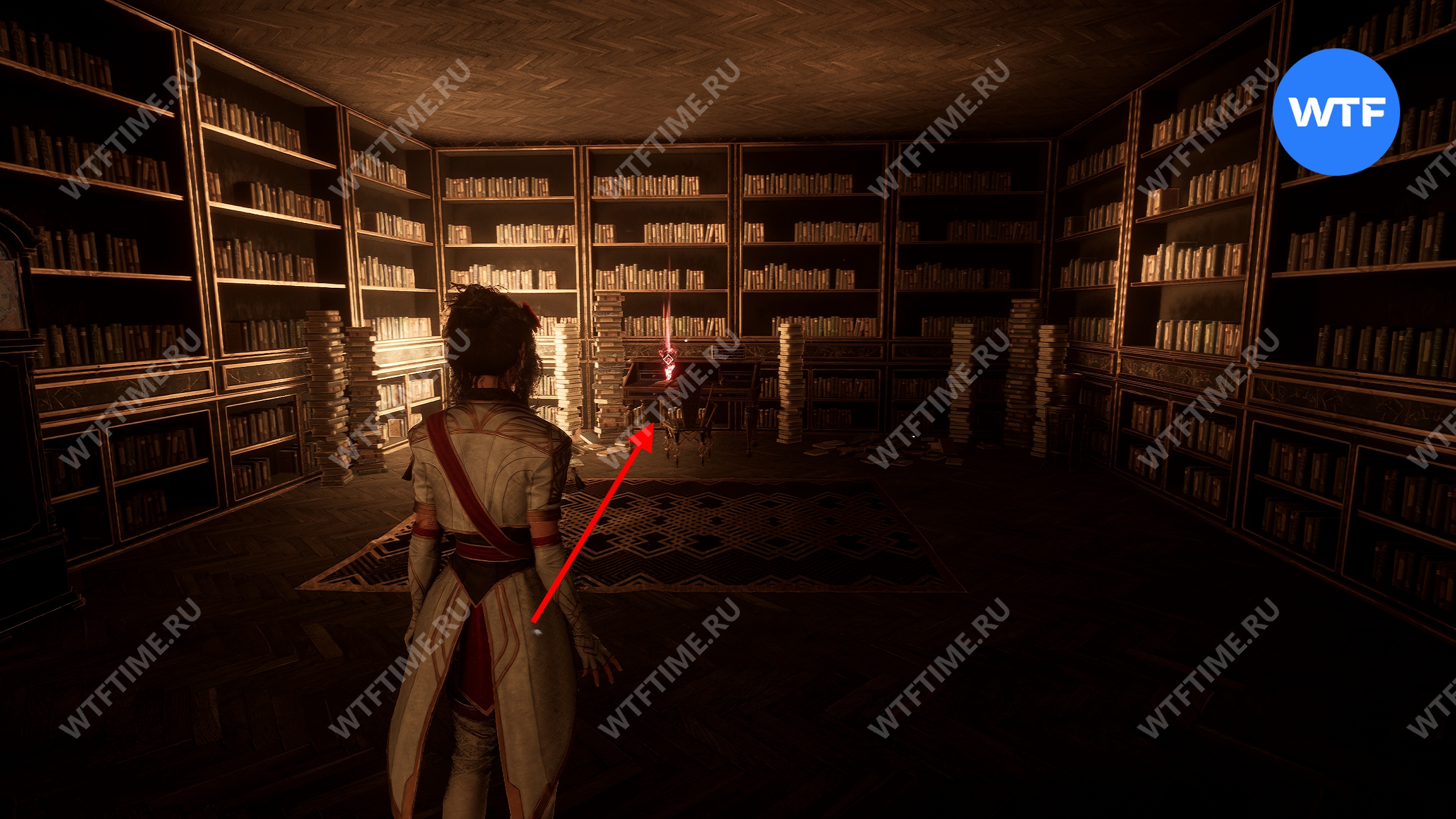Эта дверь перенесет вас в библиотеку. Поднимитесь по винтовой лестнице на второй этаж, а затем развернитесь. У стены вы увидите небольшую тумбу, на которую можно залезть.