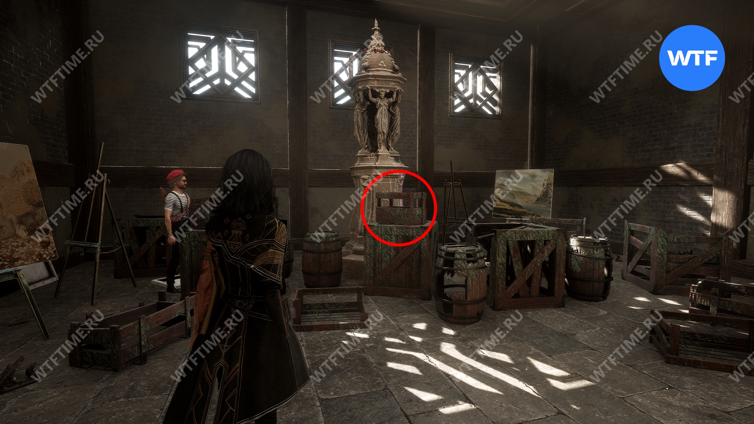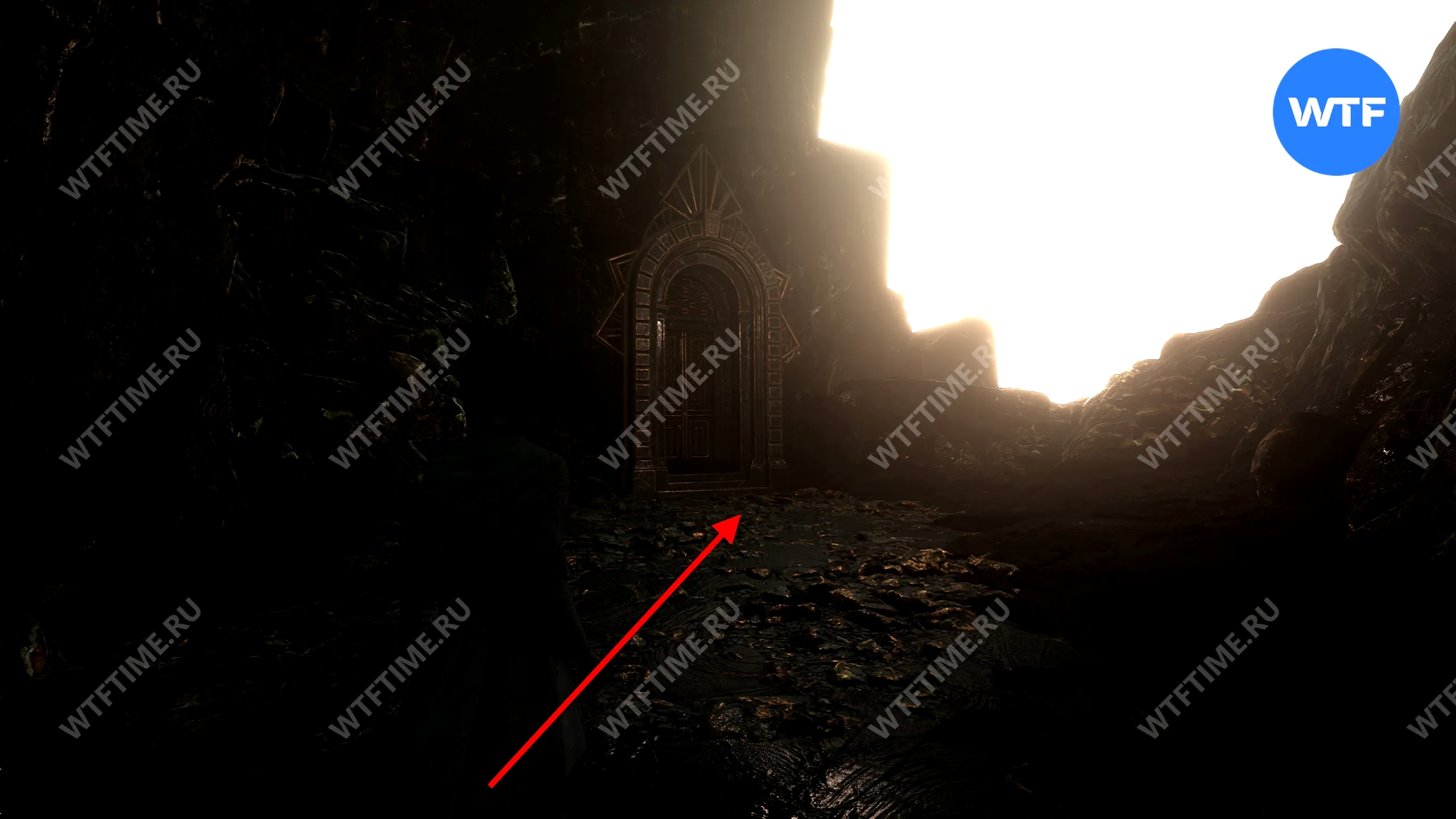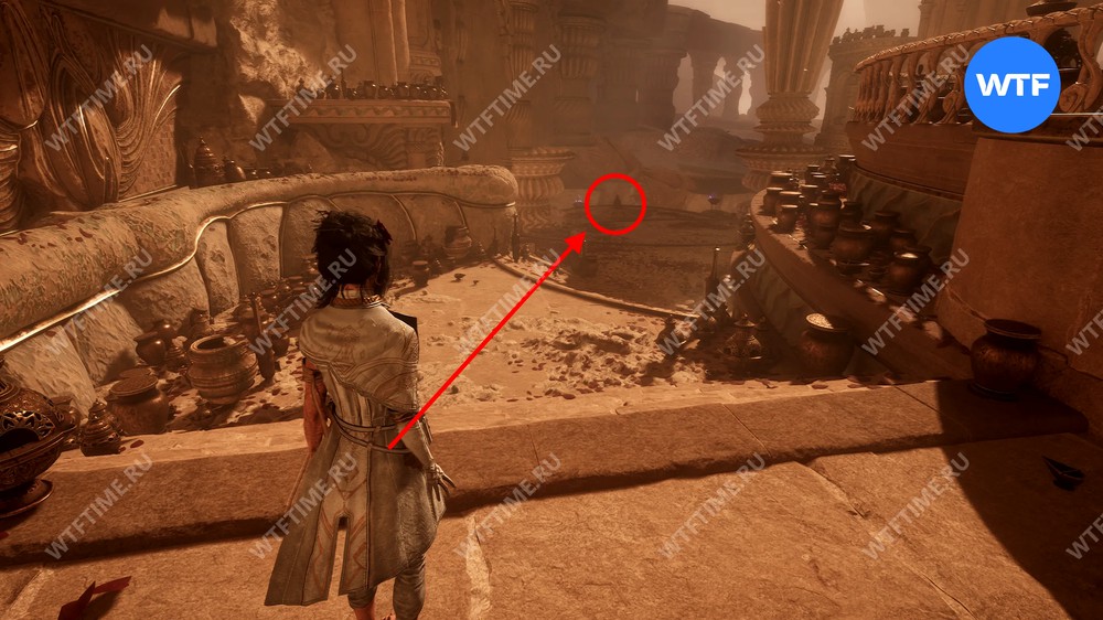 - Сломанную статую справа от входа;