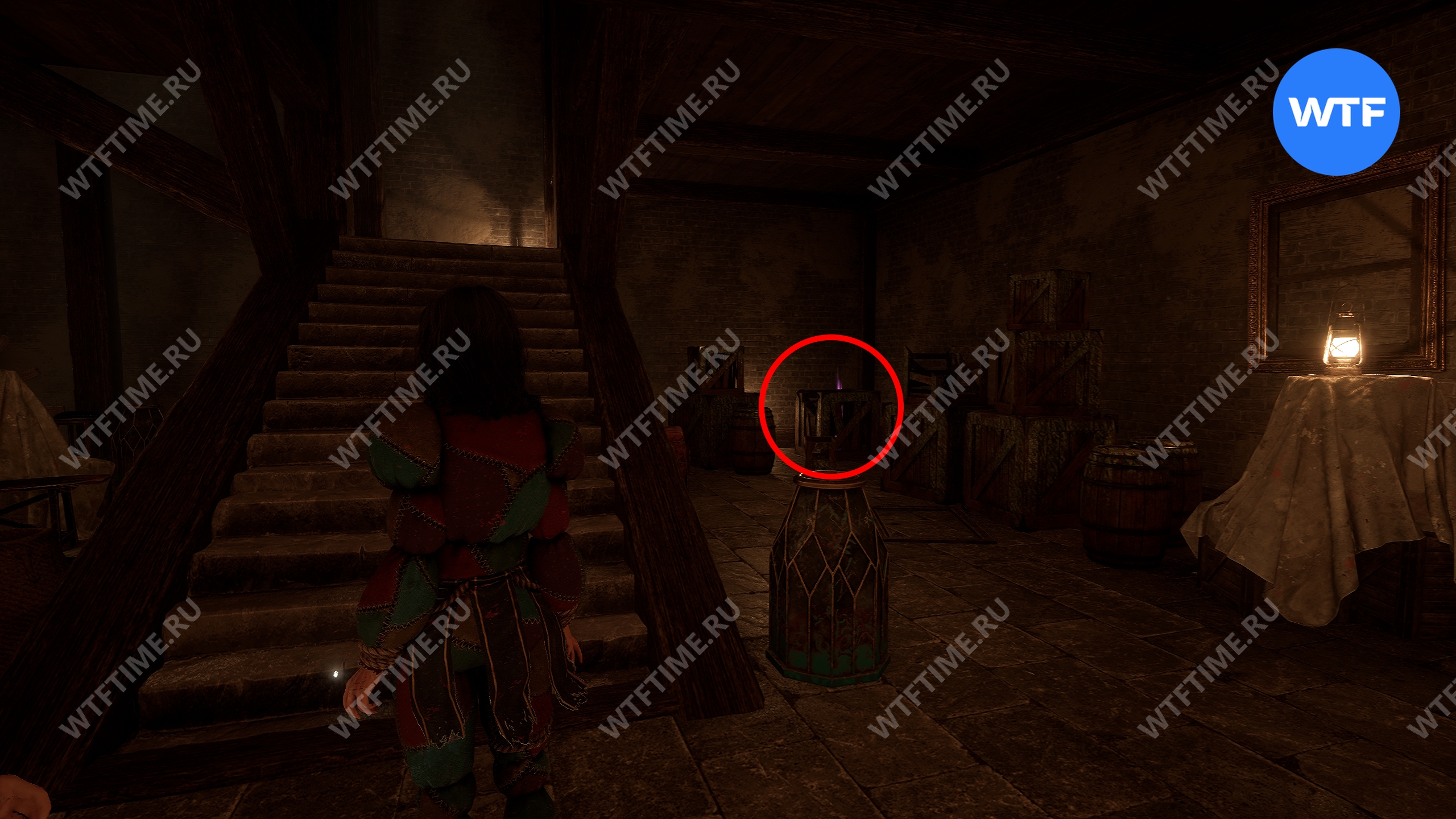 После этого в ближнем левом углу комнаты откроется люк в полу. Чтобы до него добраться, нужно разломать несколько деревянных бочек и ящиков.