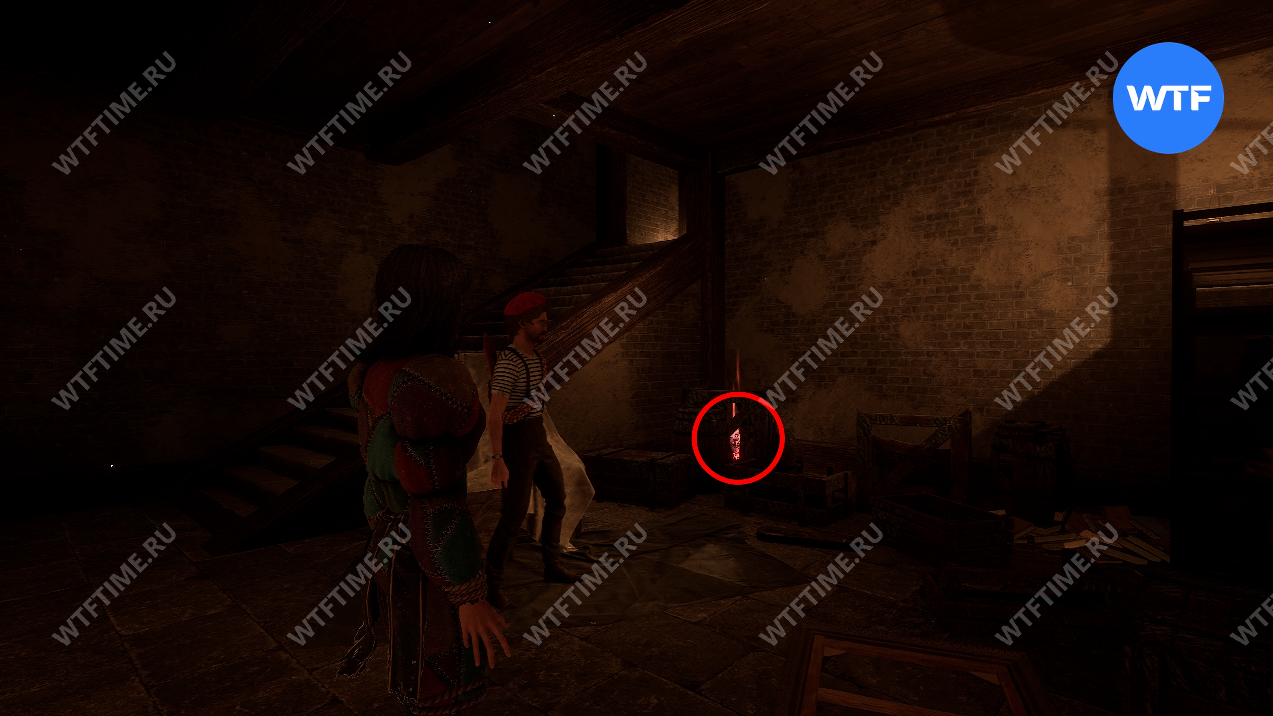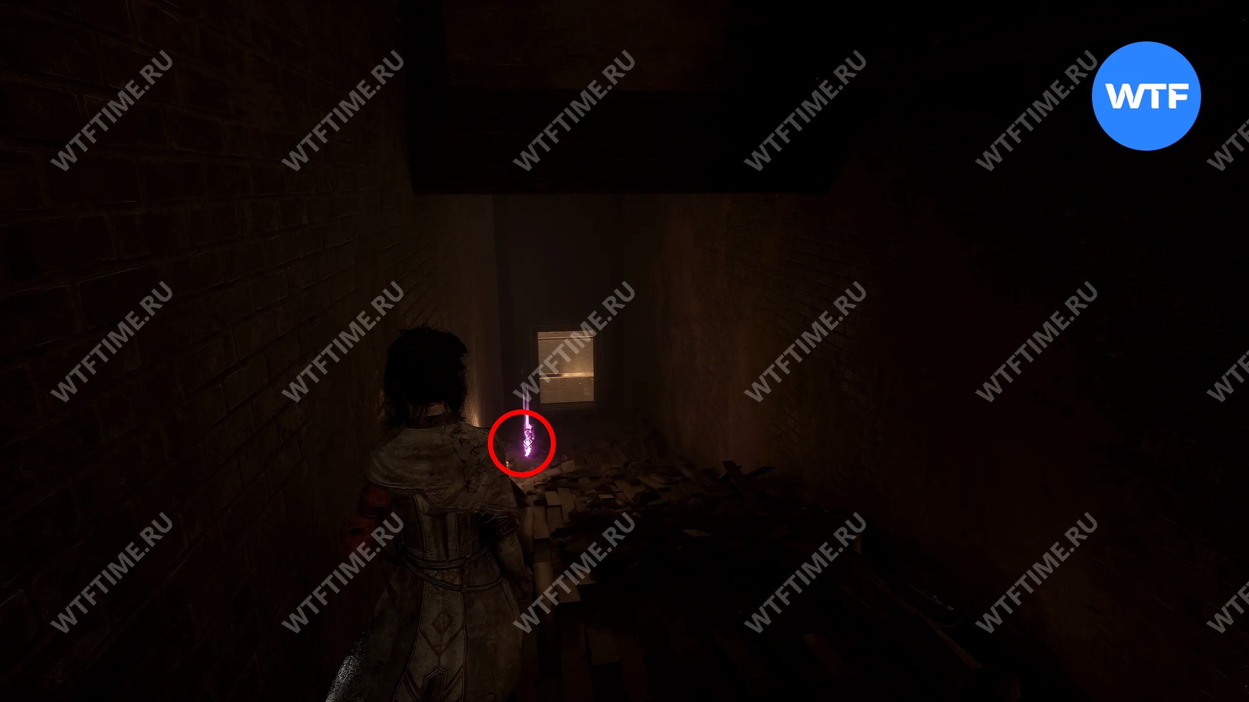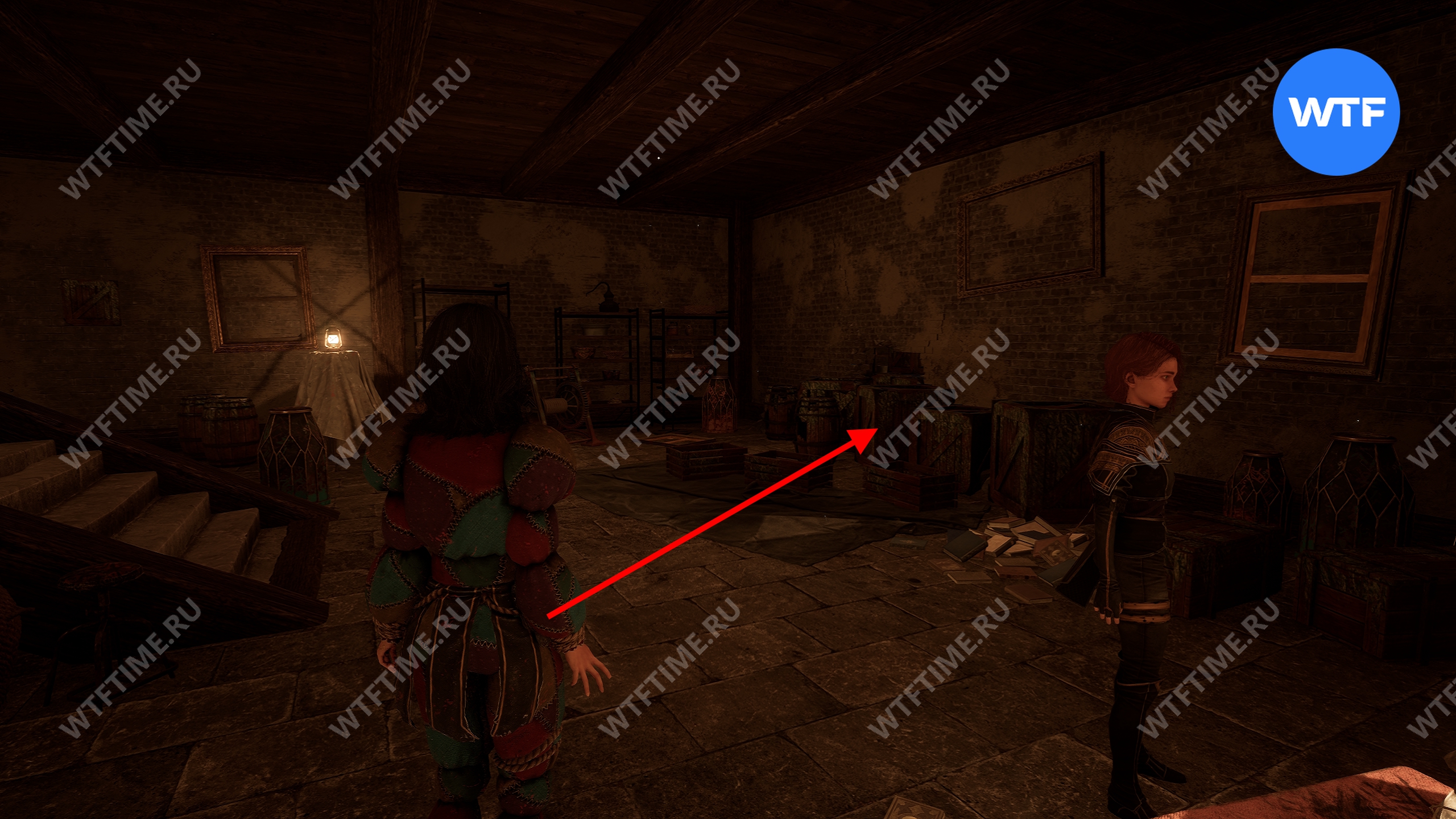 В этой же комнате напротив лестницы свалены деревянные бочки и ящики. Сломайте их, чтобы найти небольшой лаз в стене. Пройдите через него и подберите предмет, лежащий под лестницей в следующей комнате — это стрижка для Маэль «Бунтарка».