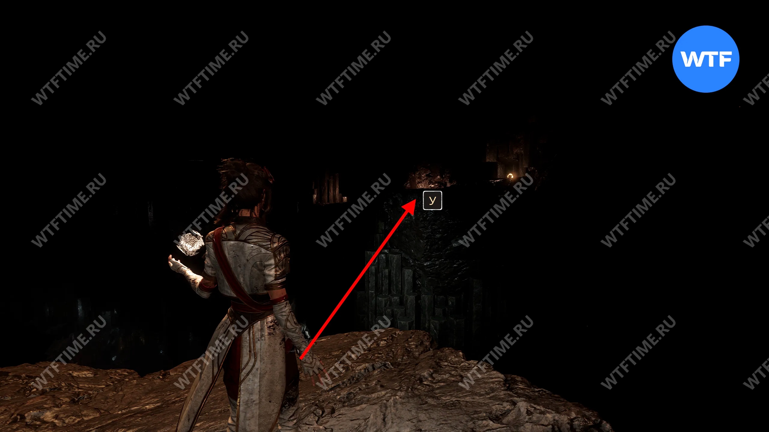 От флага идите вперед, переберитесь через пропасть, а затем продолжайте идти по дорожке с фонарями, пока не окажетесь возле веревки, ведущей в нижнюю часть пещеры.